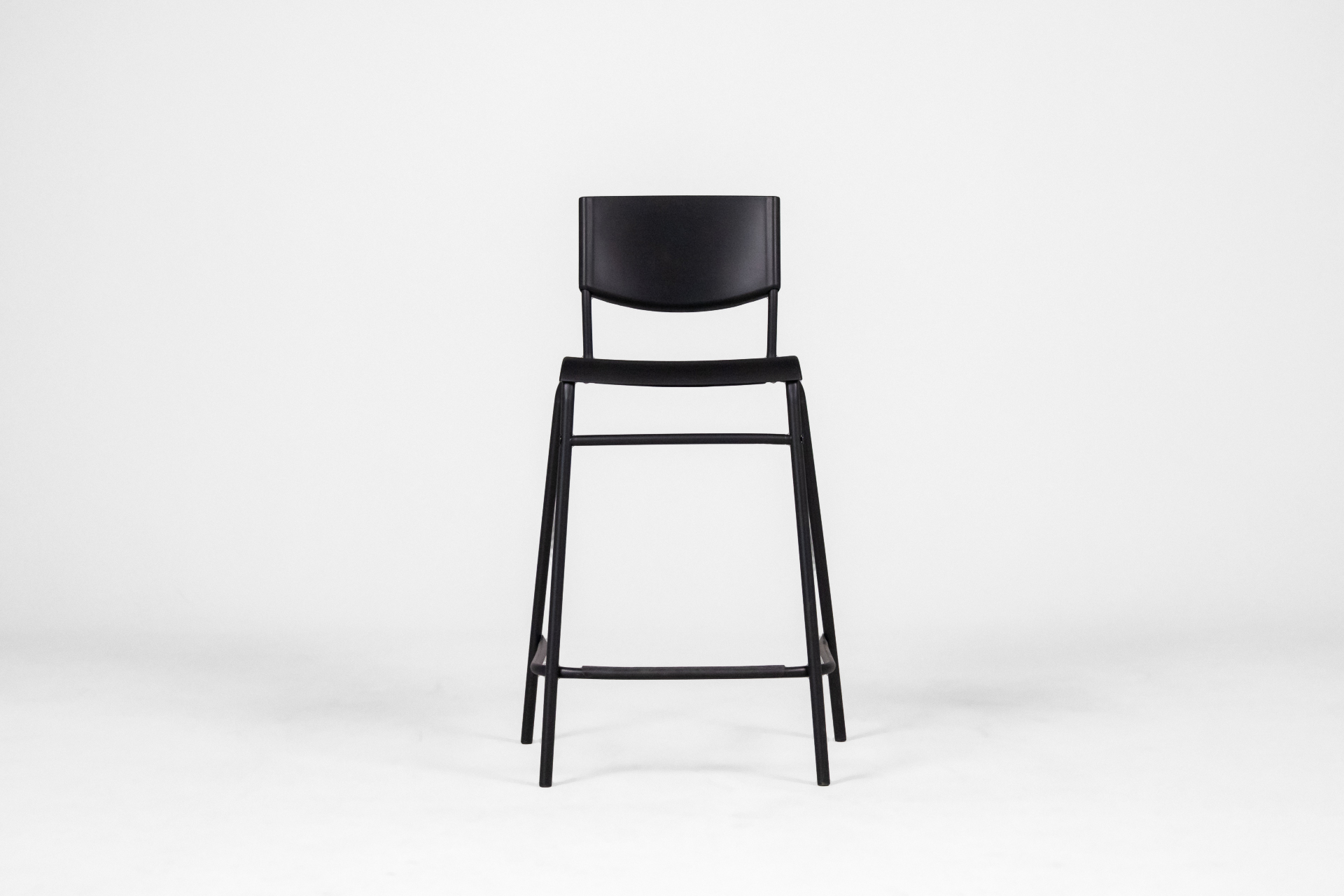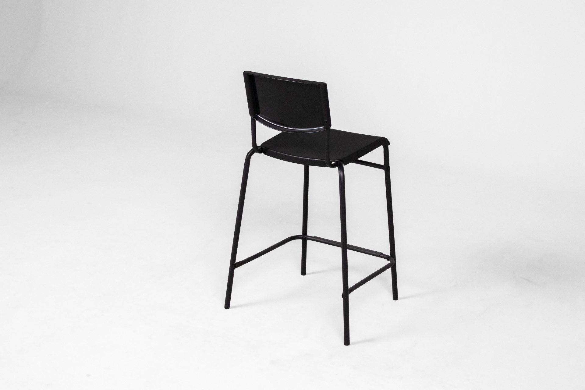 Magas, fekete fém bárszék, egyszerű vonalakkal és ívelt háttámlával