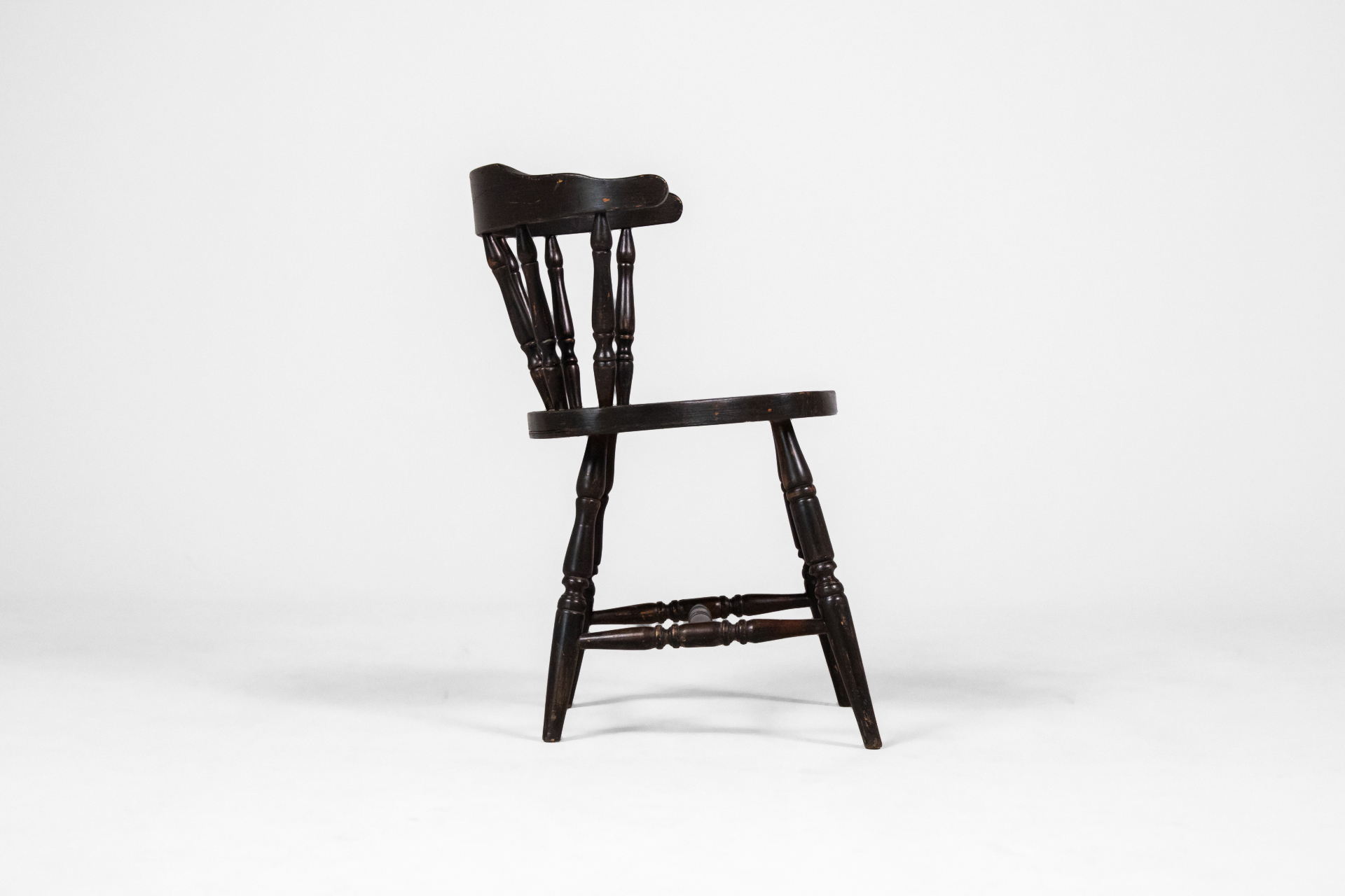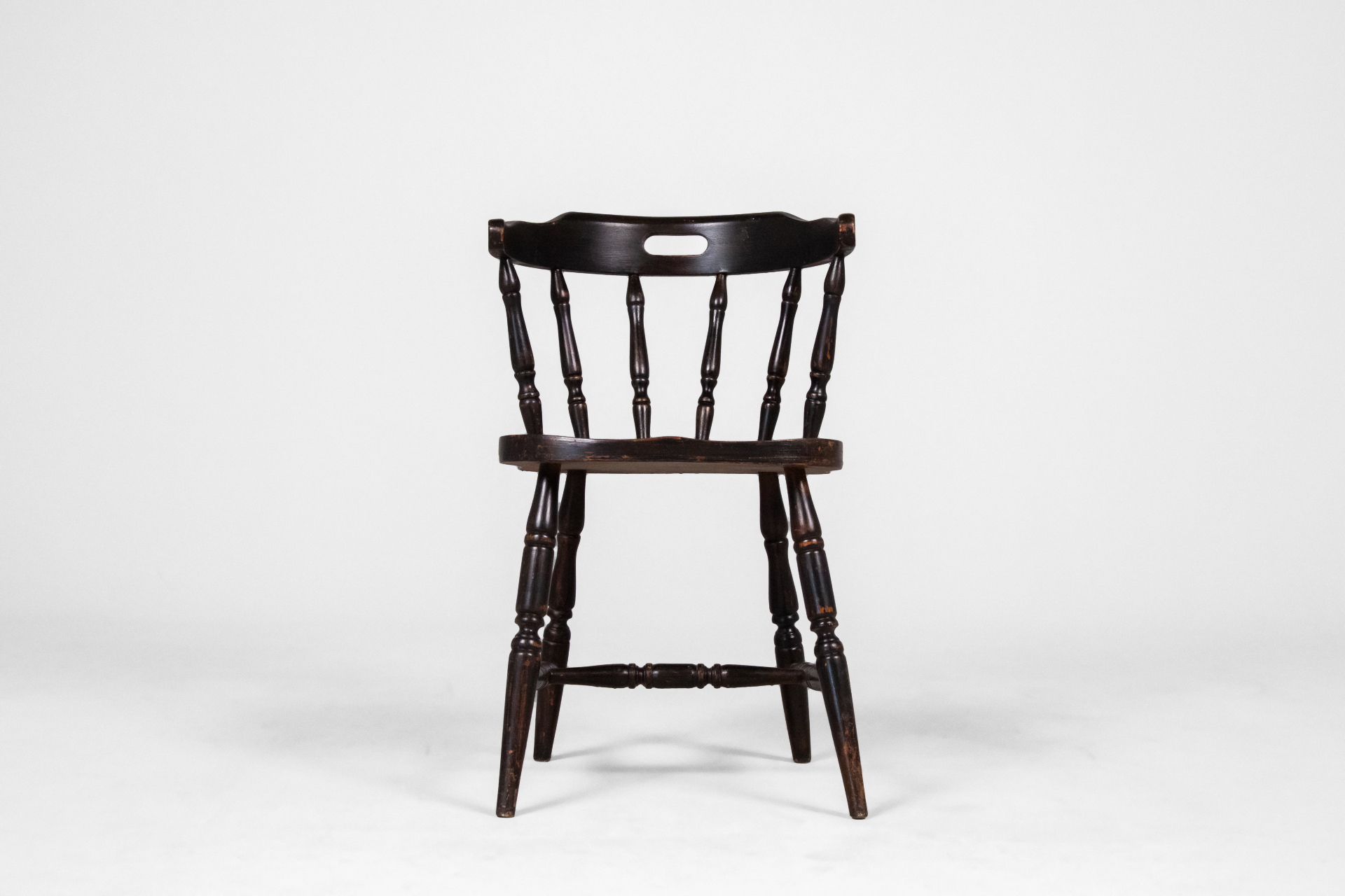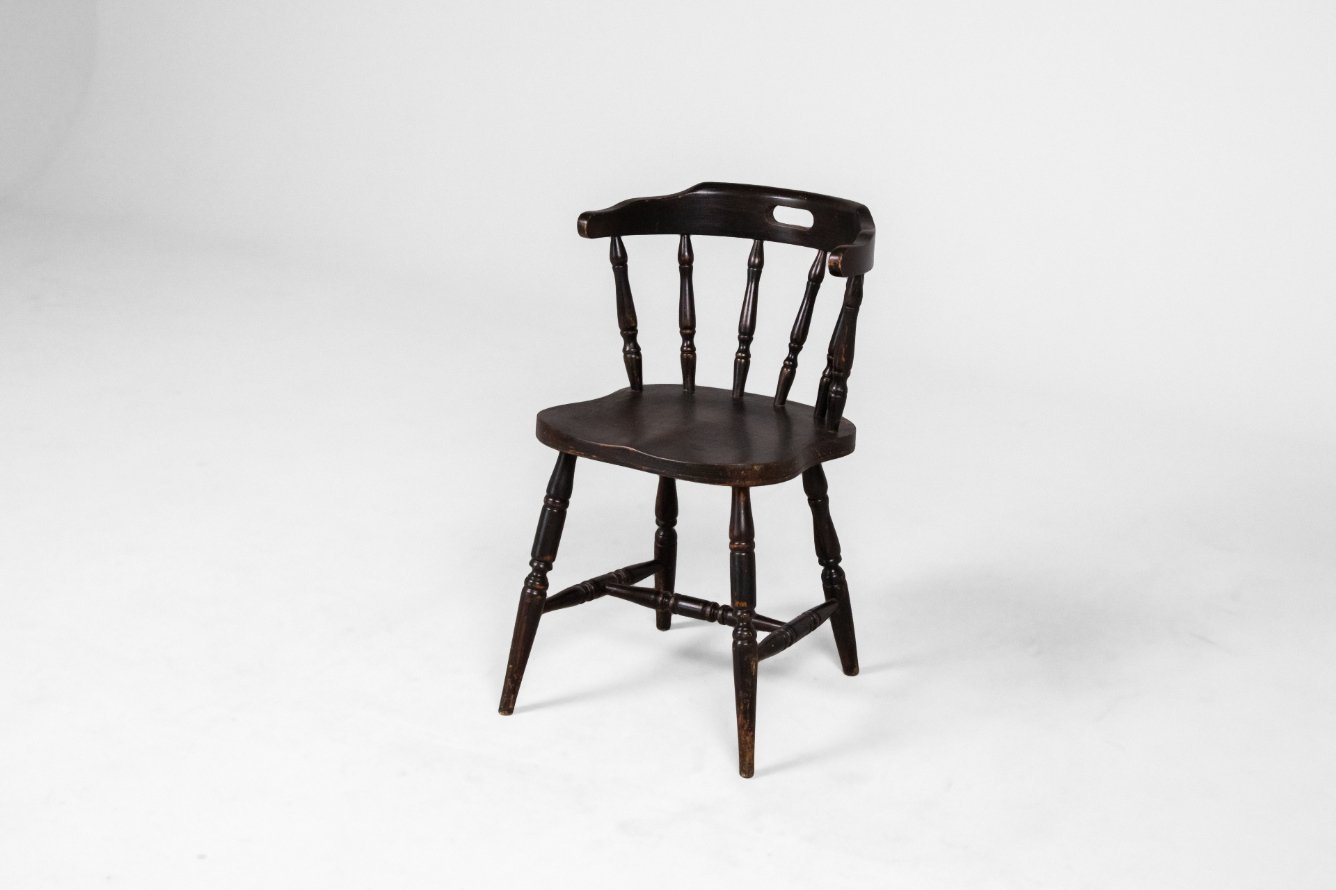 Kerek, fekete ülőfelület, ívelt háttámlával és karfákkal, fából készült, vékony lábakkal