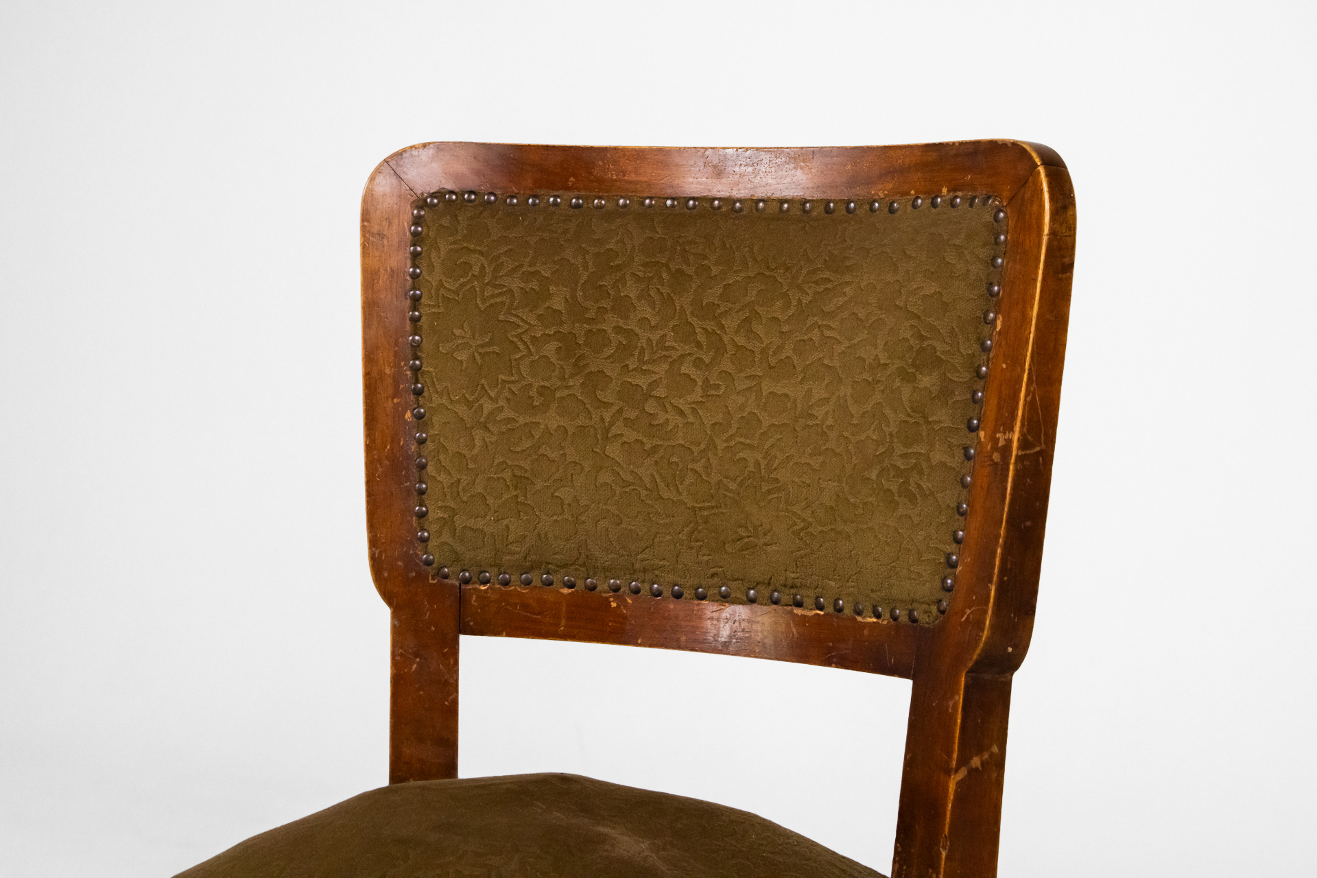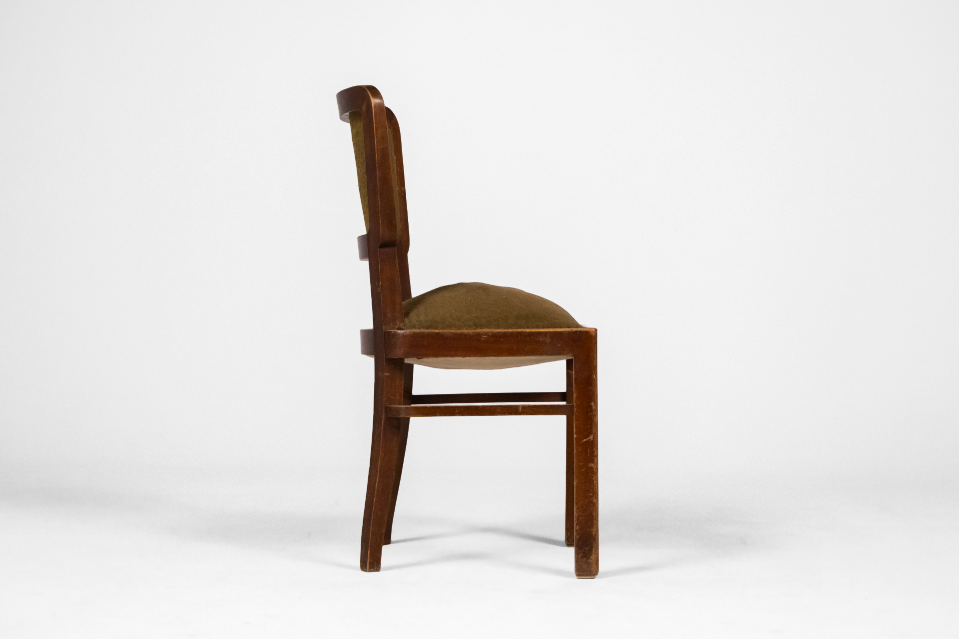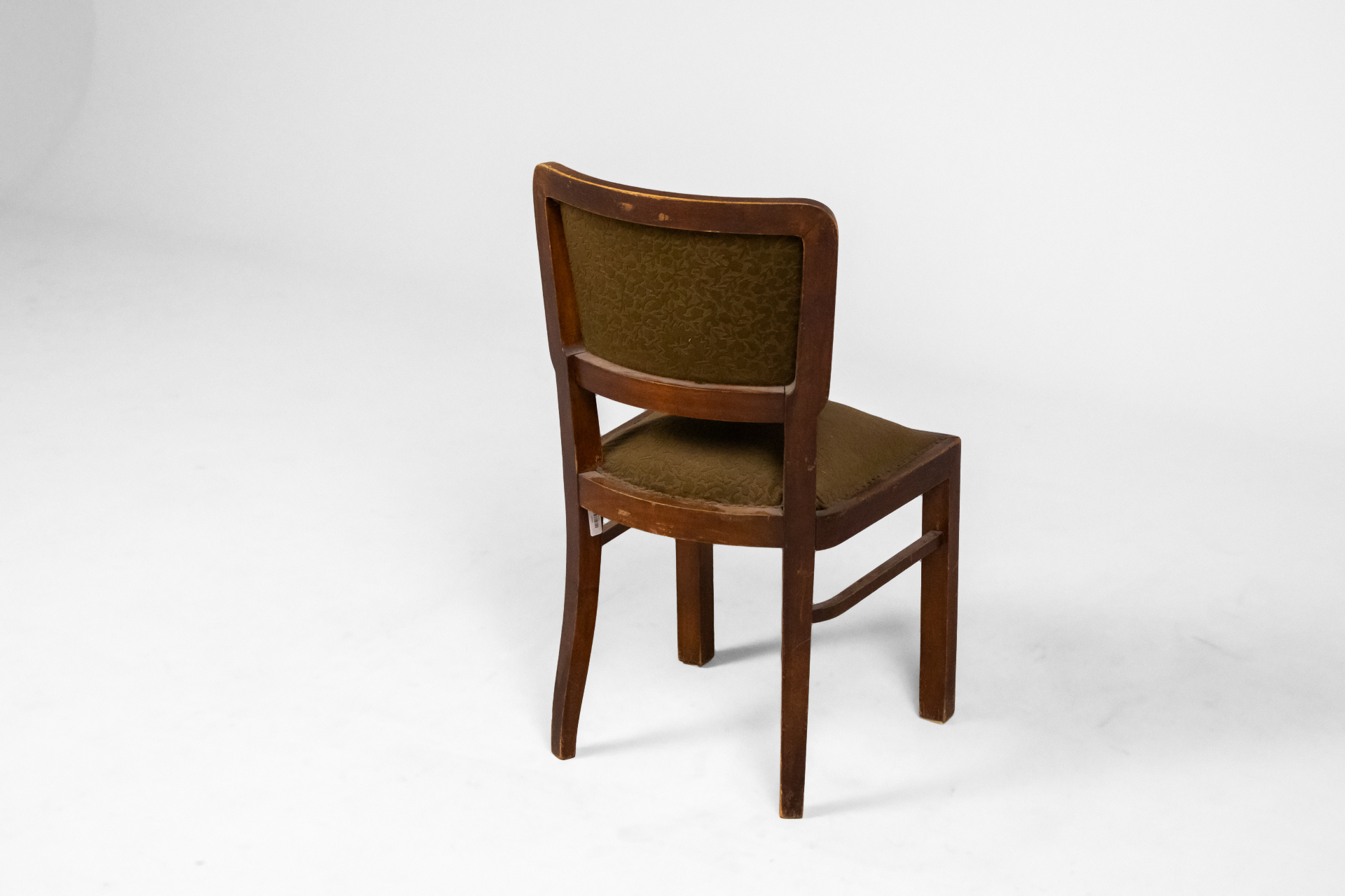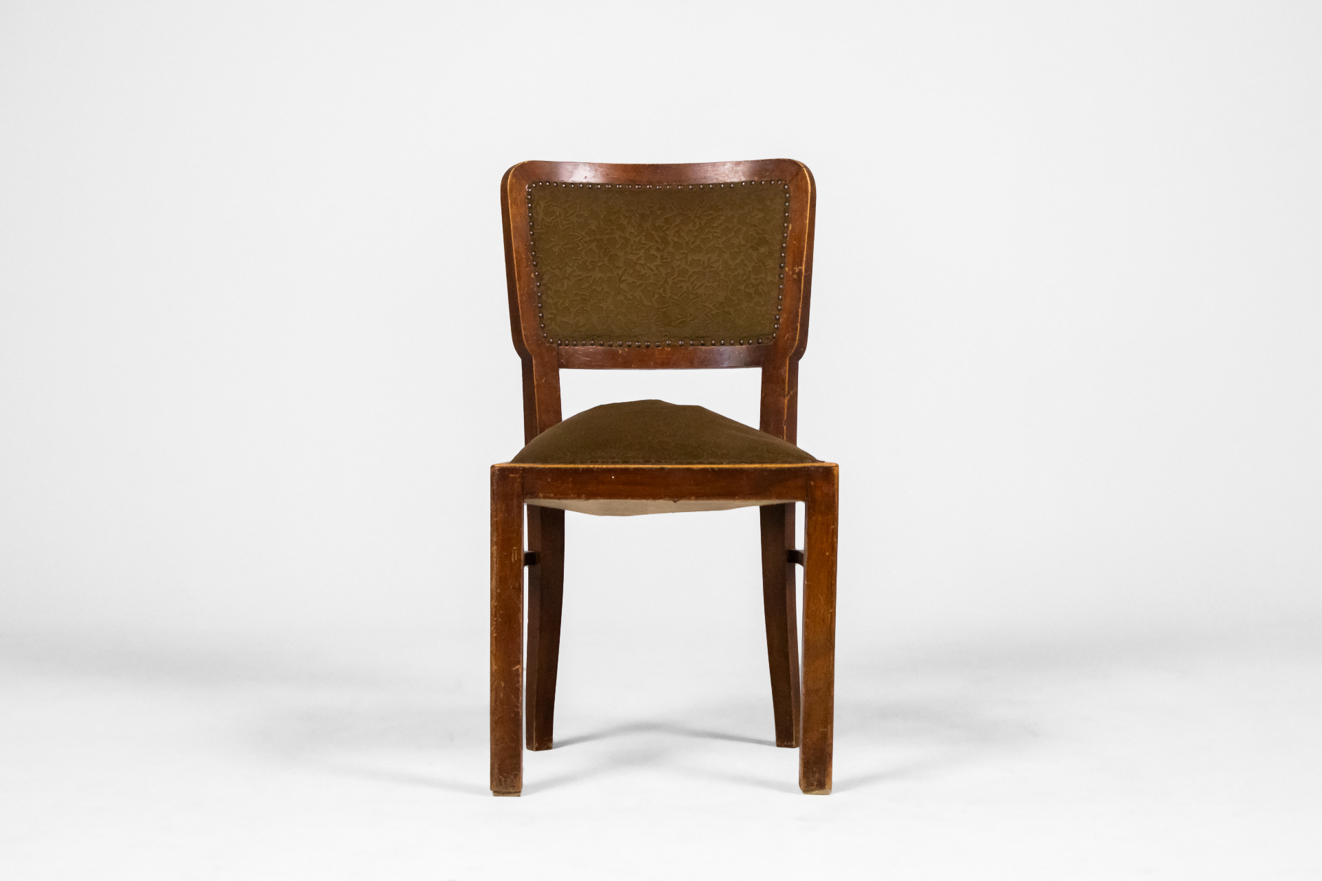 Négyzet alakú, sötétbarna fa vázzal és zöld szövet ülőrésszel, háttámlával