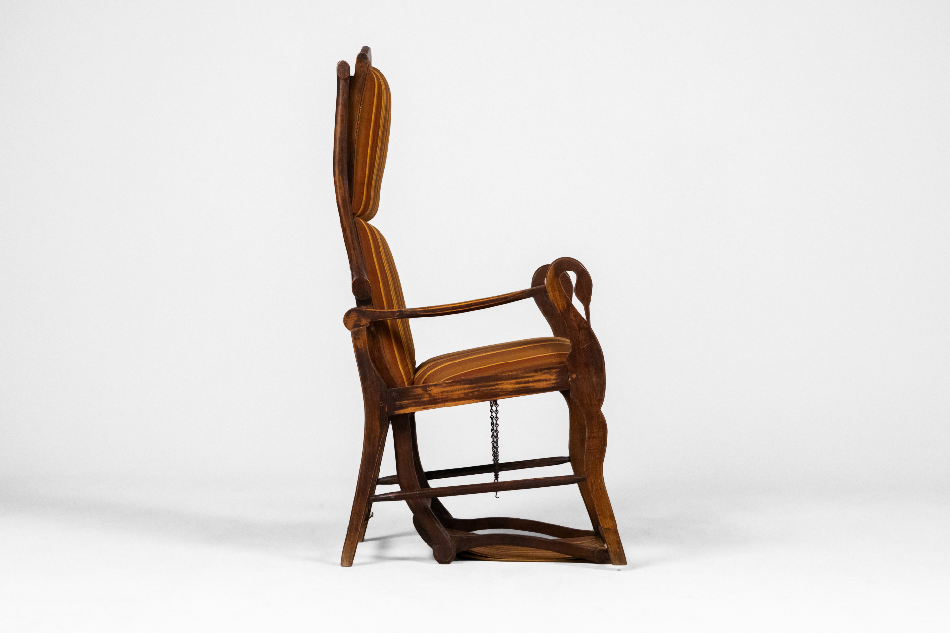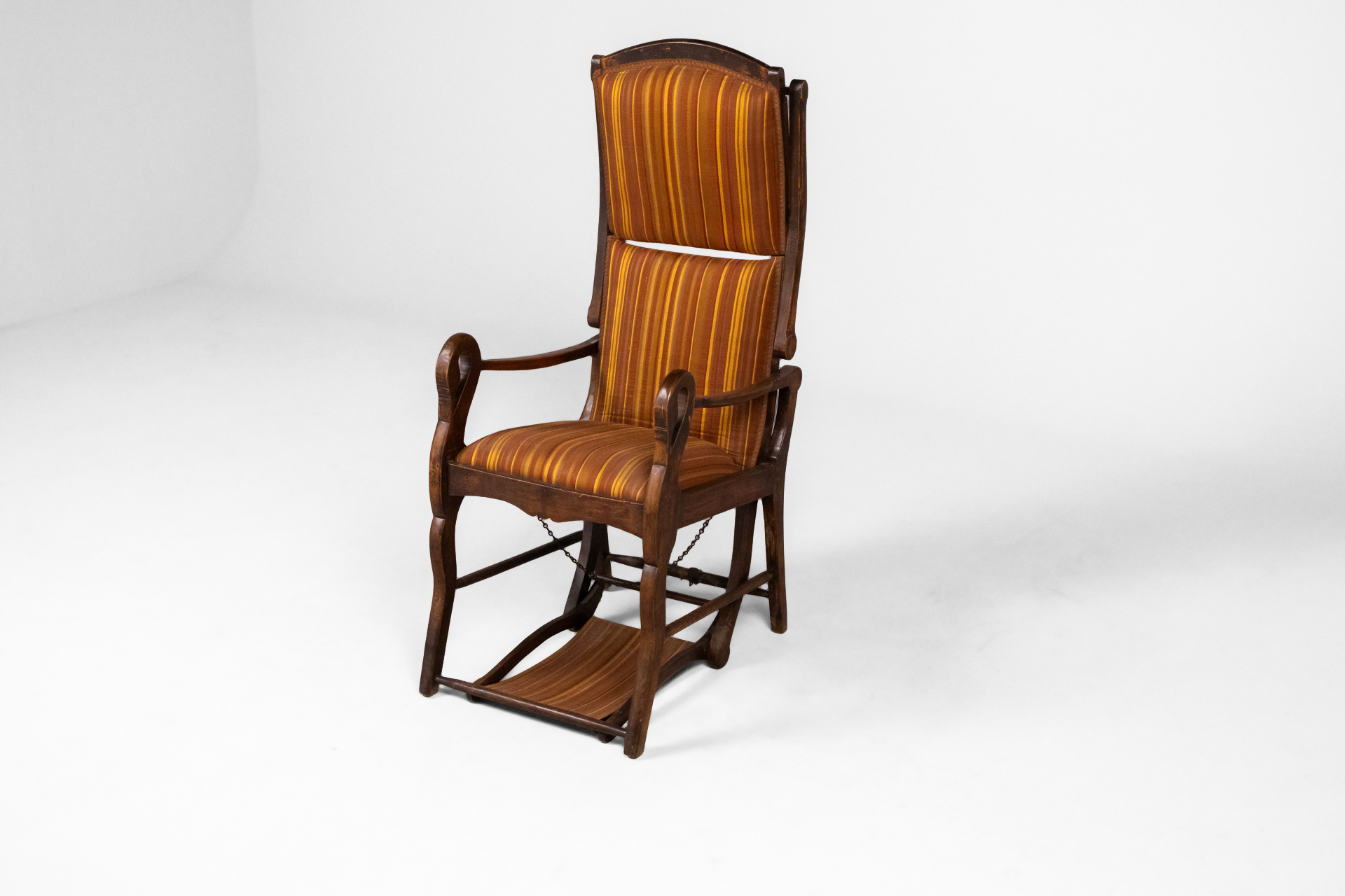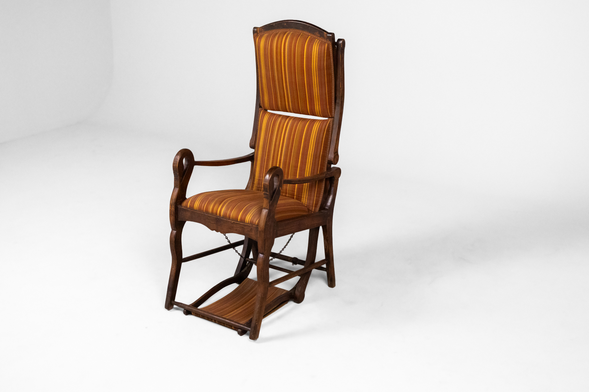 Magas háttámlás, moduláris sötétbarna fa szék, csíkos narancs és sárga párnázással