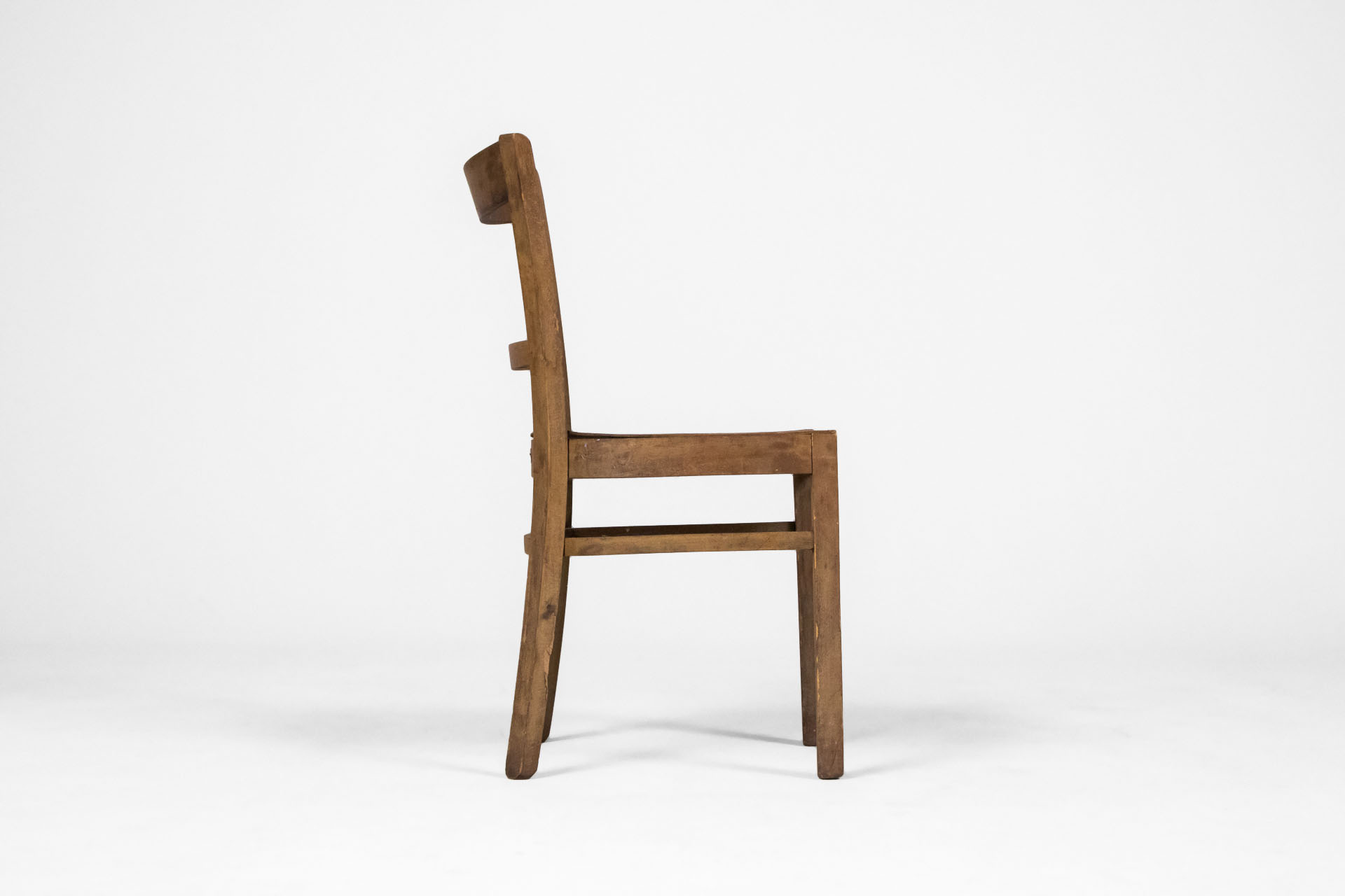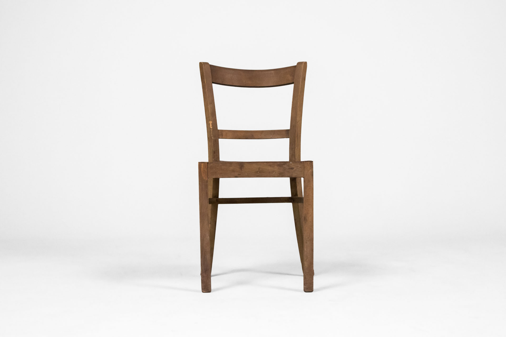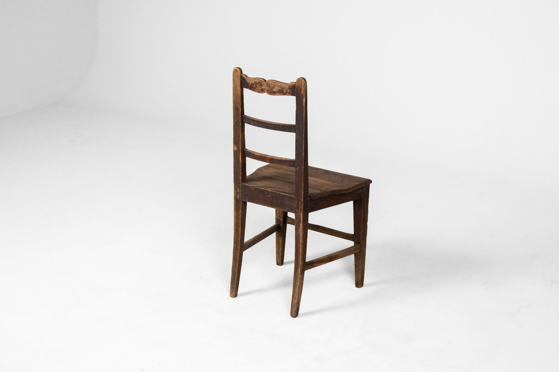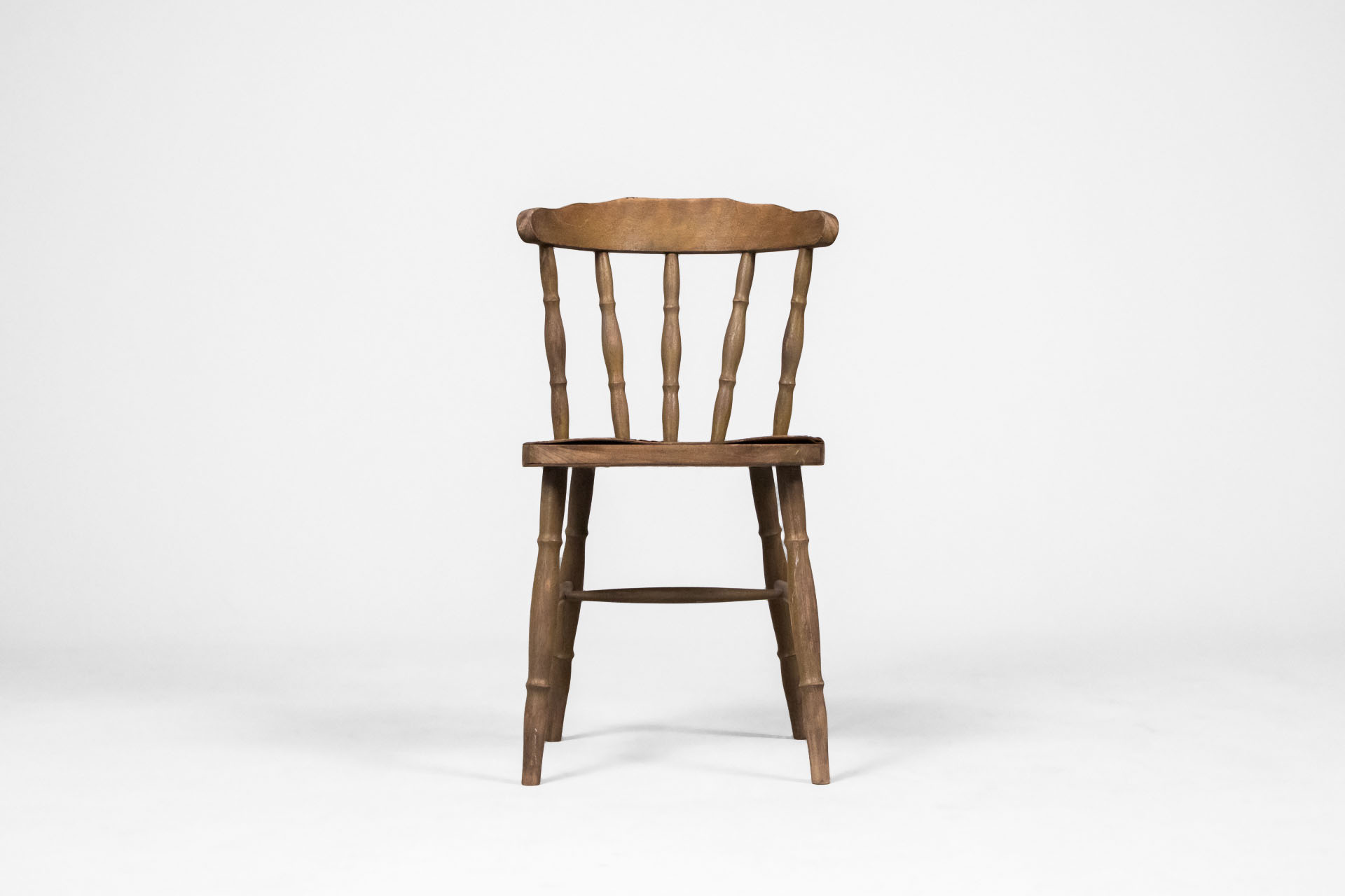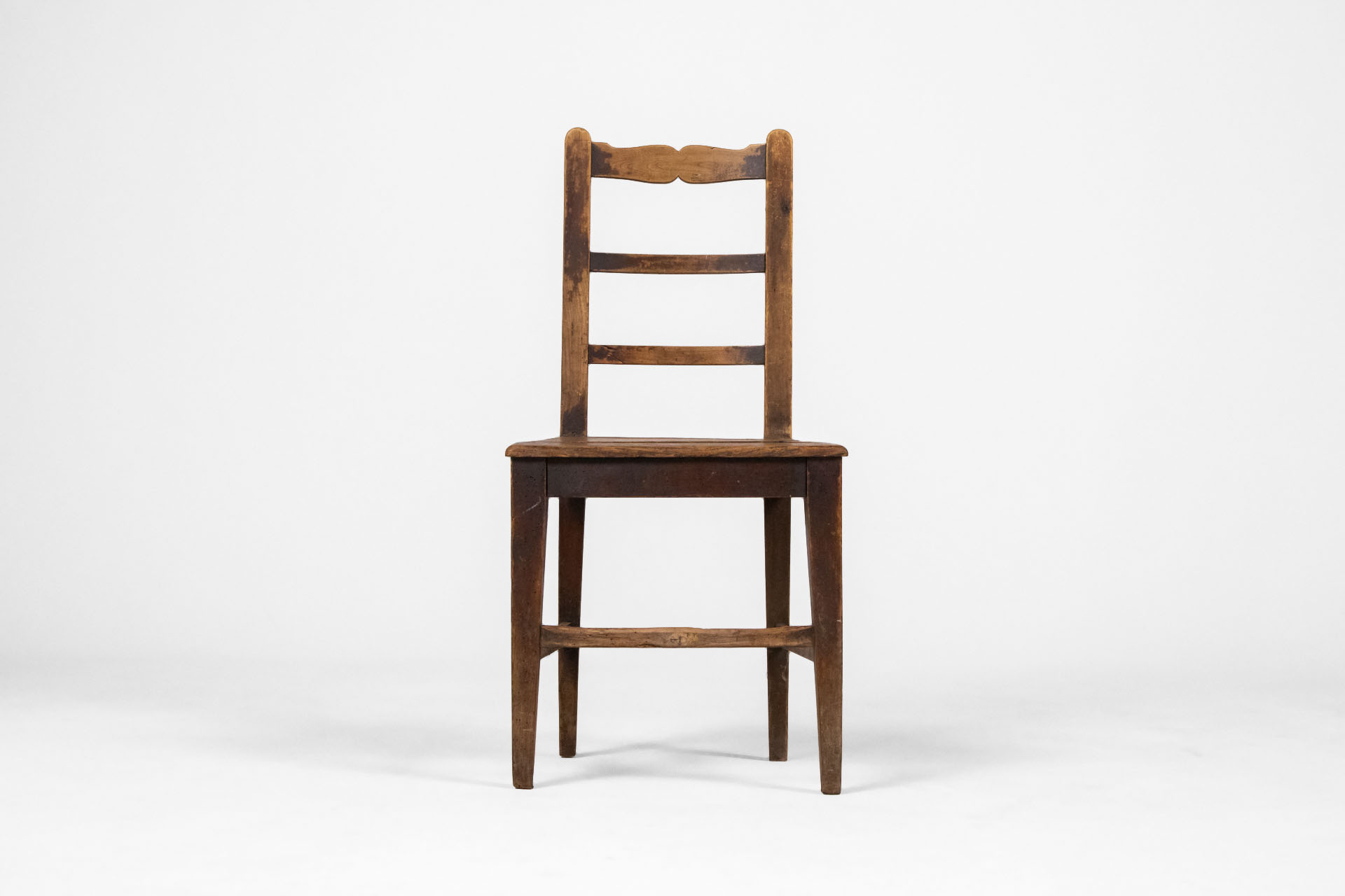 Egyszerű, rusztikus stílusú fa szék, enyhén kopott felülettel és klasszikus kialakítással