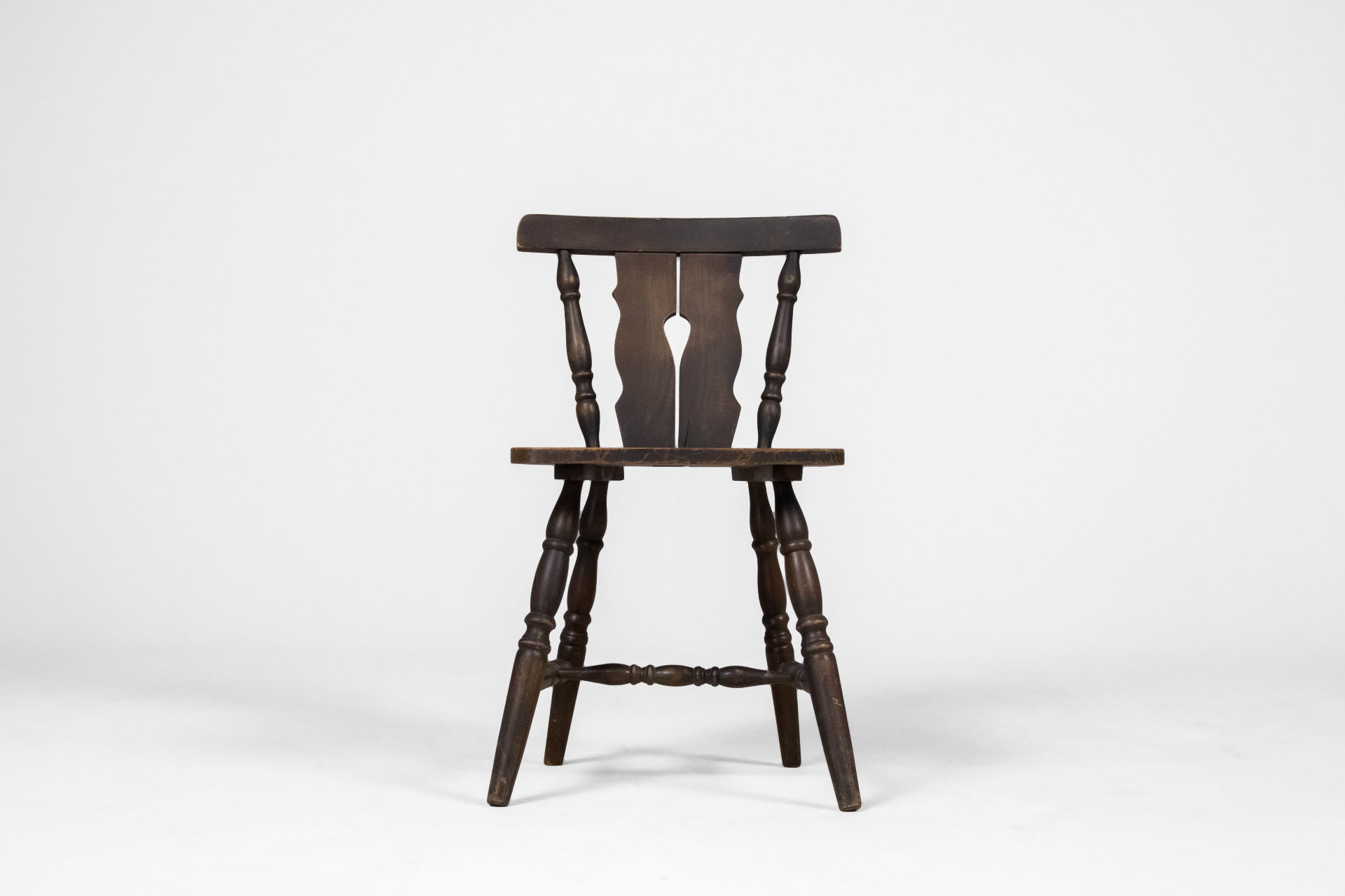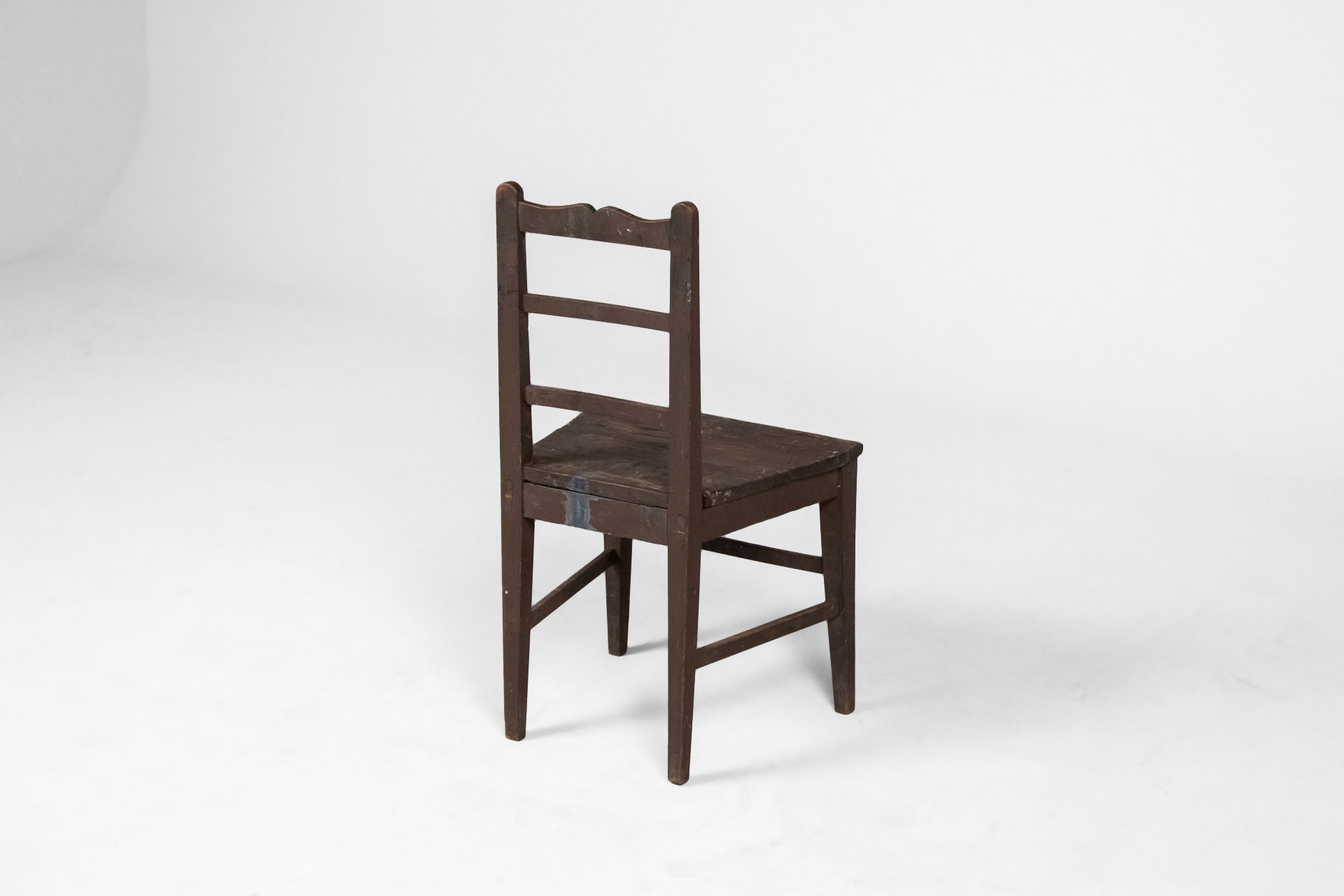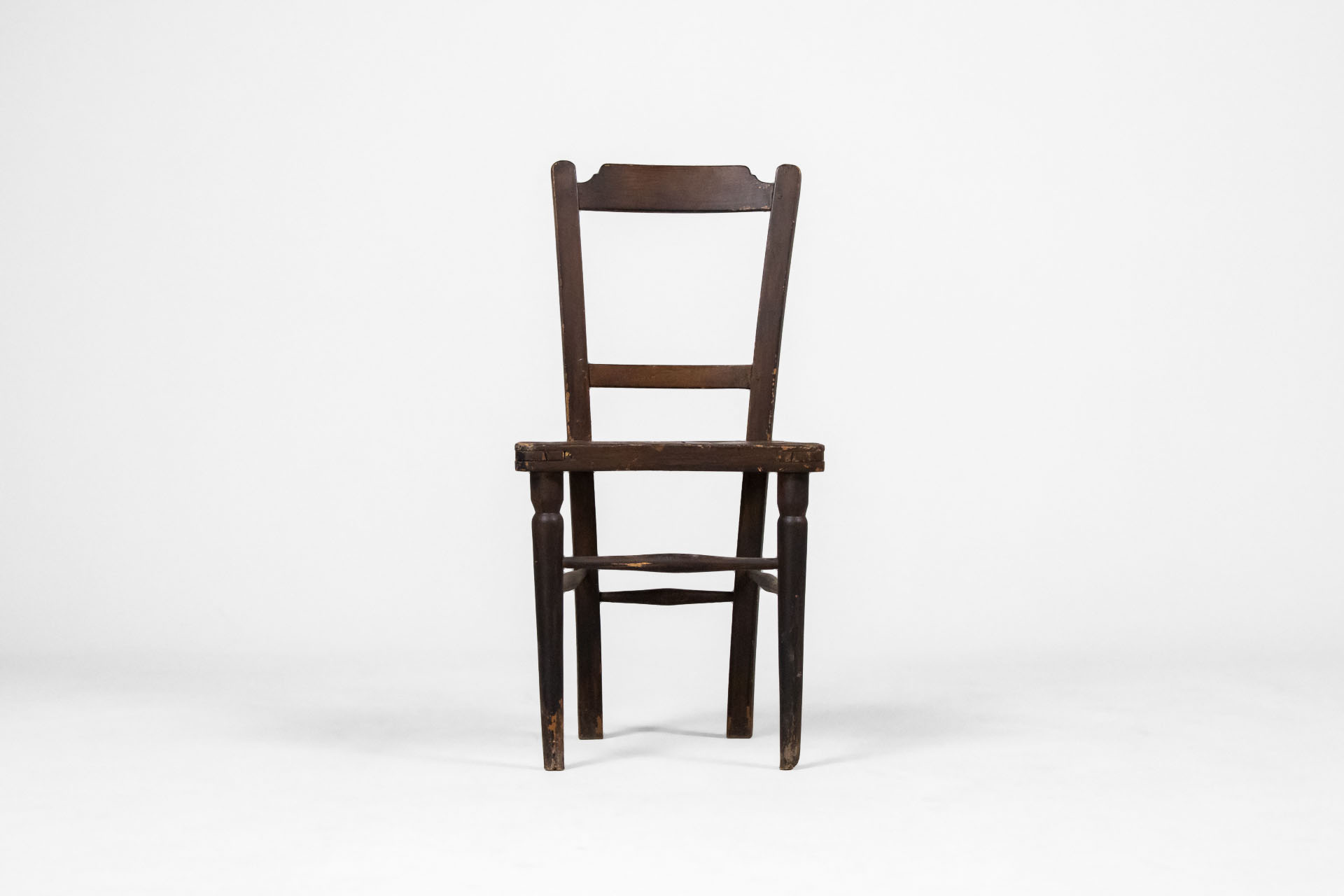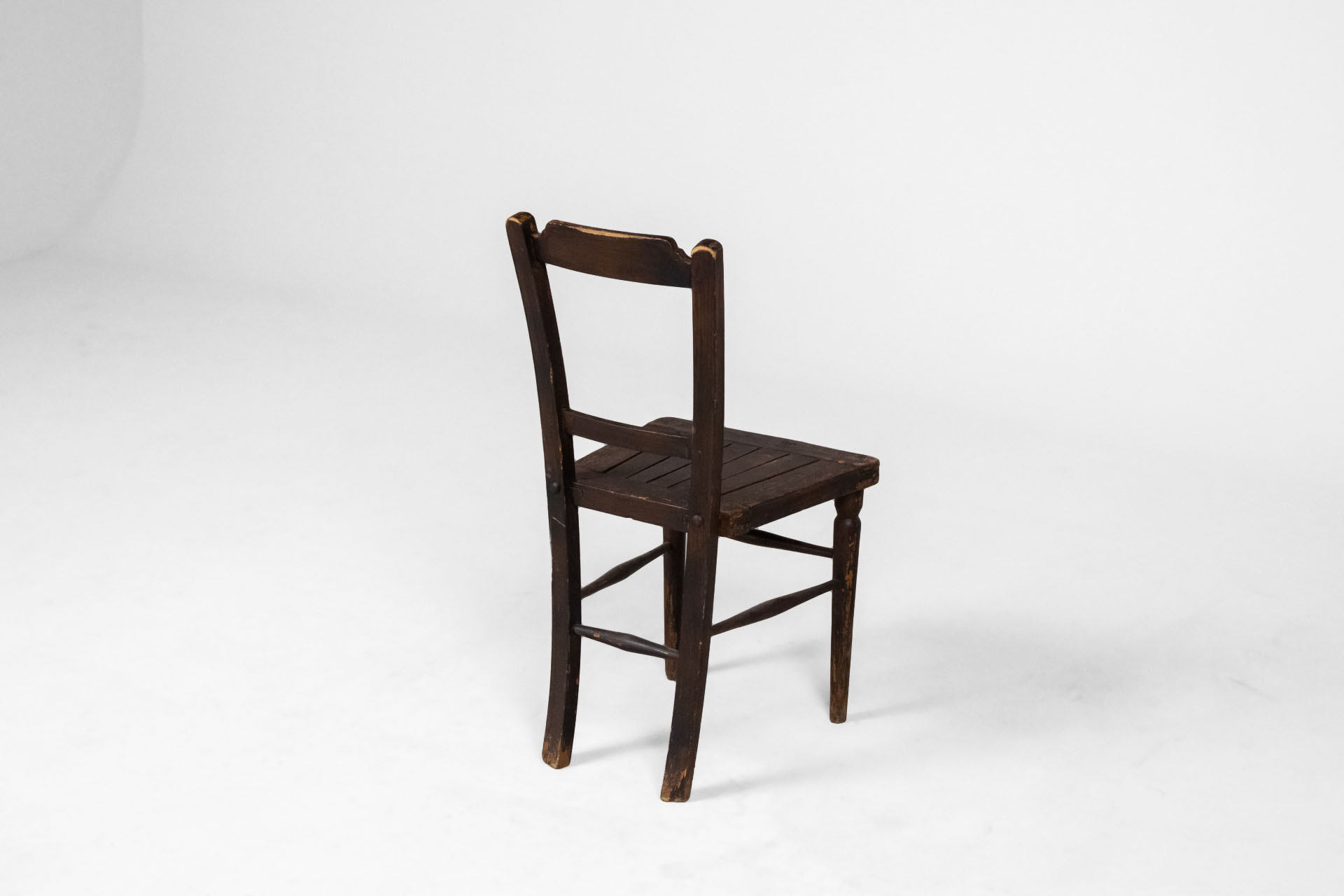 Egyszerű, de stílusos vintage fa szék. A szék sötétbarna színű, enyhén kopott felülettel, ami a használat nyomait viseli magán, így autentikus megjelenést kölcsönöz