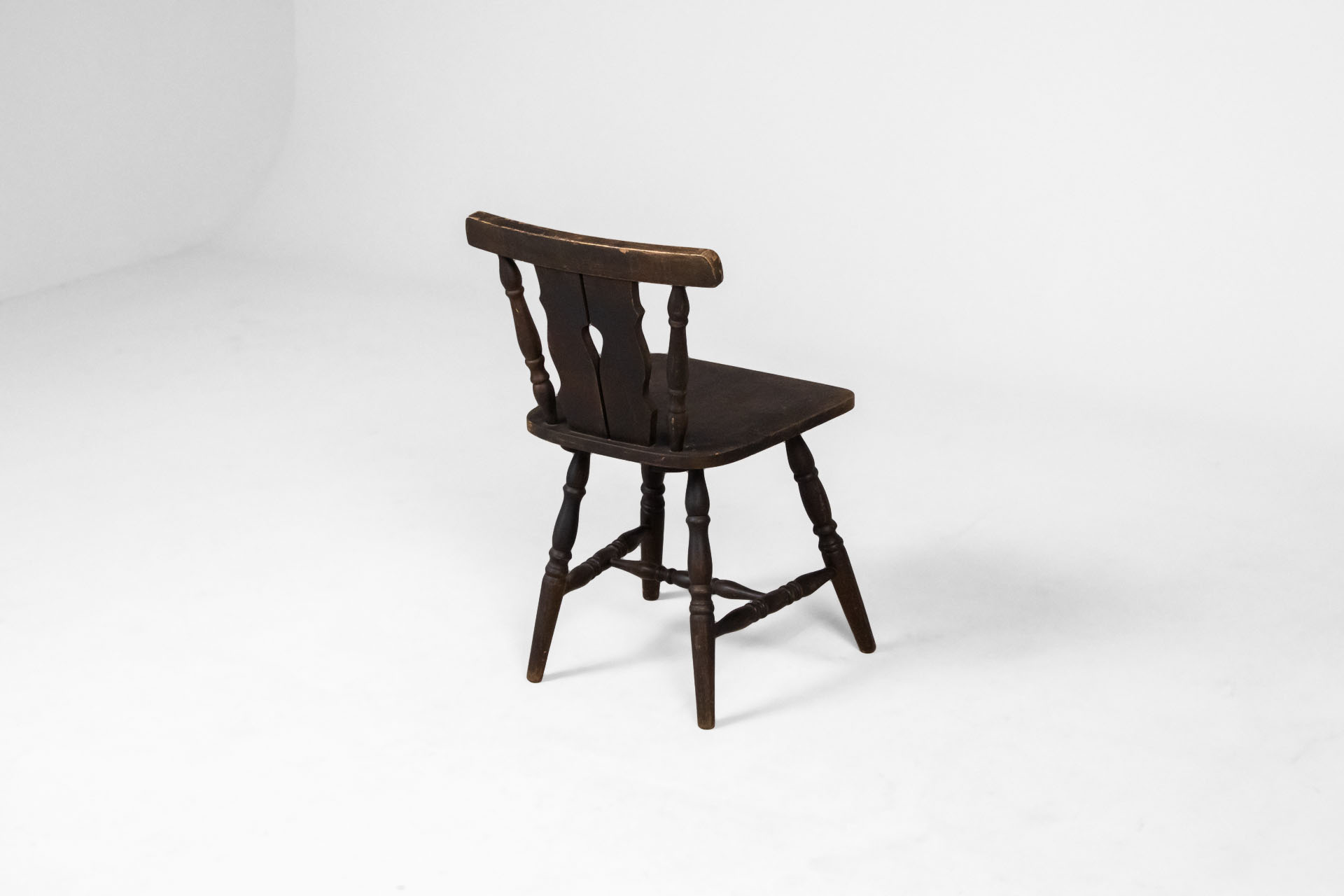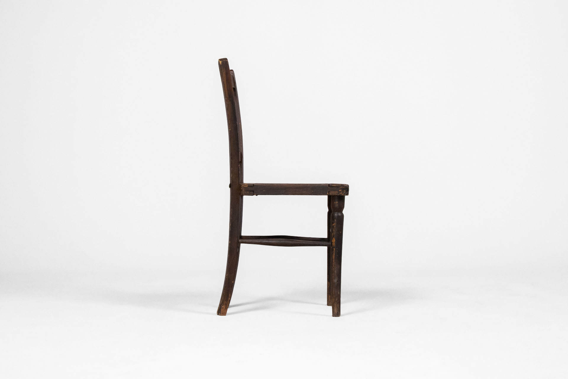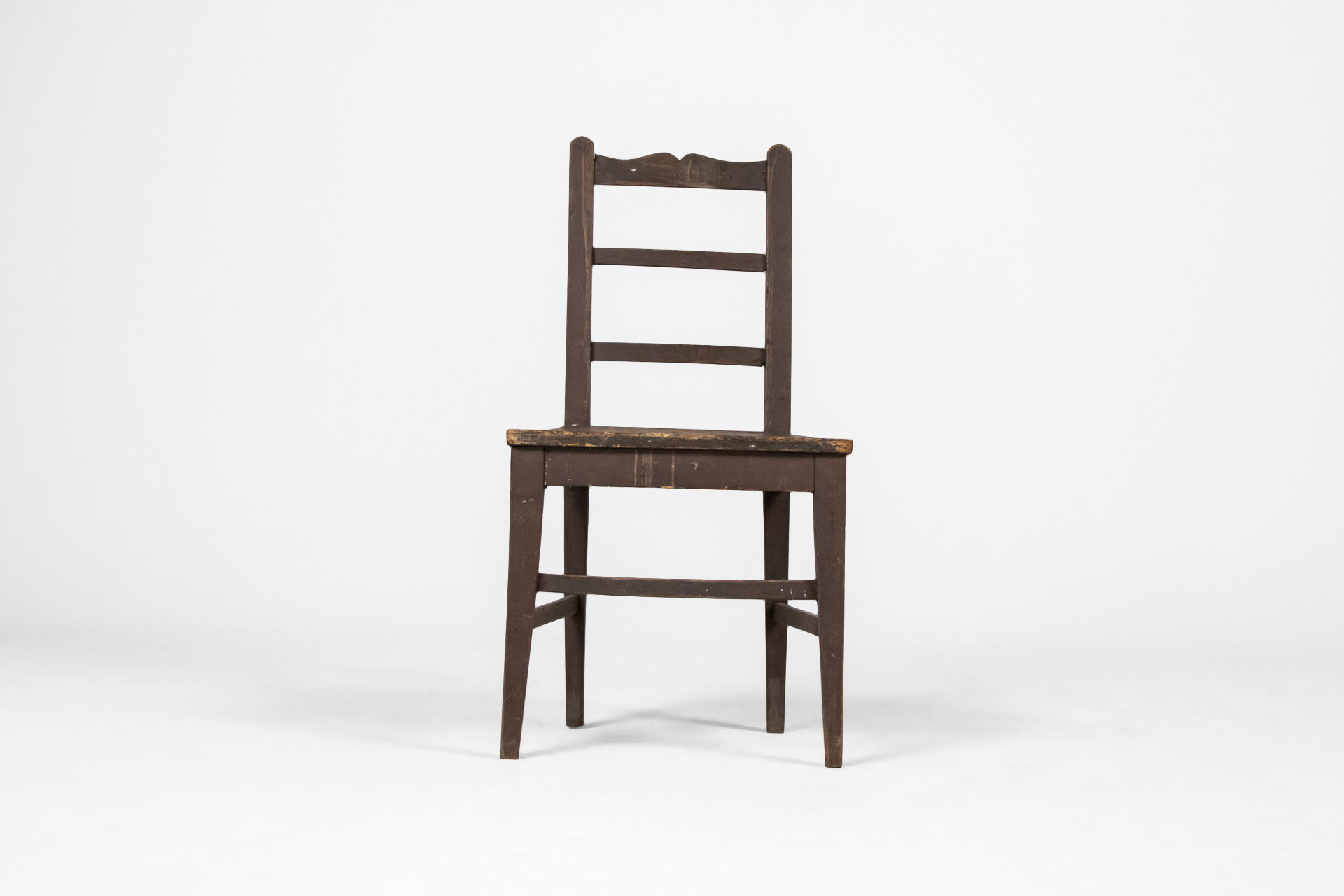 Egyszerű, de stílusos vintage fa szék. A szék sötétbarna színű, enyhén kopott felülettel, ami a használat nyomait viseli magán, így autentikus megjelenést kölcsönöz