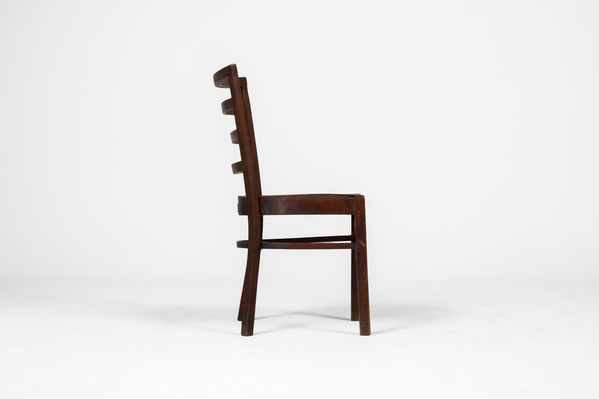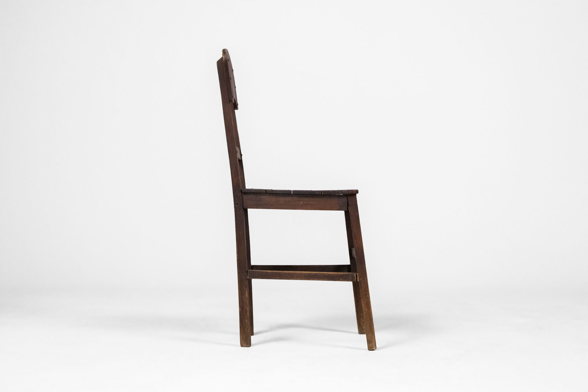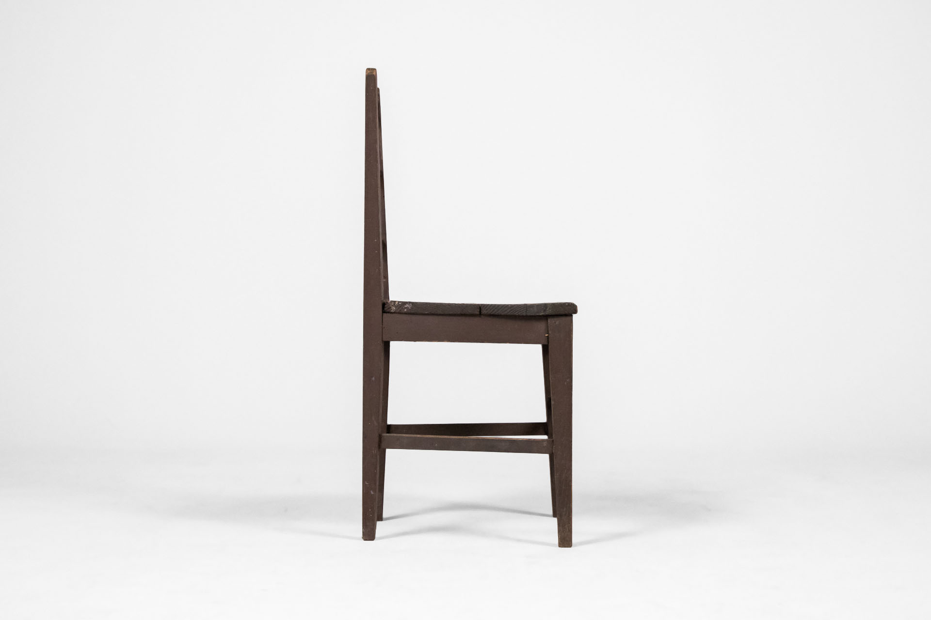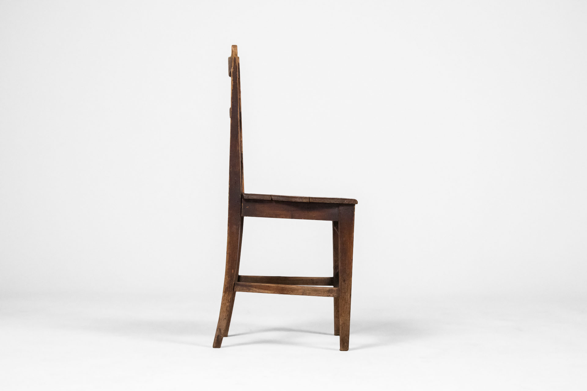 Egyszerű, rusztikus stílusú szék, amely fából készült, klasszikus formájú háttámlával és stabil lábakkal rendelkezik. A szék ülőfelülete kényelmes, enyhén ívelt, a lábak pedig elegánsan íveltek