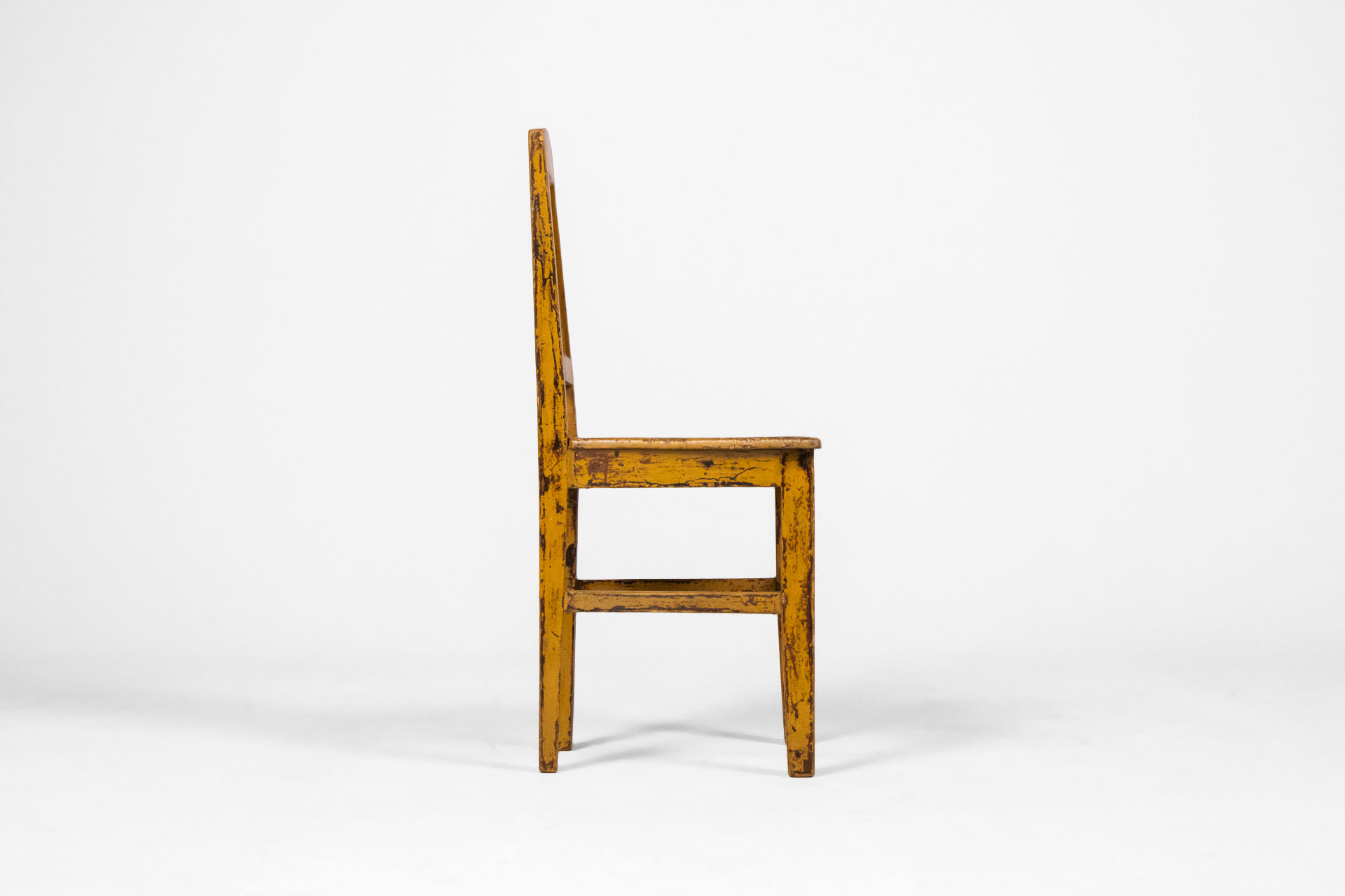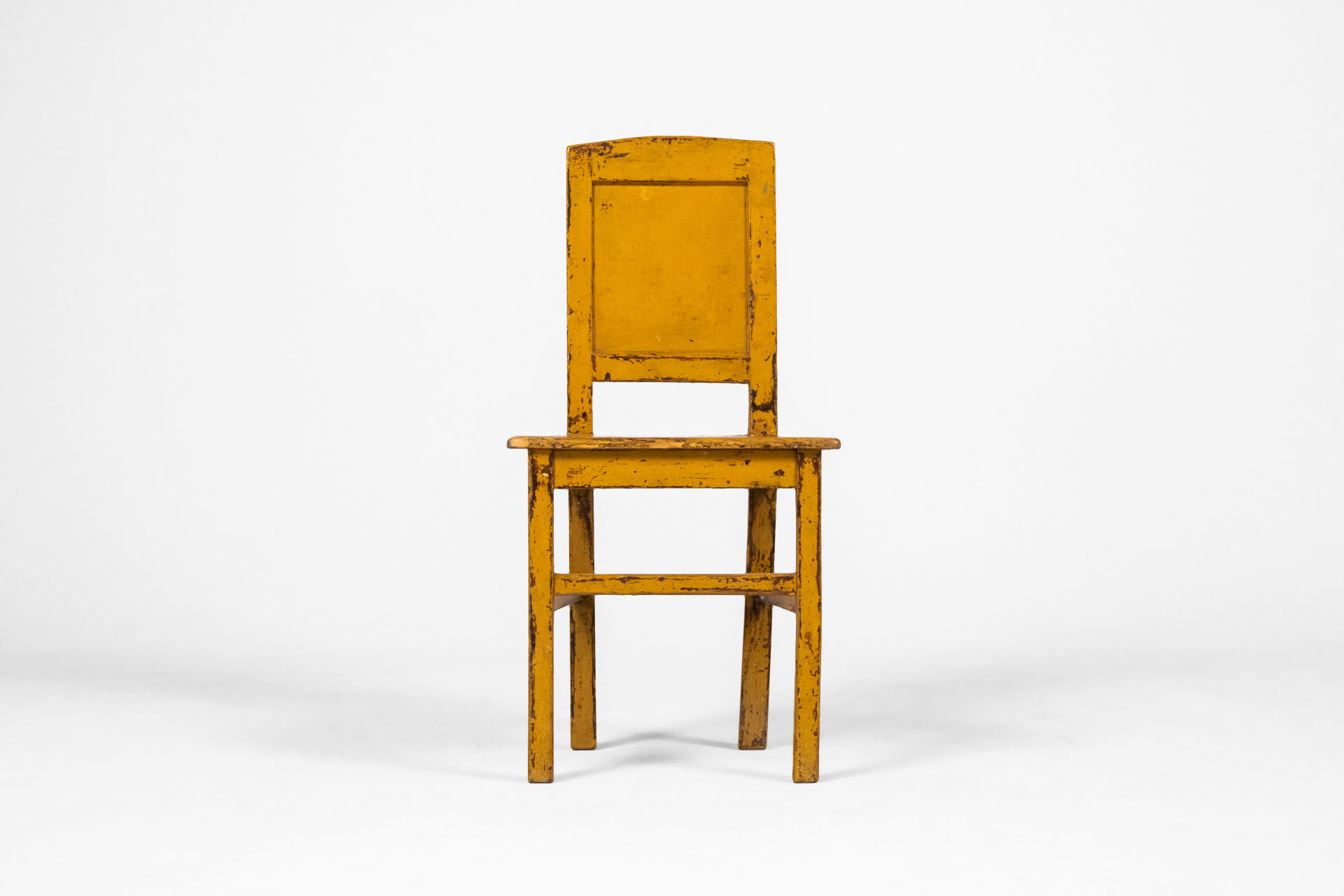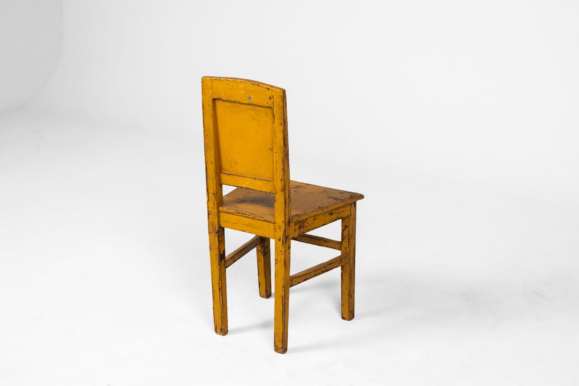 Vintage stílusú, egyszerű formájú fa szék, amely erősen kopott sárga festékkel van bevonva. A szék masszív, de könnyen mozgatható, a háttámla egyszerű, téglalap alakú kialakítású