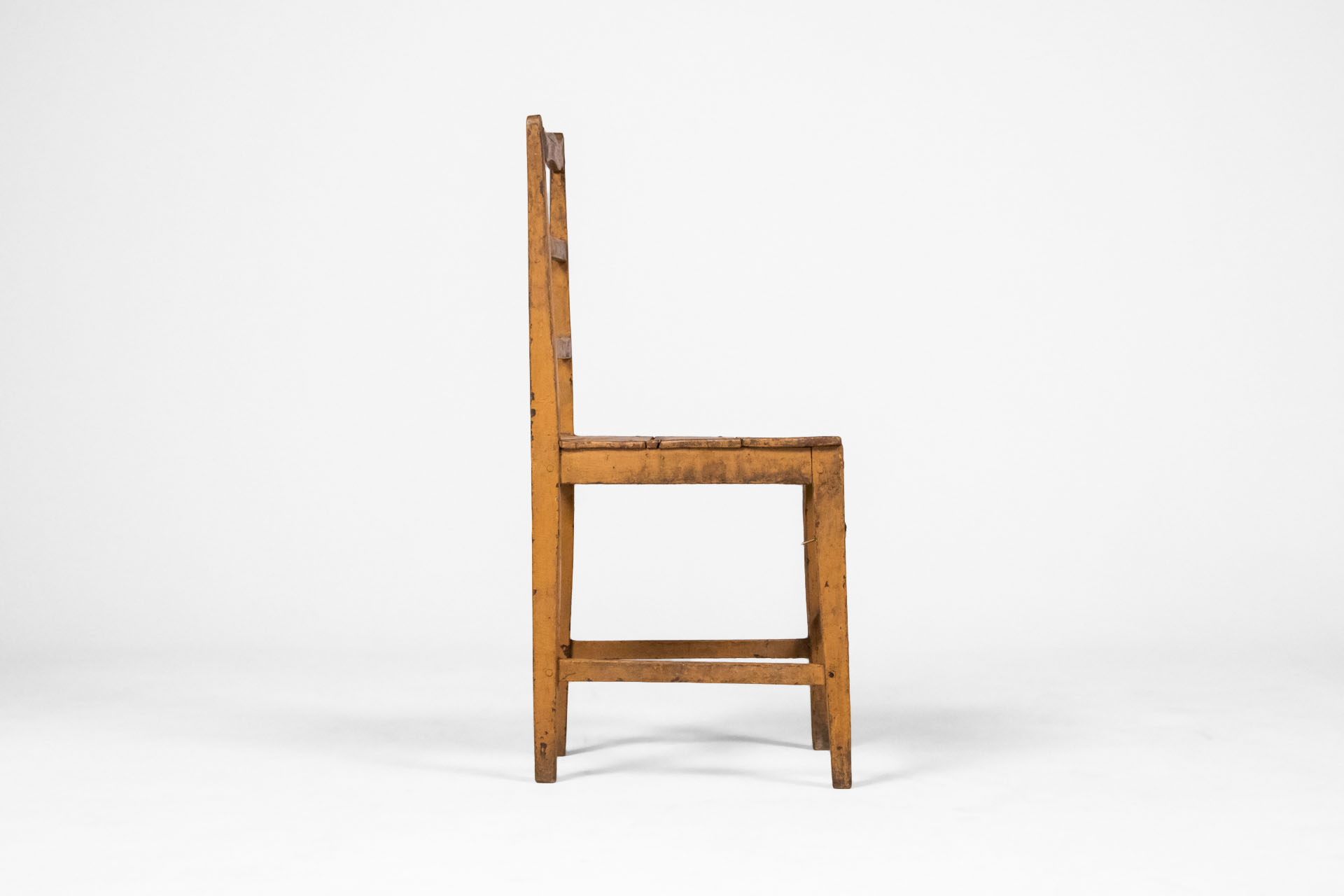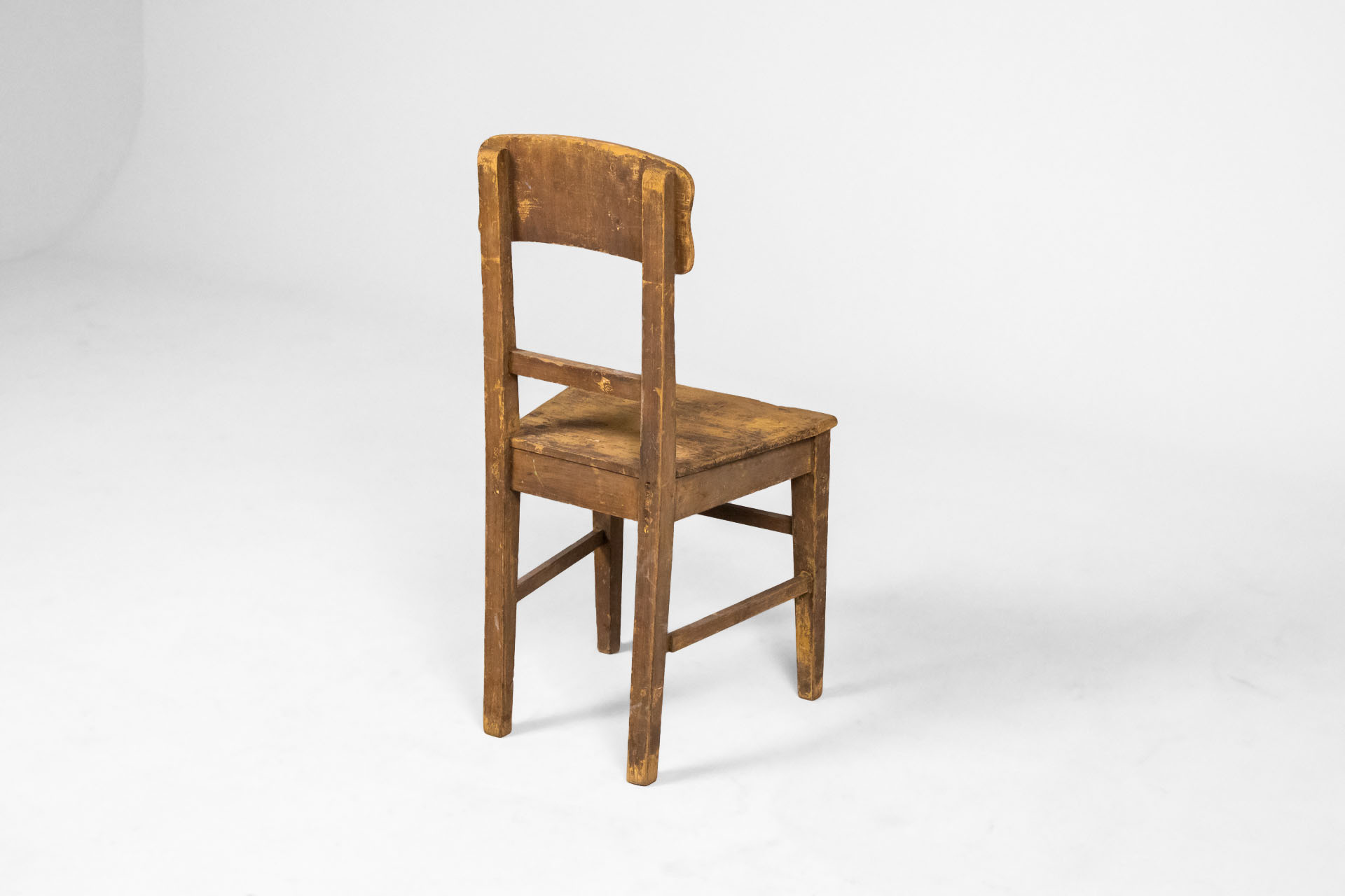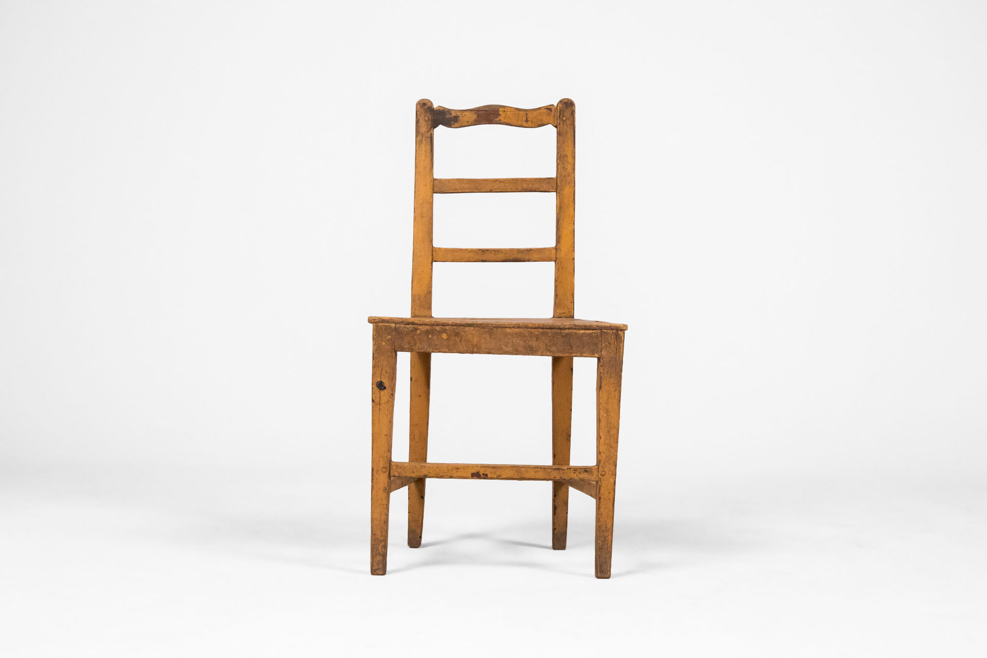 Vintage stílusú, egyszerű formájú fa szék, amely erősen kopott sárga festékkel van bevonva. A szék masszív, de könnyen mozgatható, a háttámla egyszerű, téglalap alakú kialakítású