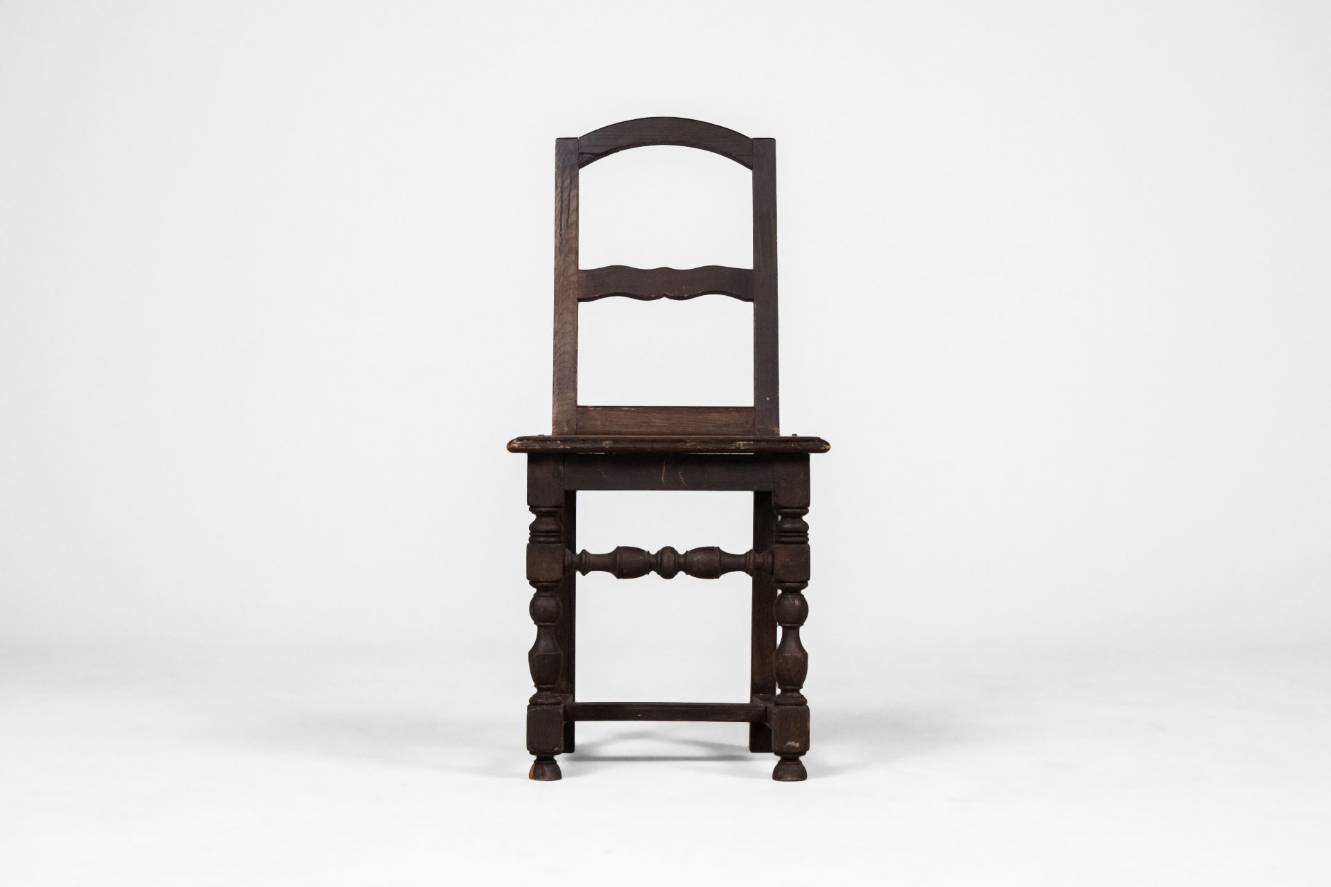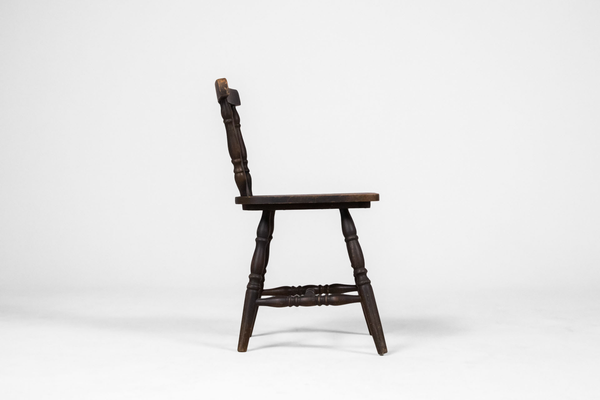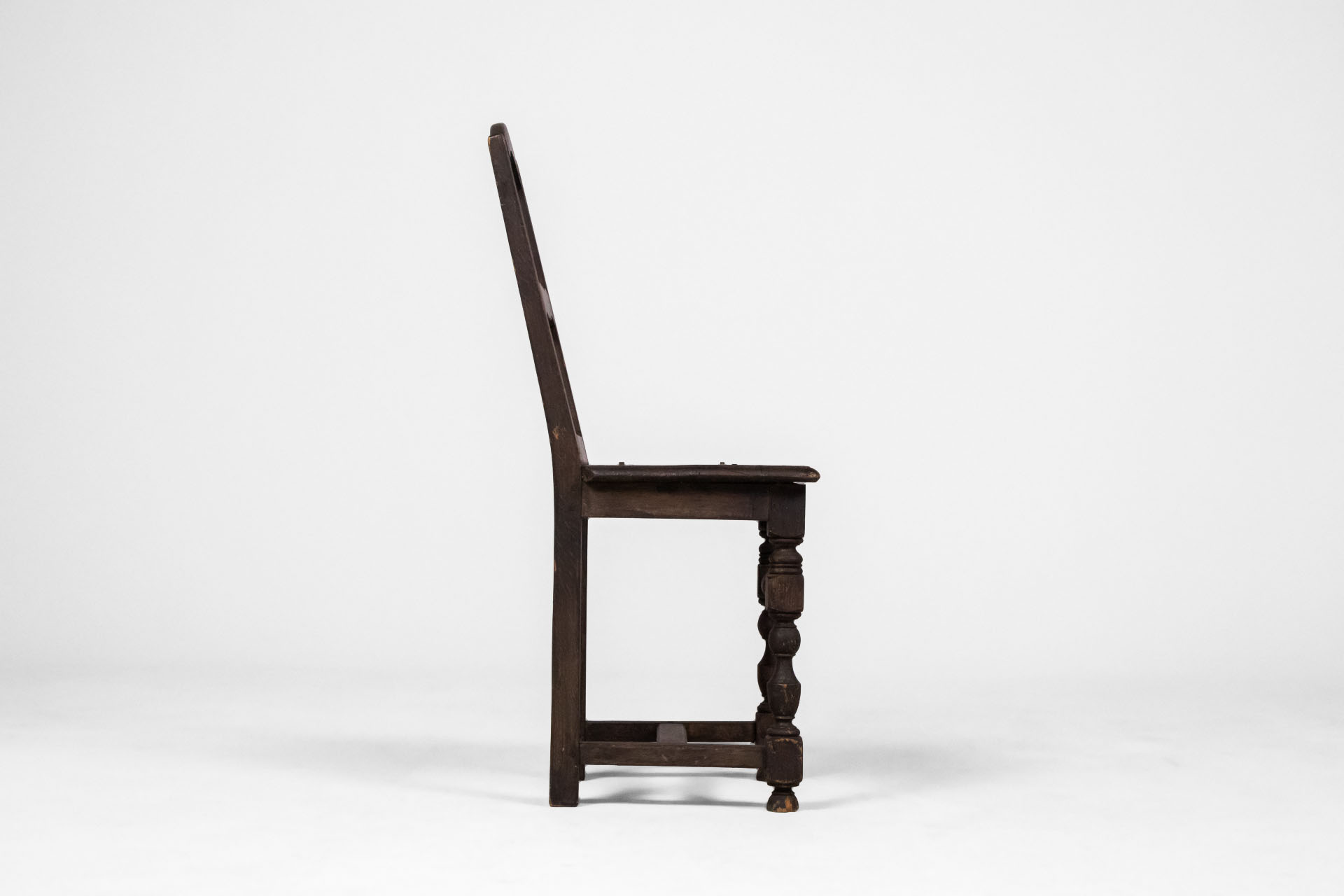 Egyszerű, de stílusos vintage fa szék, masszív szerkezettel és klasszikus vonalakkal. A sötétbarna szín és a rusztikus felület a régi idők hangulatát idézi