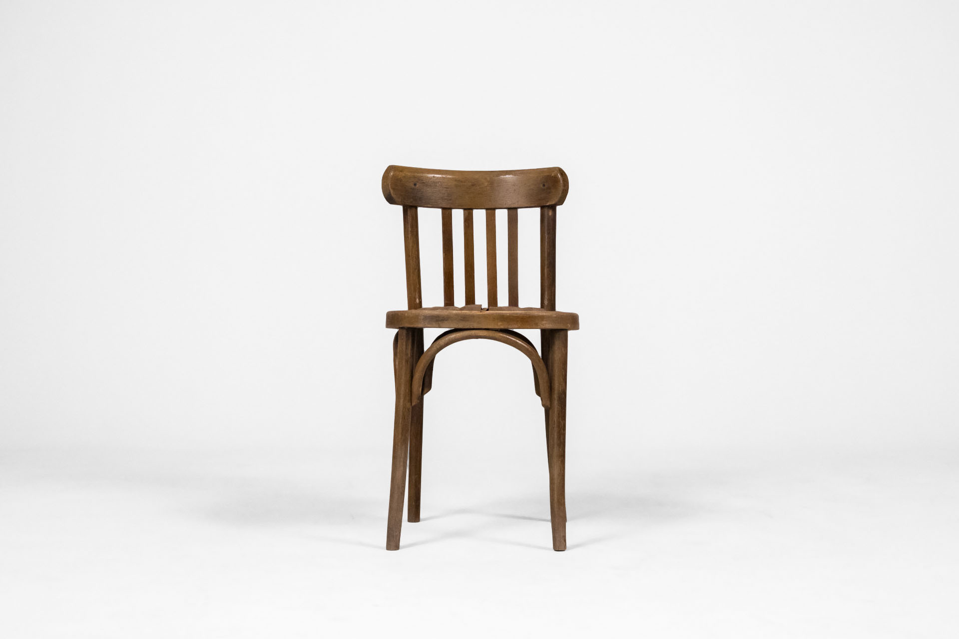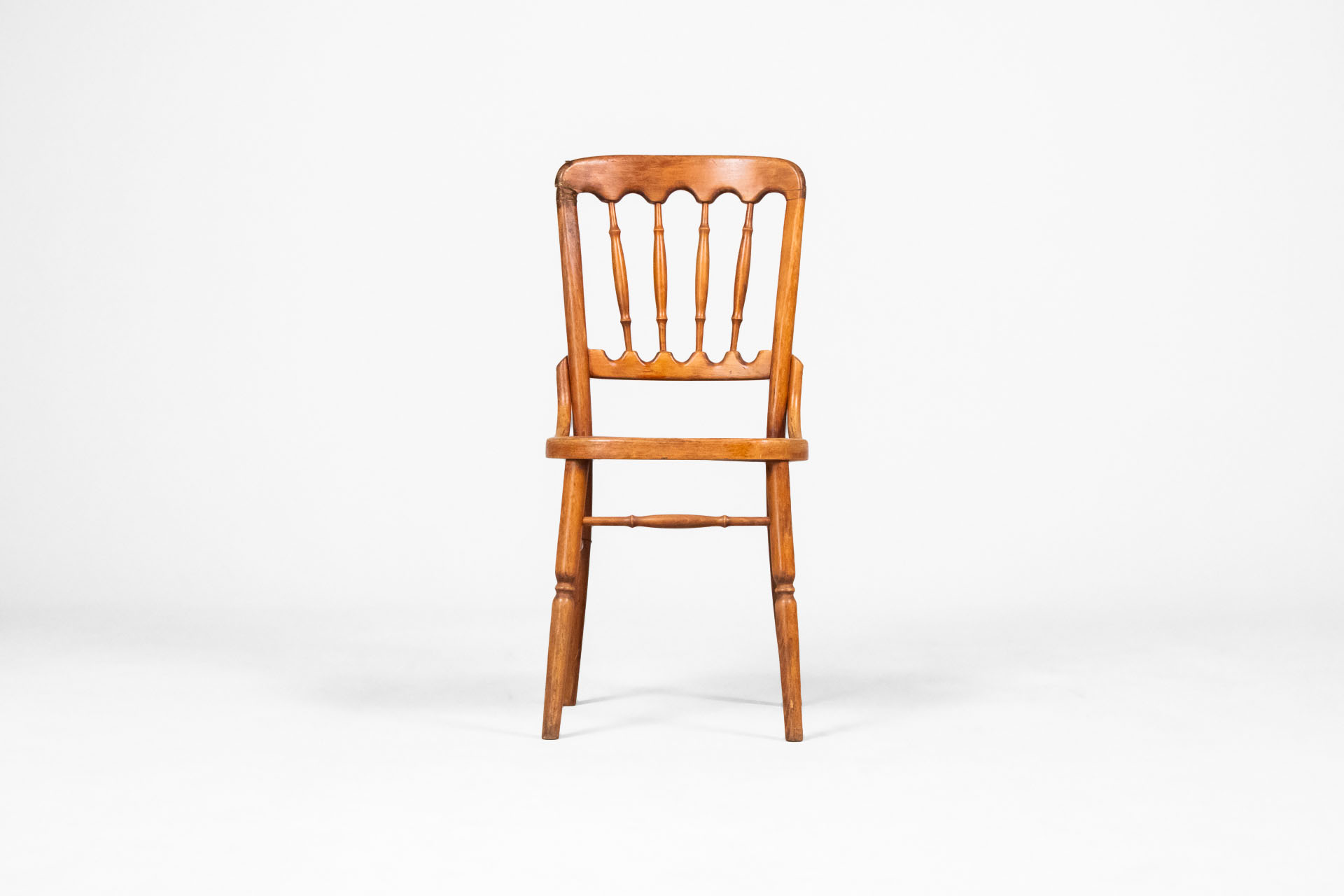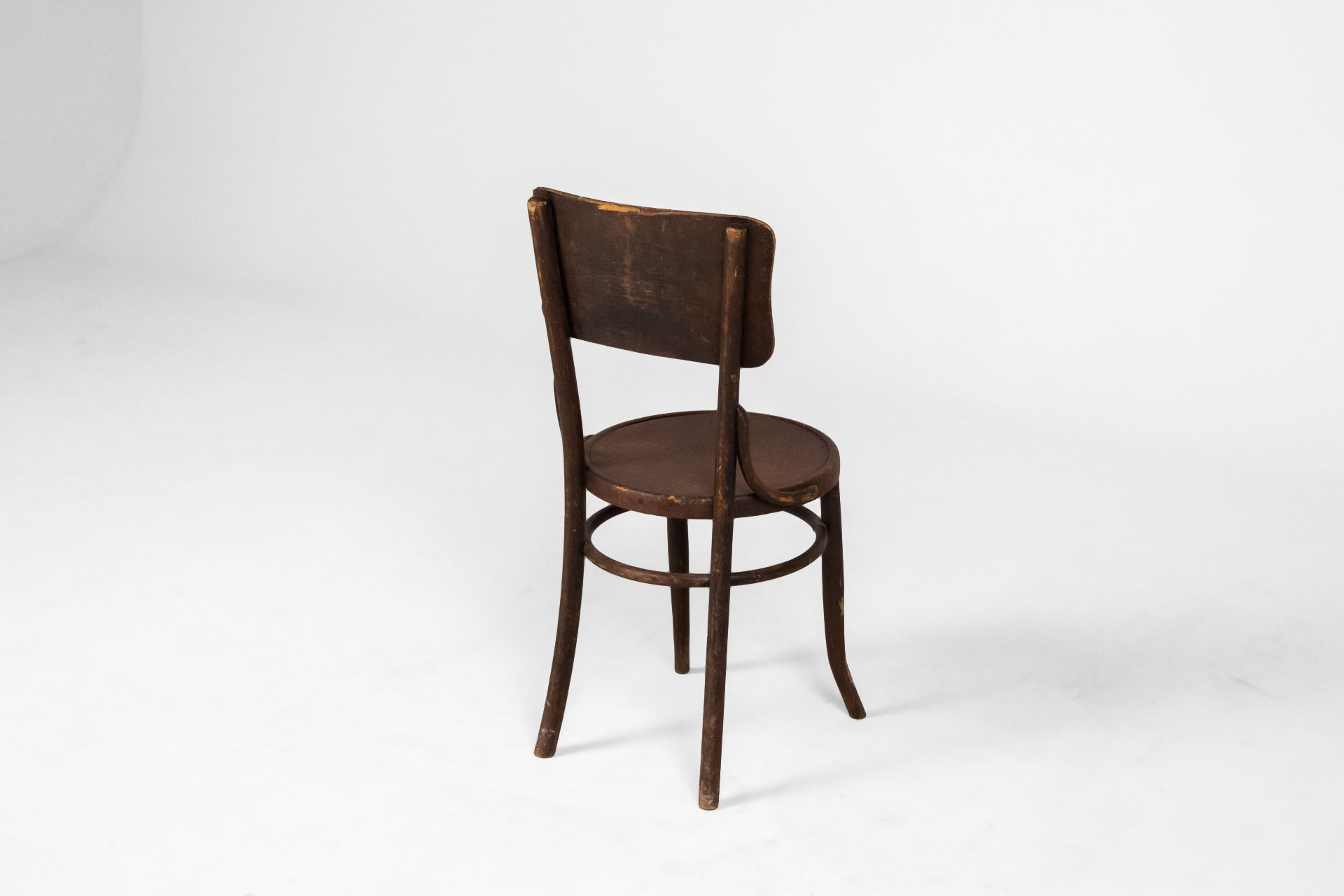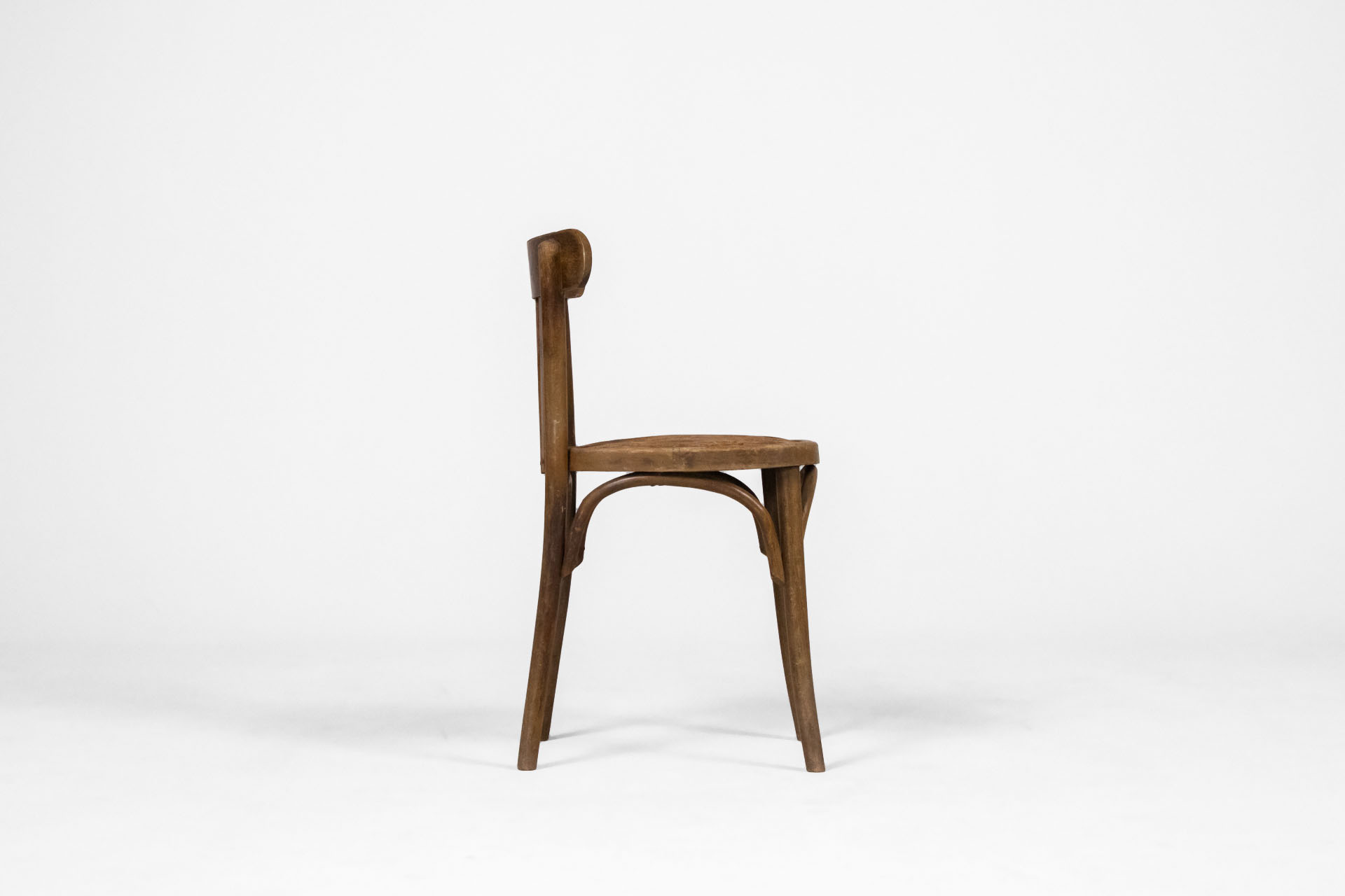 Egyszerű, de elegáns vintage fa szék, klasszikus formával és kényelmes kerek ülőfelülettel. A szék hátoldala enyhén ívelt, ami fokozza a kényelmet és a stílust