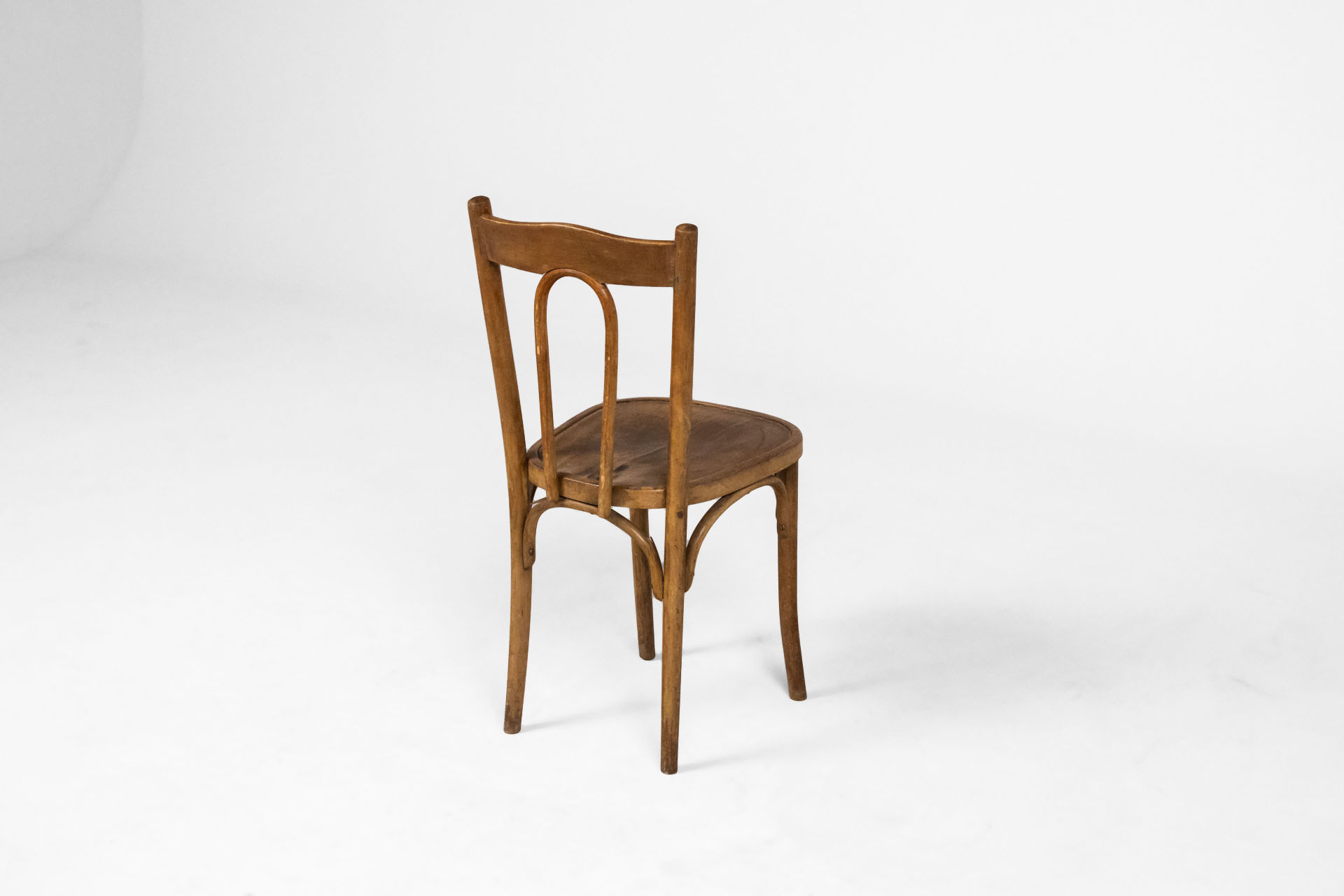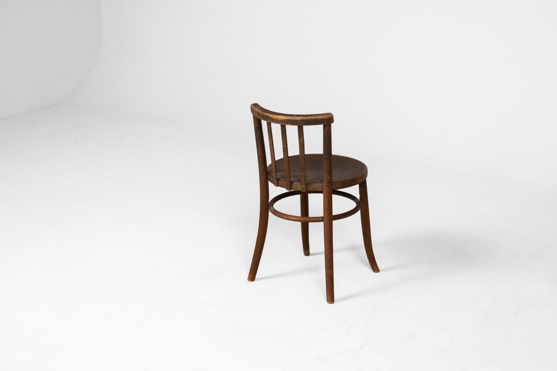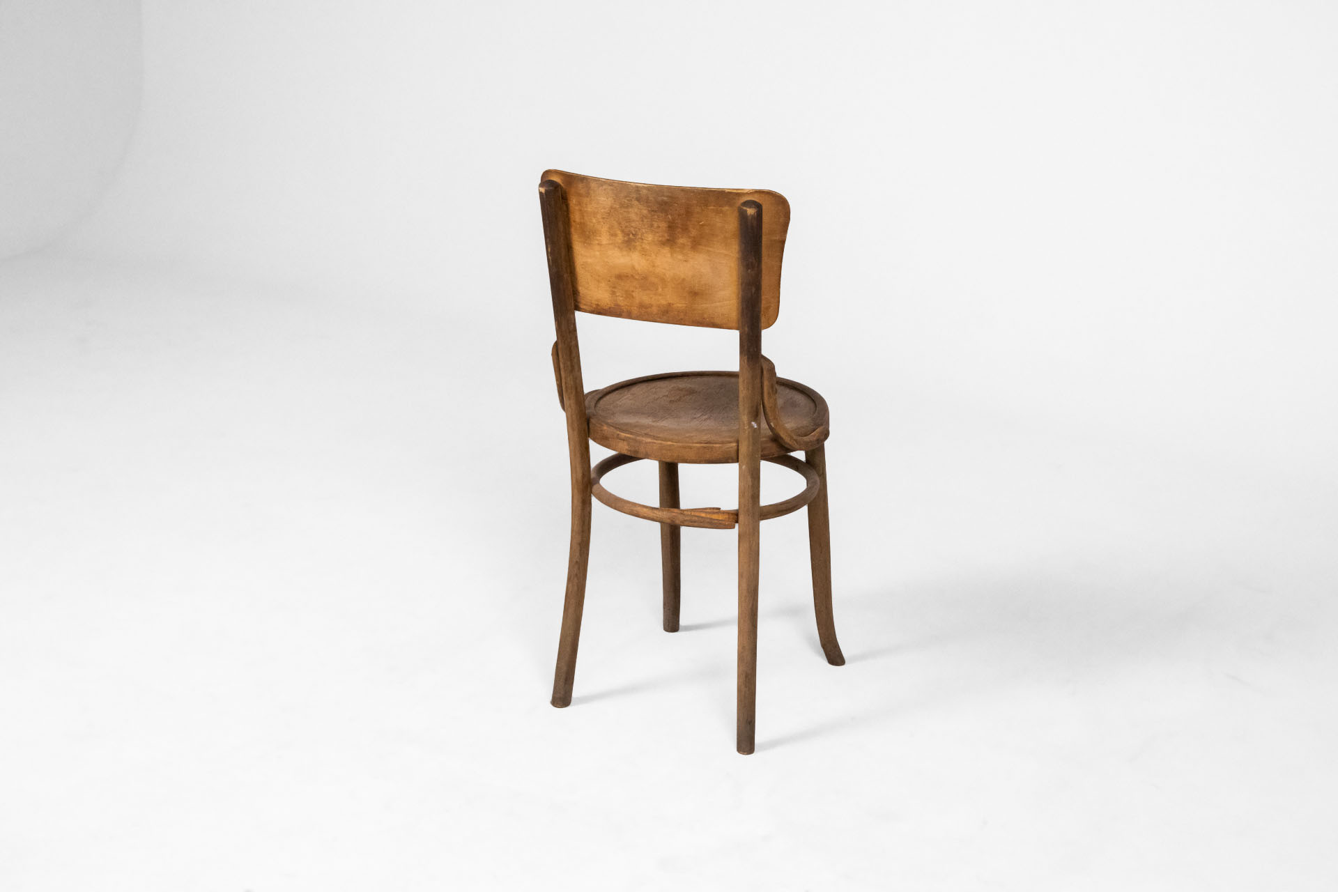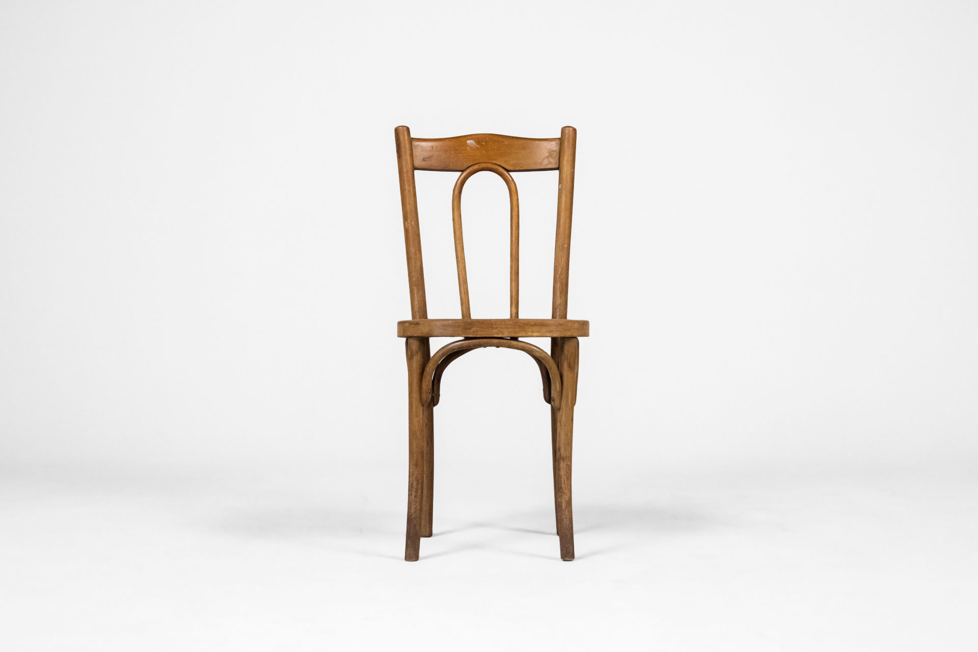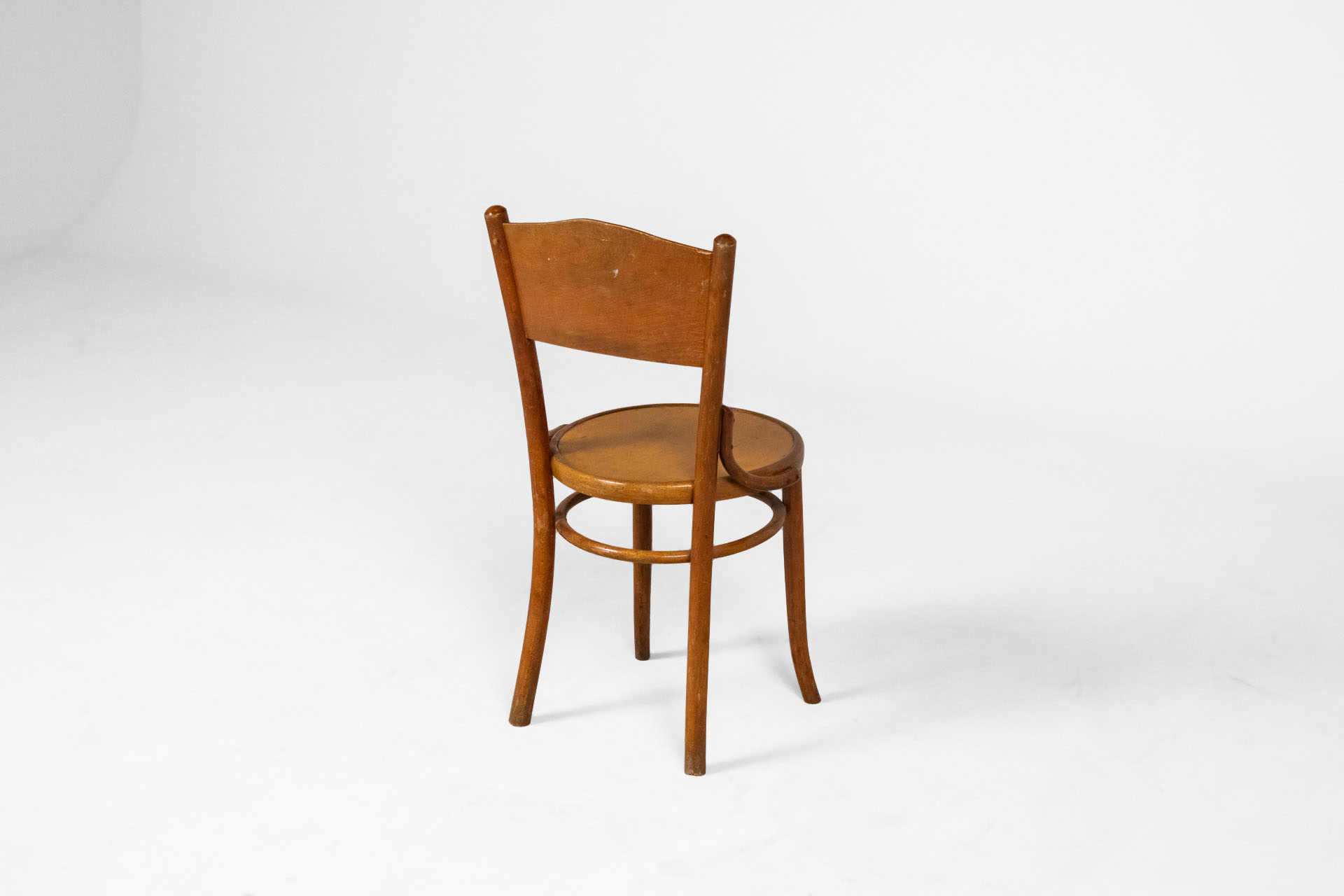 Egyszerű, de elegáns vintage fa szék, klasszikus formával és kényelmes kerek ülőfelülettel. A szék hátoldala enyhén ívelt, ami fokozza a kényelmet és a stílust