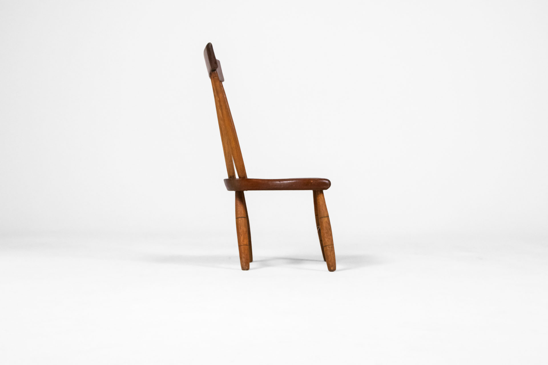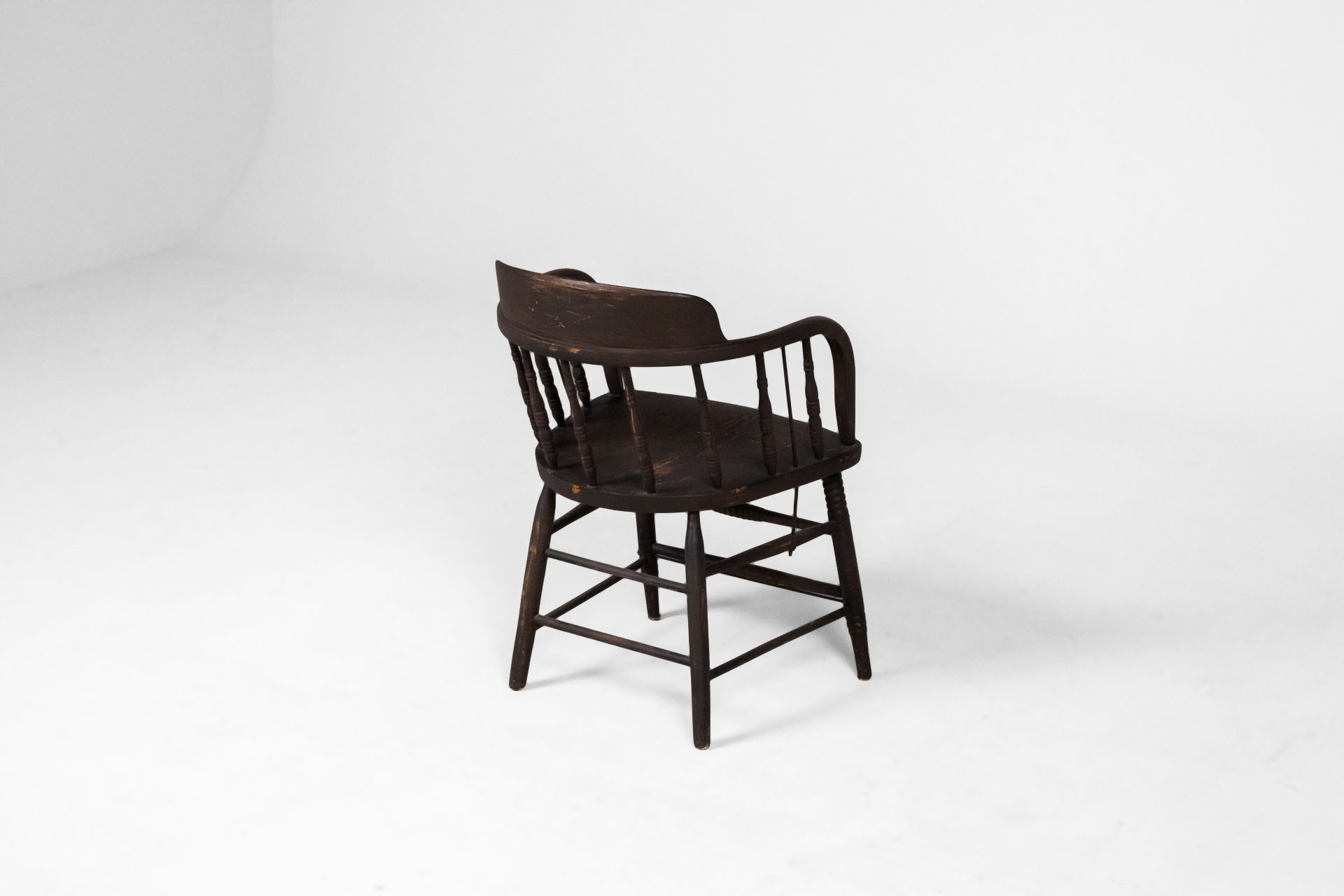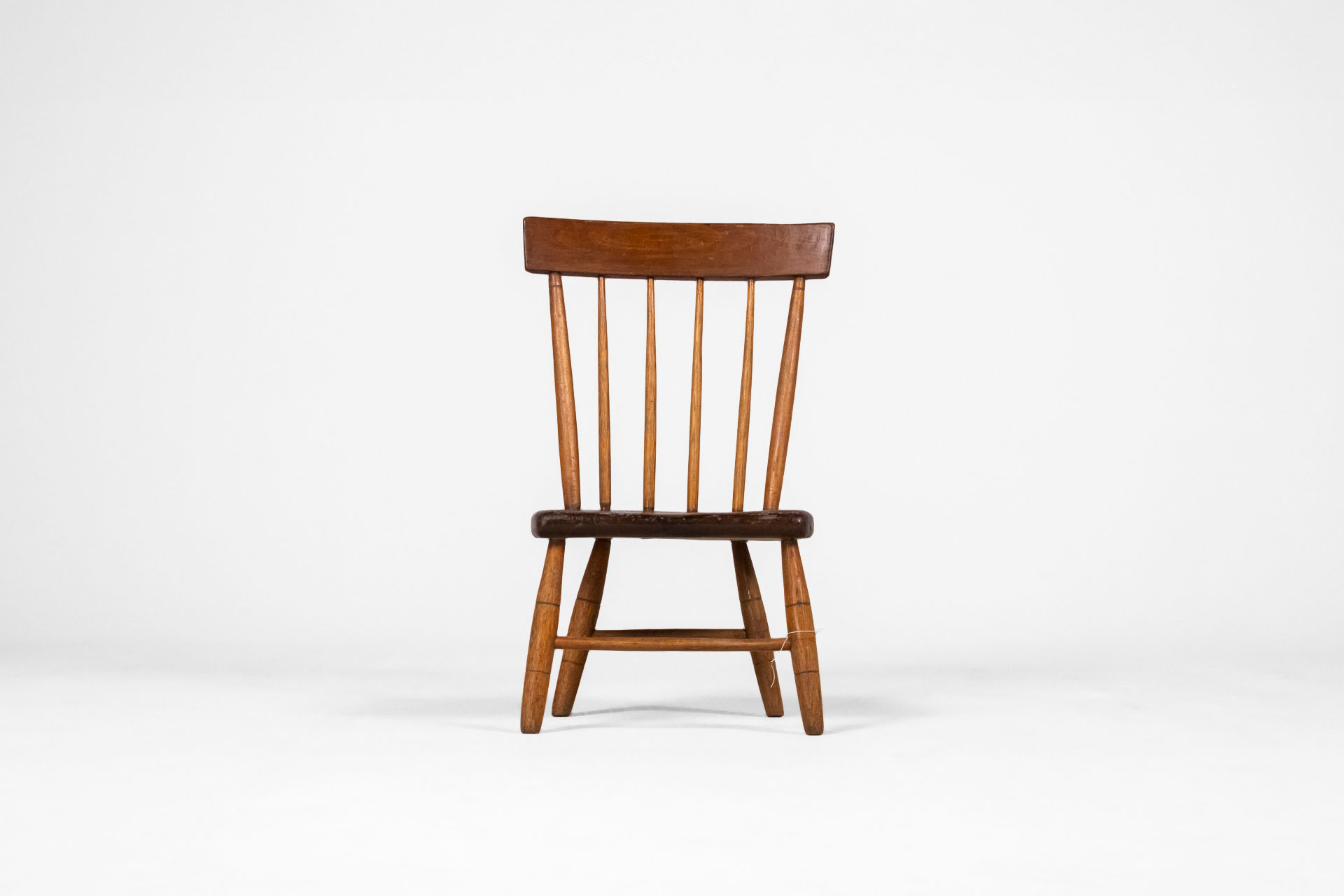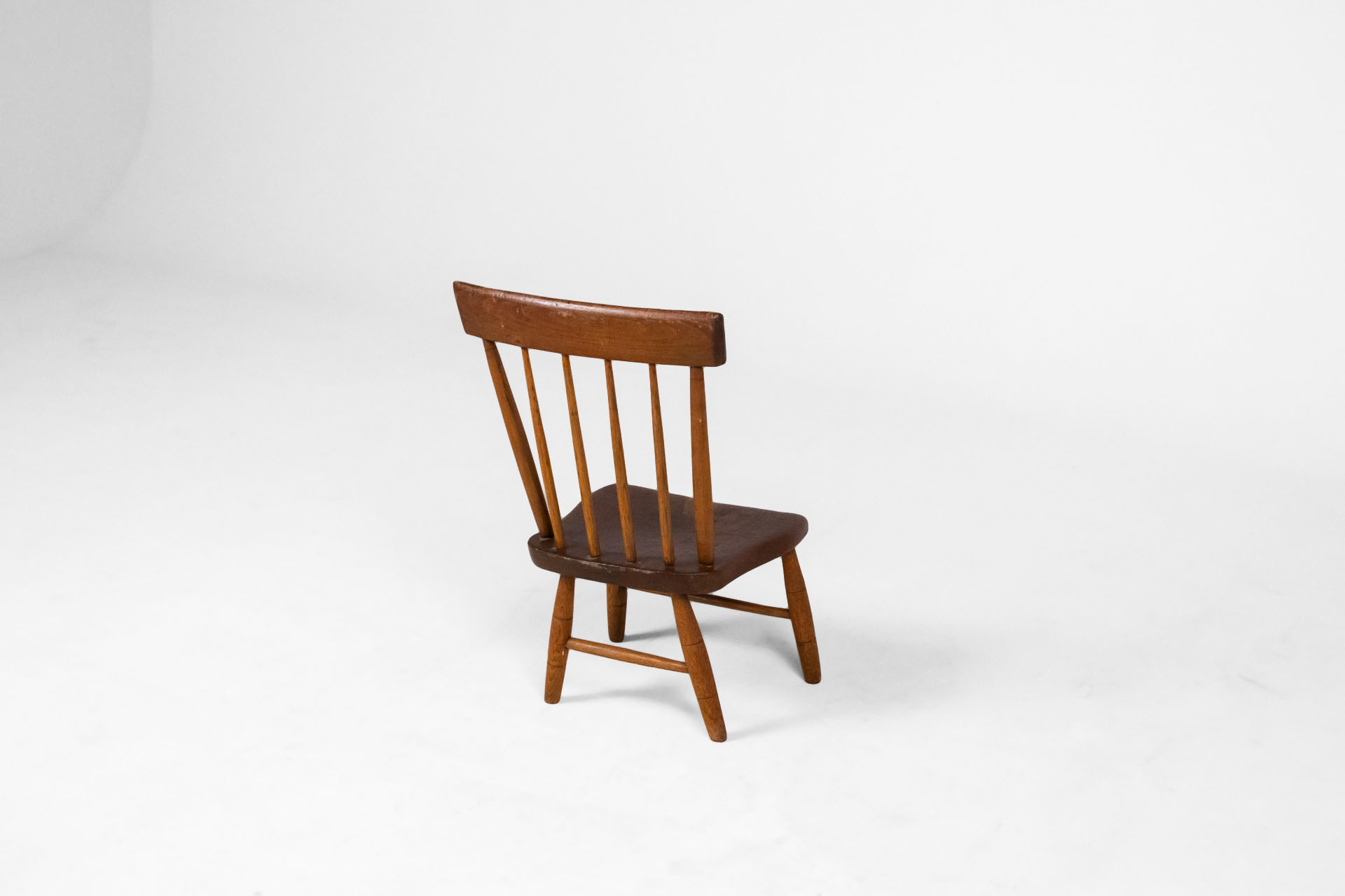 Egyszerű, de elegáns dizájnú, vintage stílusú szék, amely fából készült, hátulján függőleges rácsokkal és lekerekített ülőfelülettel rendelkezik. A szék alacsony ülőfelülettel és magasított háttámlával rendelkezik