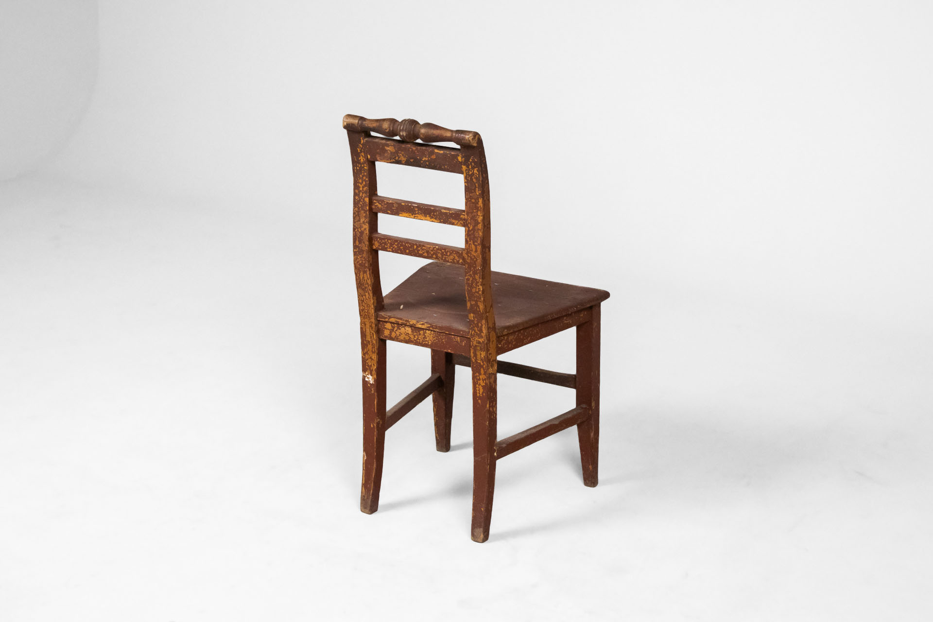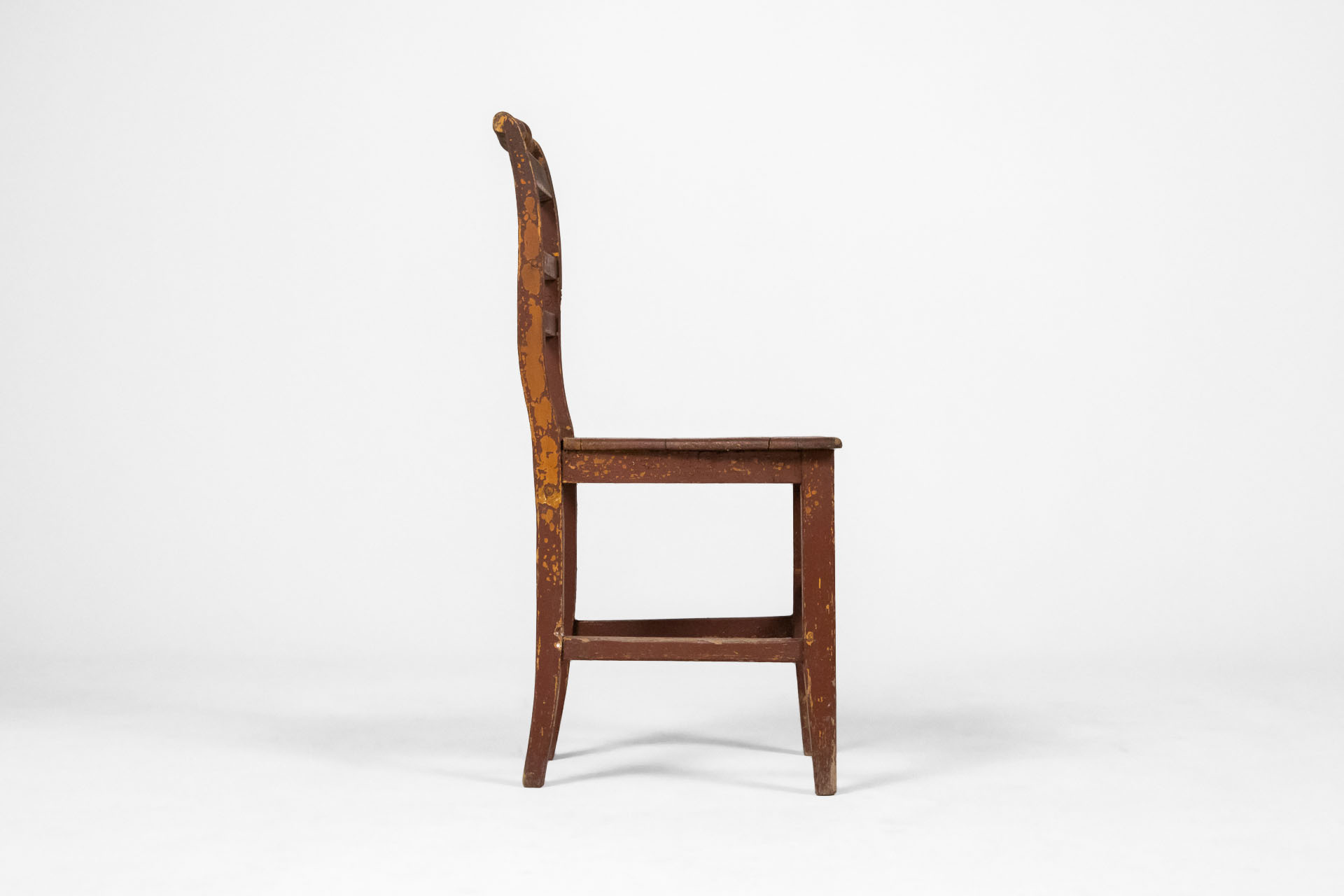 Klasszikus, antik stílusú, vörös festékkel bevont fa szék, amely időtálló, rusztikus megjelenést kölcsönöz. A szék háttámláján három díszes rúd található, míg a lábak esztergáltak, egyedi stílust biztosítva