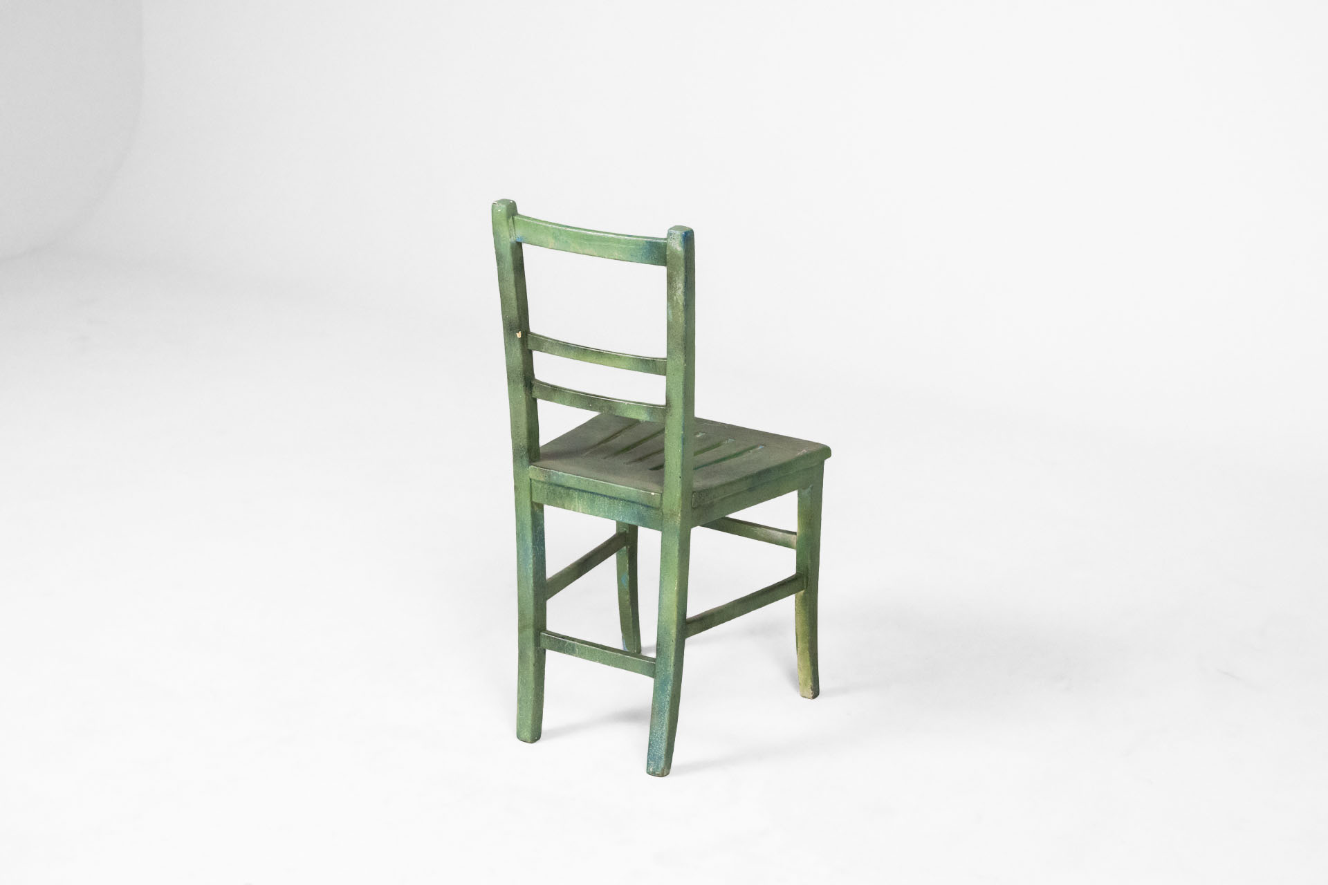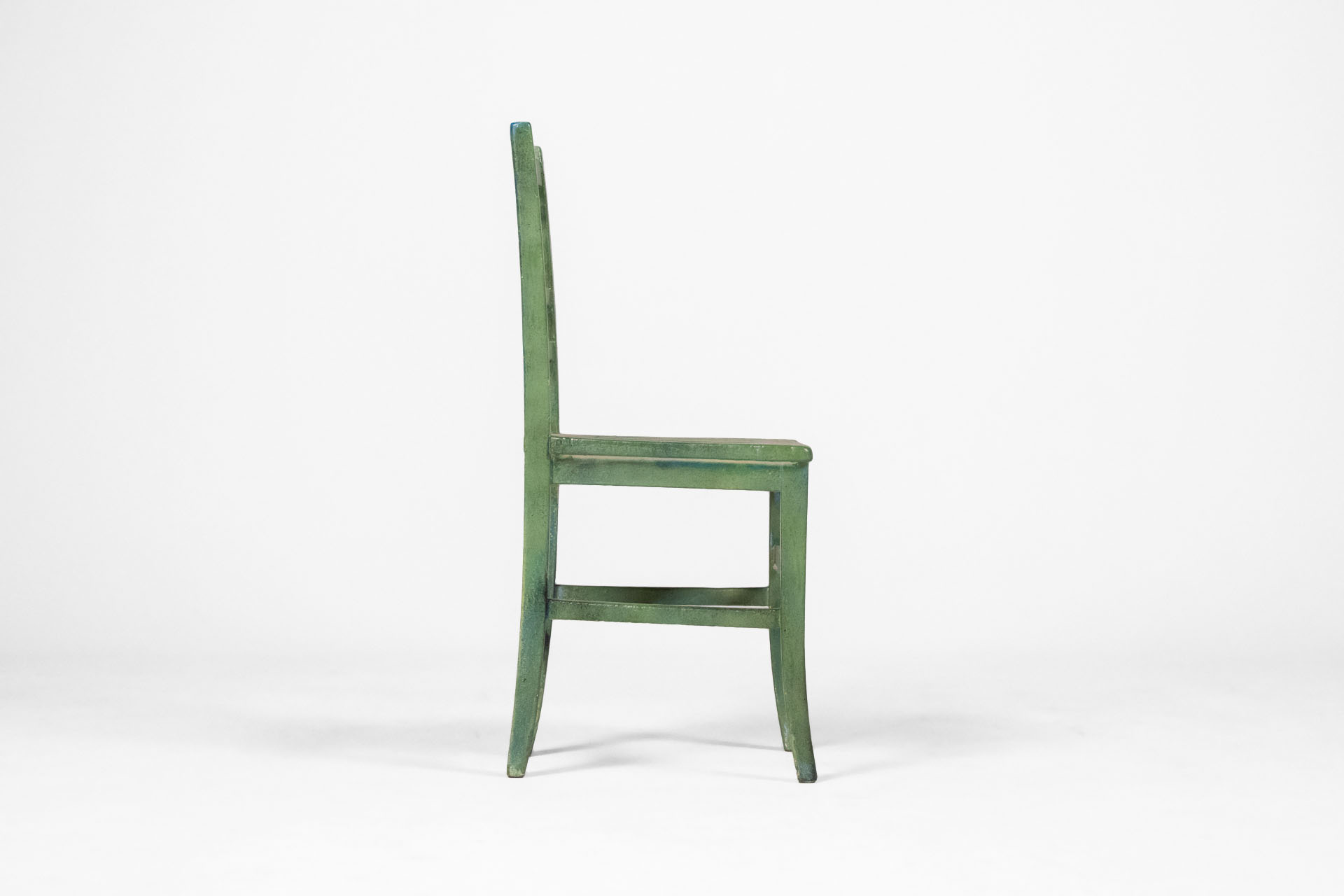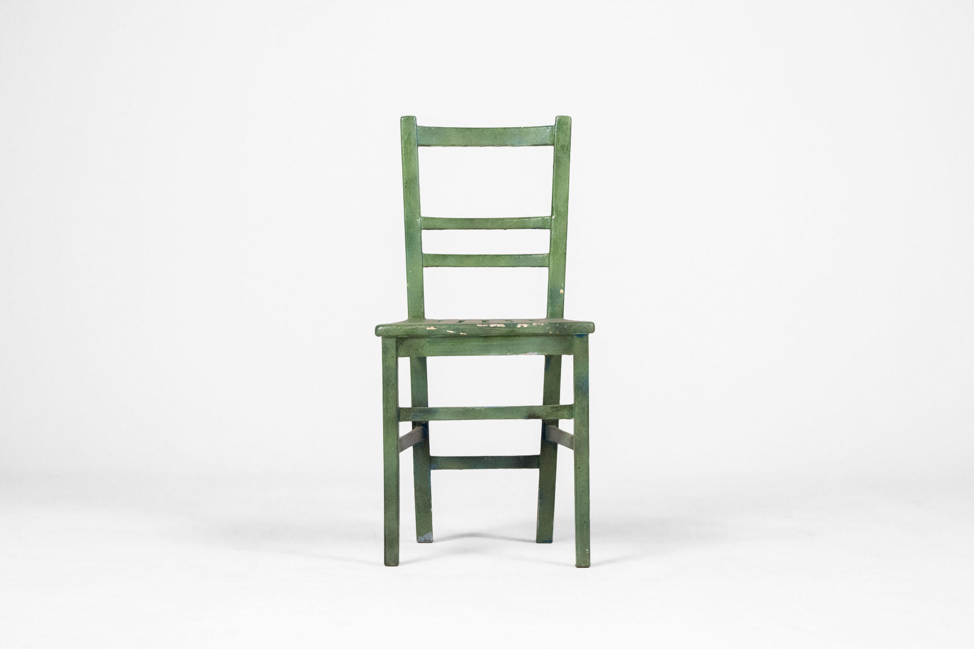 Egyszerű, rusztikus stílusú fa szék, zöld színű festékkel bevonva, klasszikus négy lábú kialakítással és csíkos ülőfelülettel