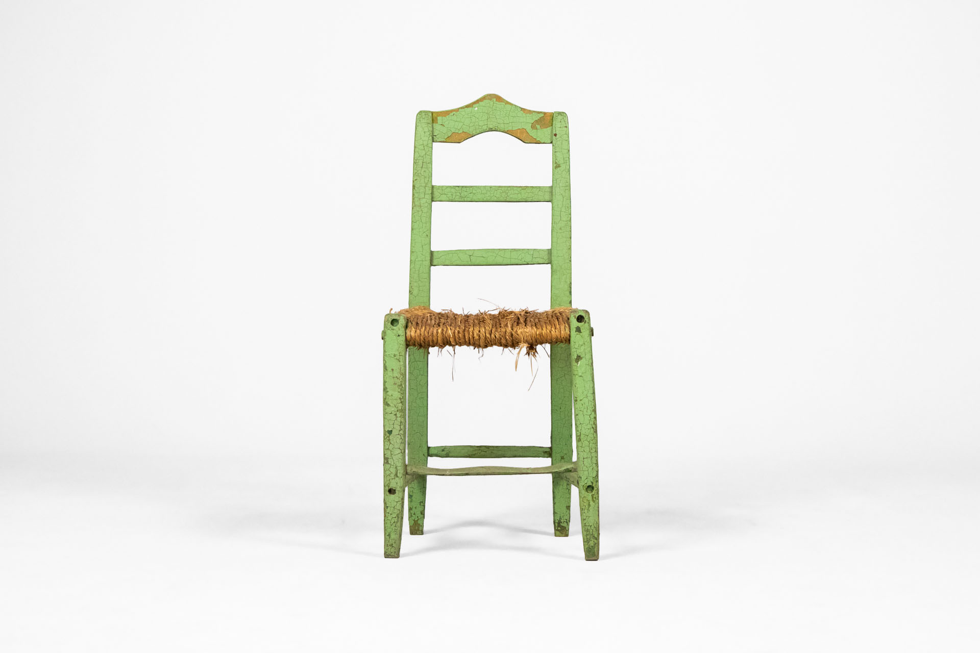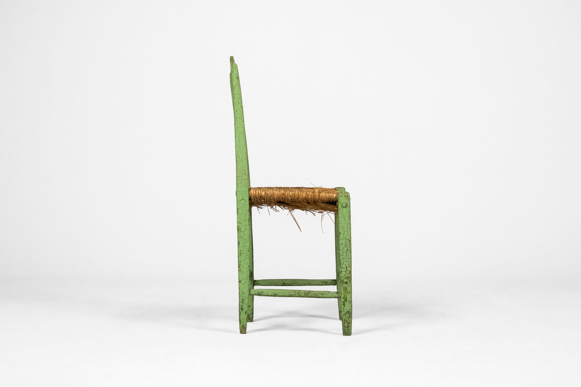 Rusztikus stílusú, zöld festékkel bevont szék, természetes fonott ülőfelülettel. A szék egyszerű, de karakteres formájával és vintage megjelenésével tökéletes kiegészítője lehet bármely vidéki vagy retro hangulatú térnek