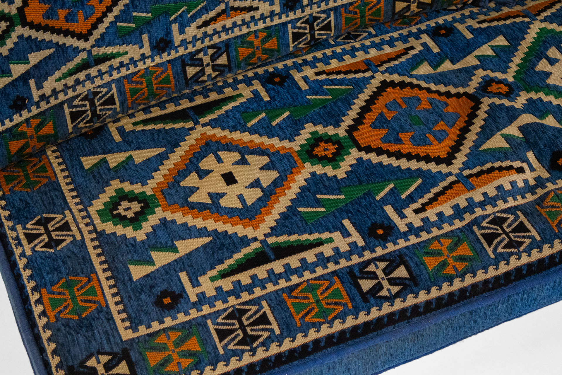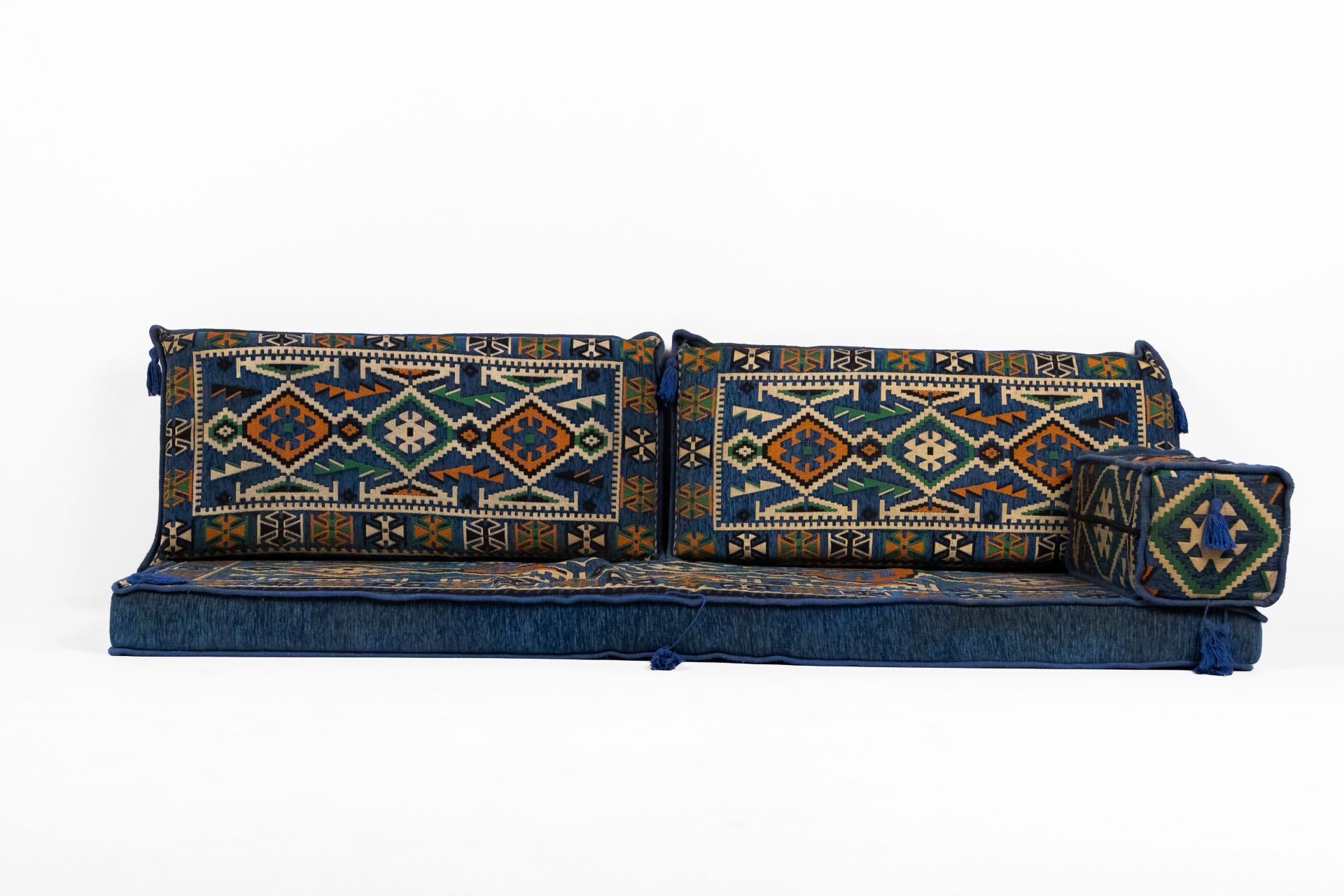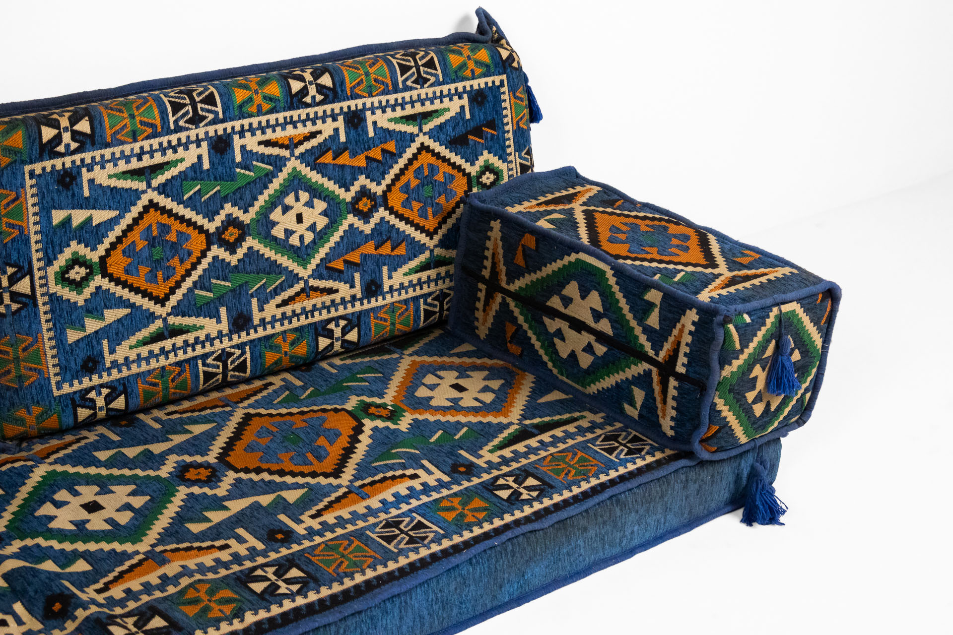 Tradicionális stílusú, kézi szövésű kanapé matrac és párna, gazdag színvilággal és geometrikus mintákkal. A matrac kényelmes háttámlával és puha ülőfelülettel rendelkezik, amely ideális pihenésre és társasági eseményekre