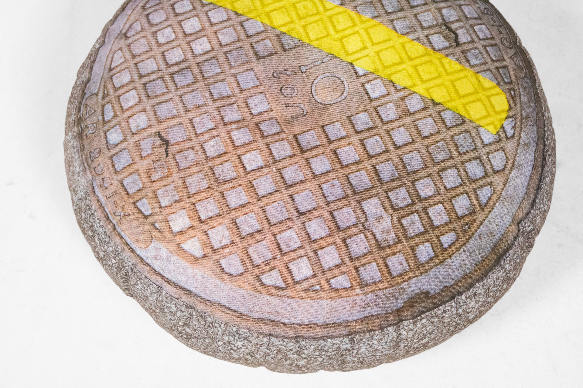 Csatornafedél hatású puff, amely texturált felülettel és élénk sárga jelöléssel rendelkezik. A beton hatású felület játékos, míg a lekerekített forma modern és funkcionális megjelenést kölcsönöz