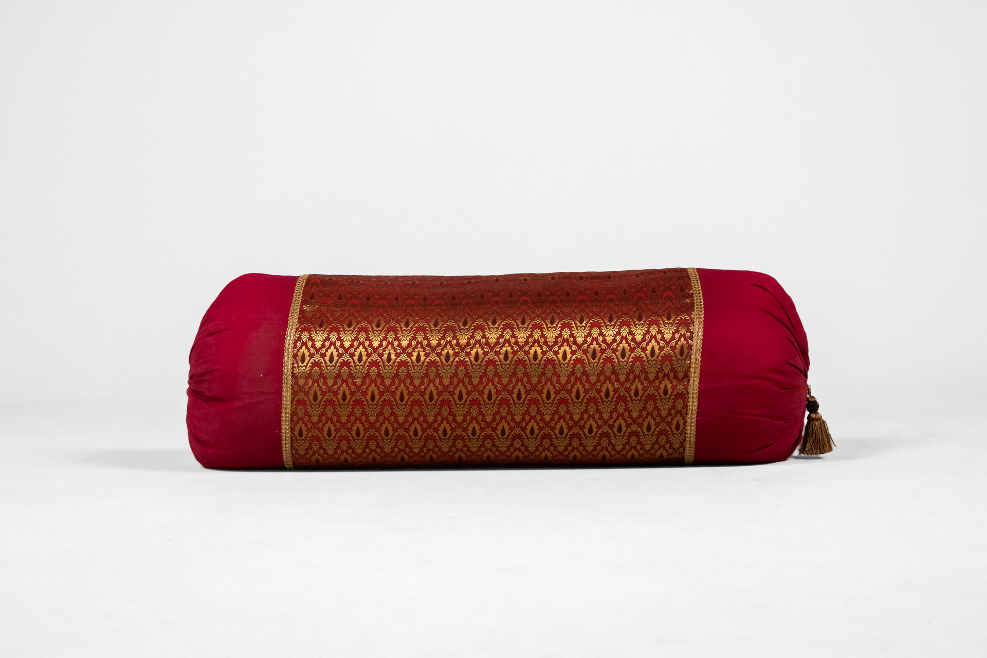 Elegáns, henger alakú díszpárna, gazdagon díszített arany mintázattal, piros színű, puha tapintású anyagból készült. A párna végén arany bojt található