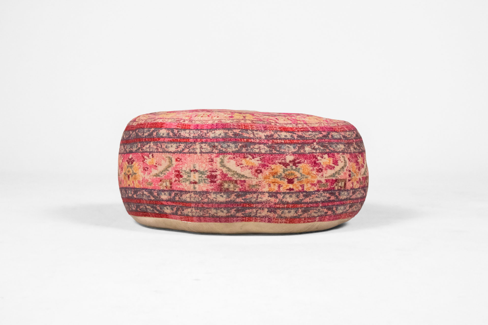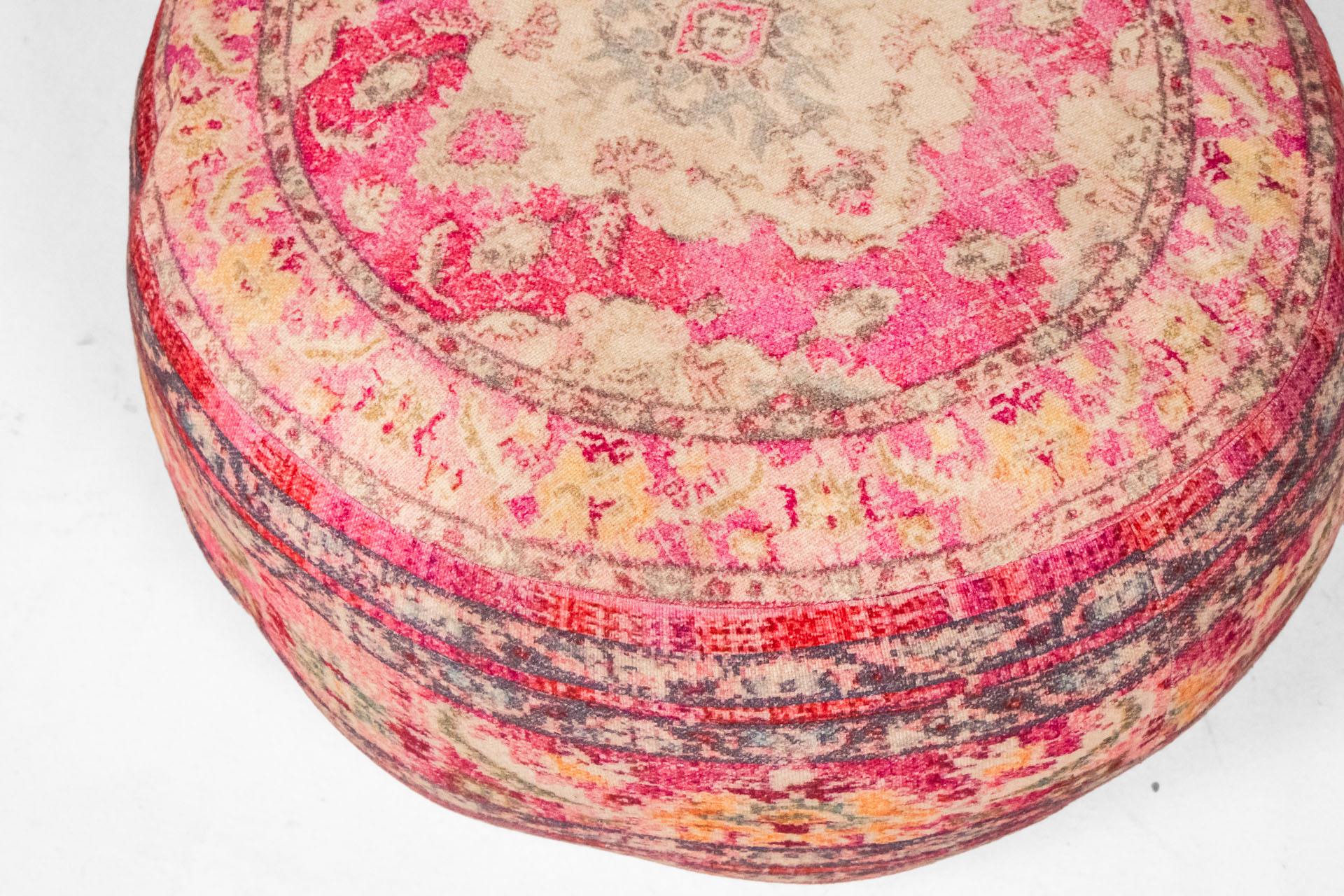Kényelmes, kerek puff, amely vintage stílusú, gazdagon díszített szőnyegmintázattal rendelkezik. A puha, párnázott felület ideális ülőalkalmatosságként vagy lábtartóként szolgál