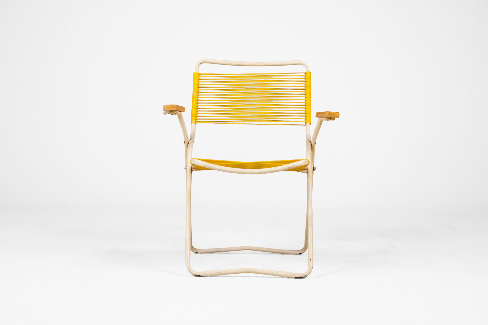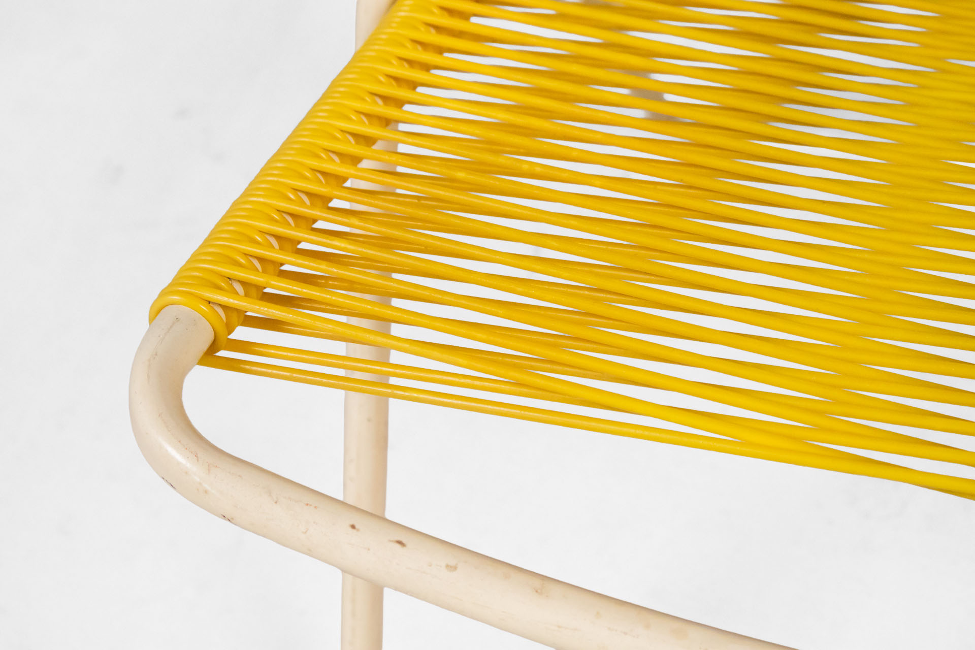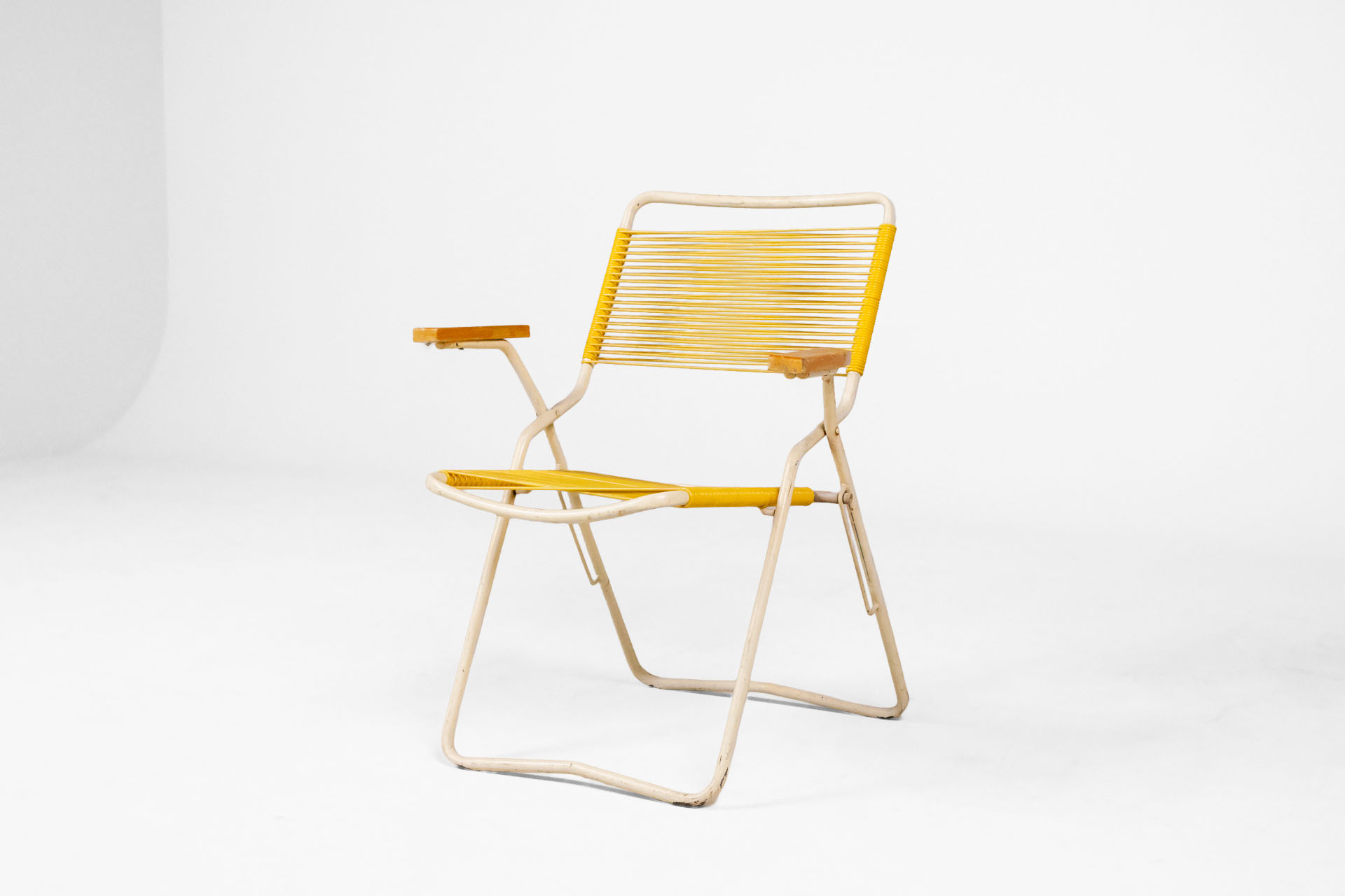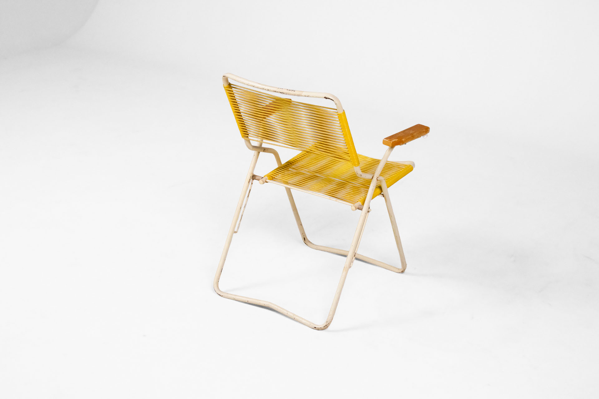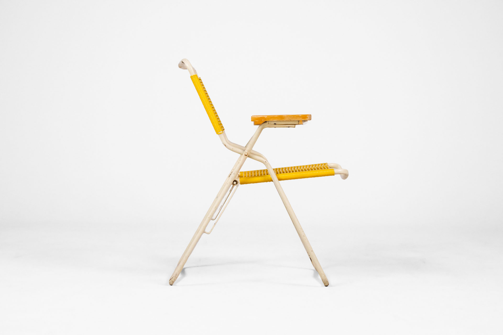 Modern, könnyű kempingszék, amely fém vázra épül, sárga műanyag szálakkal borított ülőrésszel és háttámlával. Az ergonomikus formatervezés és a karfák kényelmes ülést biztosítanak, ideális kültéri vagy beltéri használatra