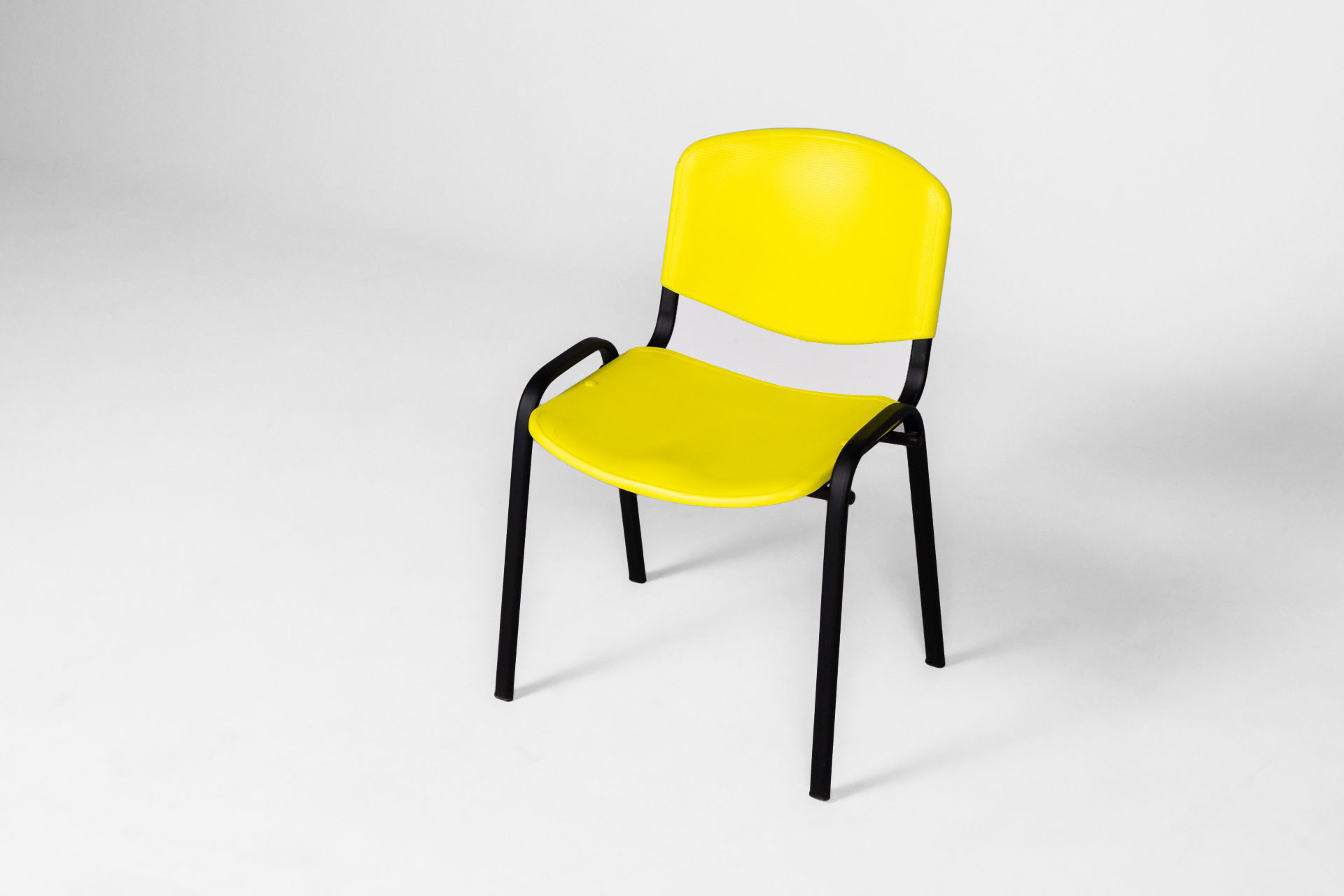 Élénk sárga műanyag szék, fekete fém lábakkal.