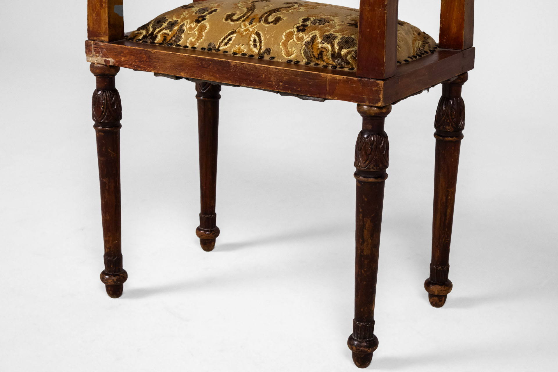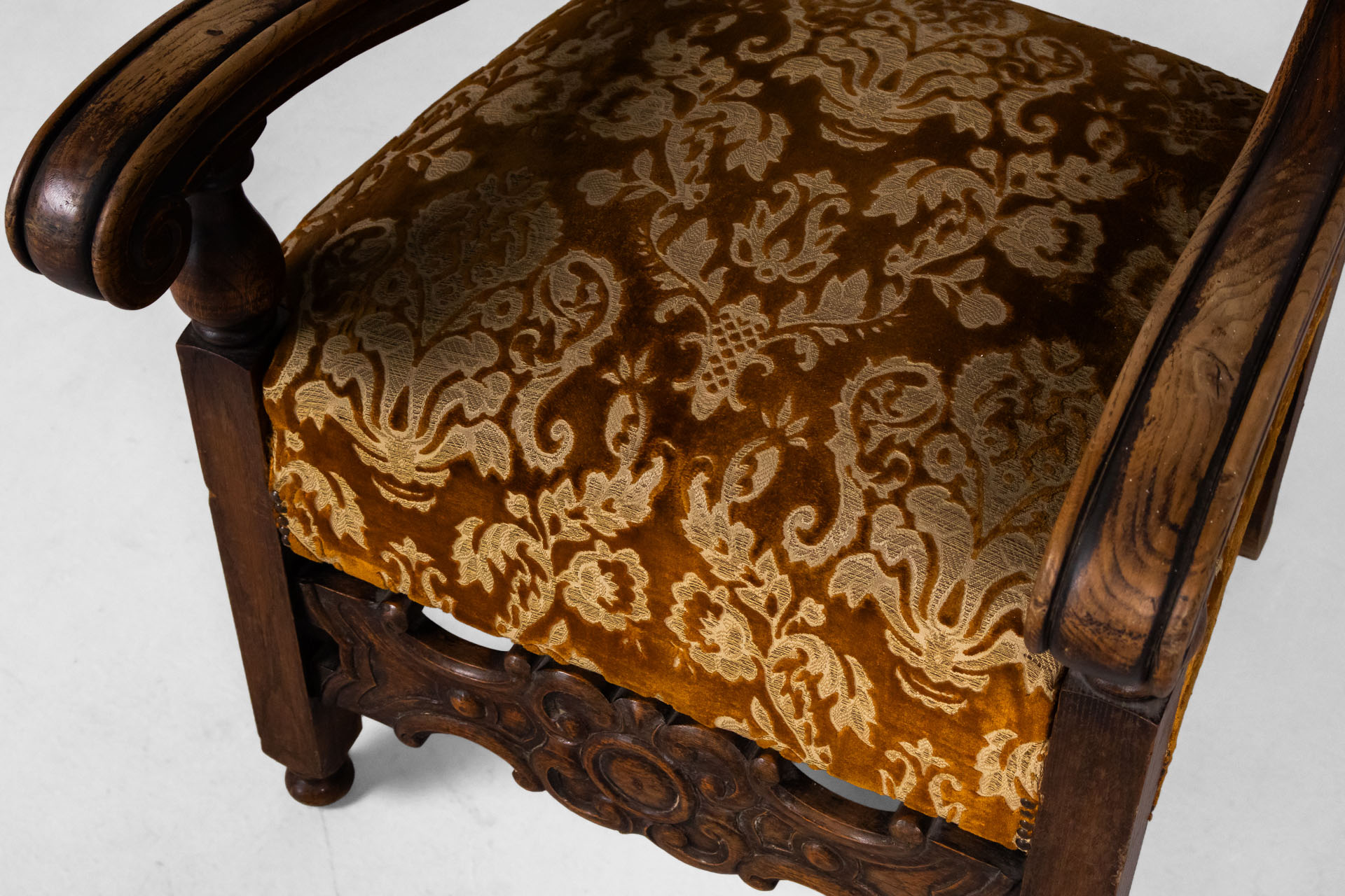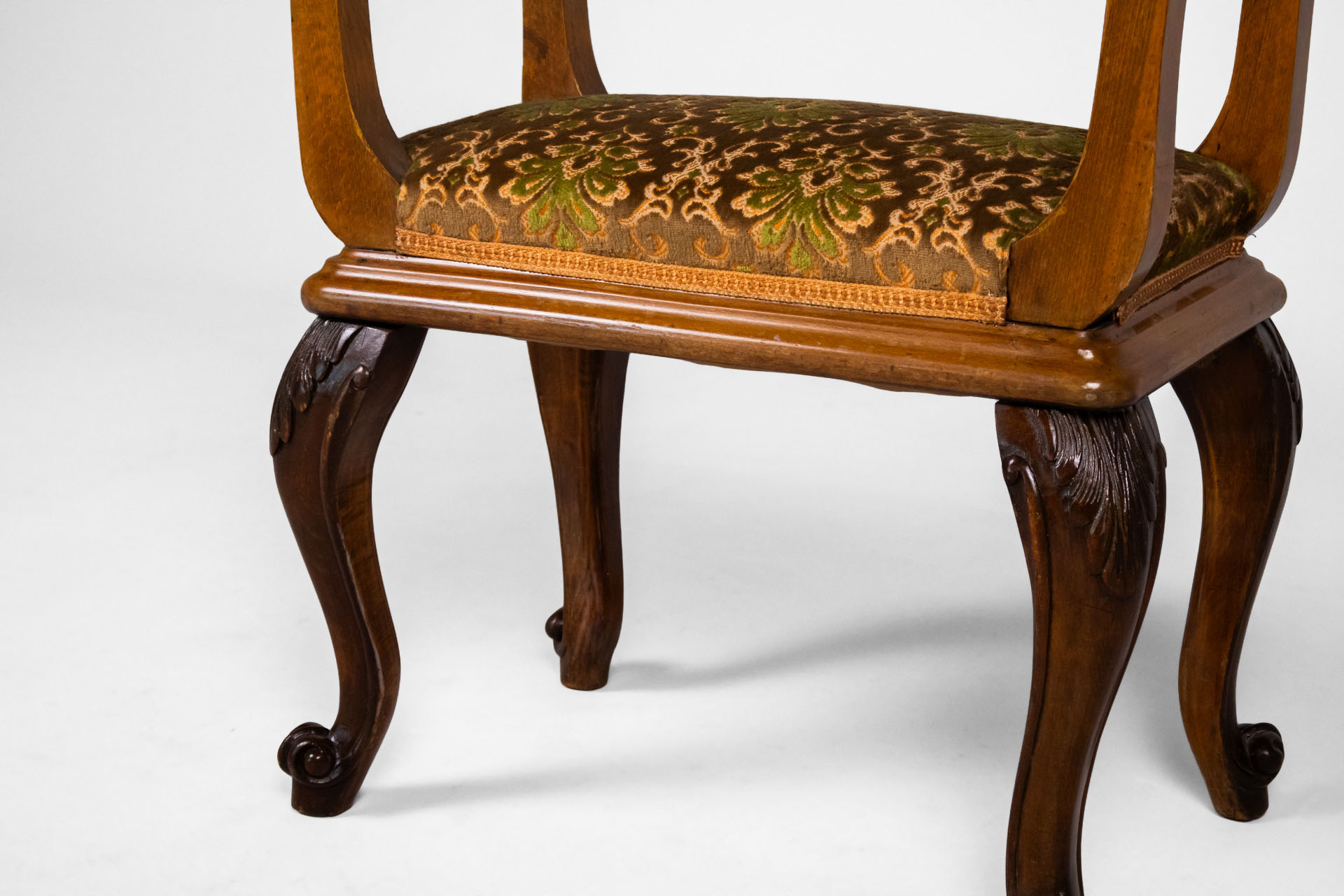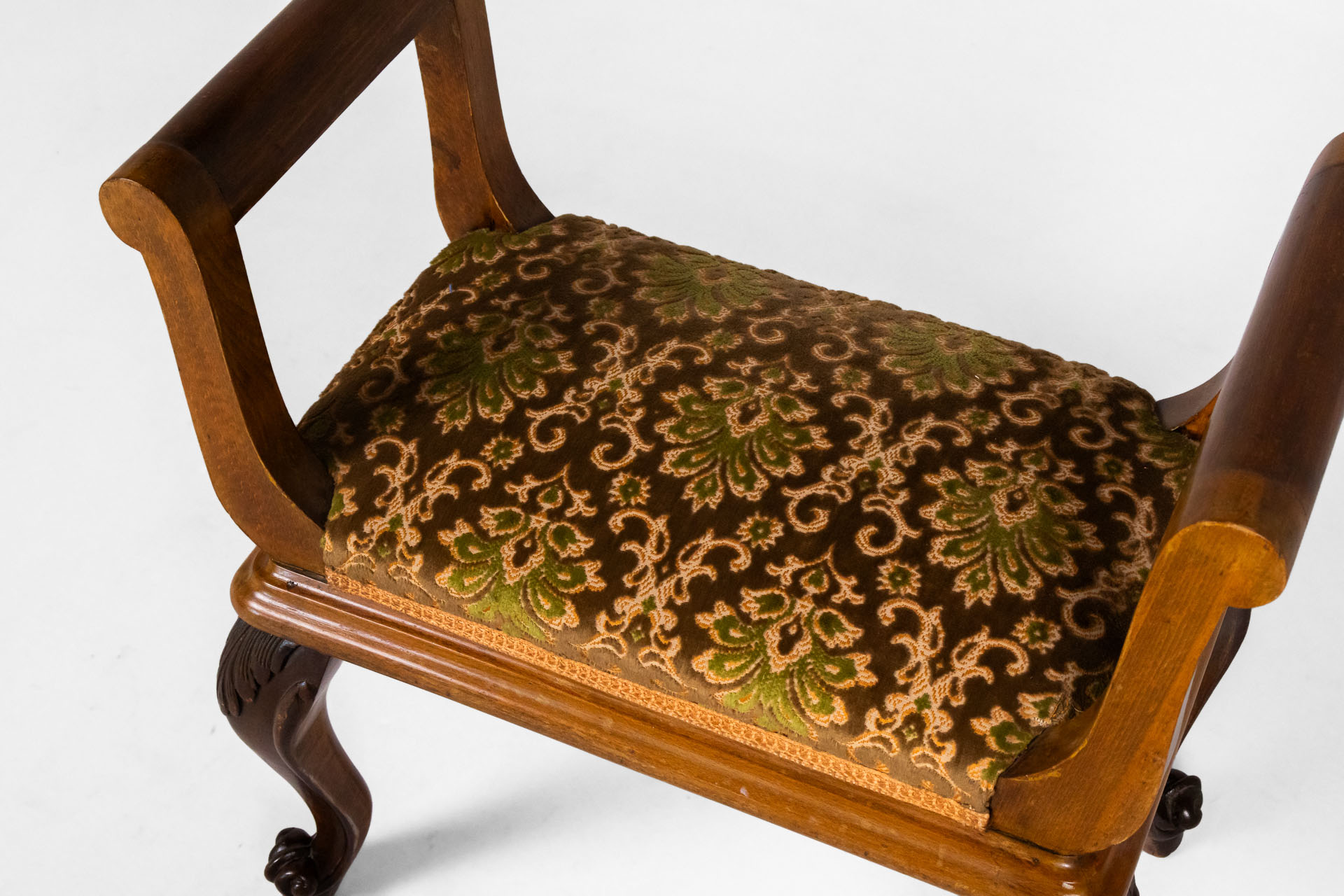 Elegáns, klasszikus stílusú karosszék, ívelt karfákkal és díszes, aranyszínű szövetkárpittal. A masszív fa szerkezet és a finoman esztergált lábak időtlen megjelenést biztosítanak, ideális választás bármely vintage...