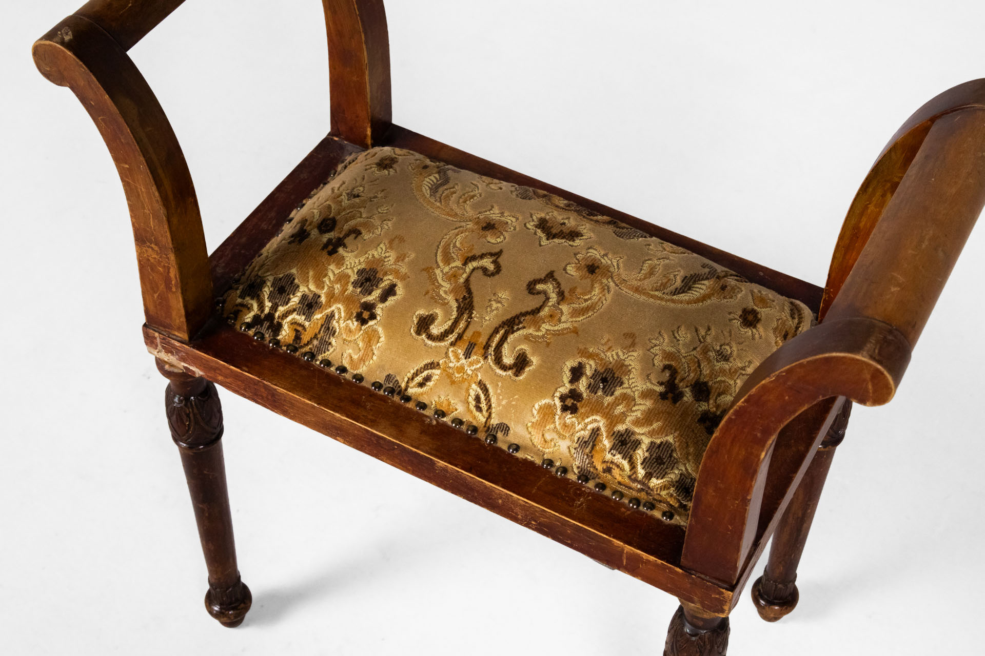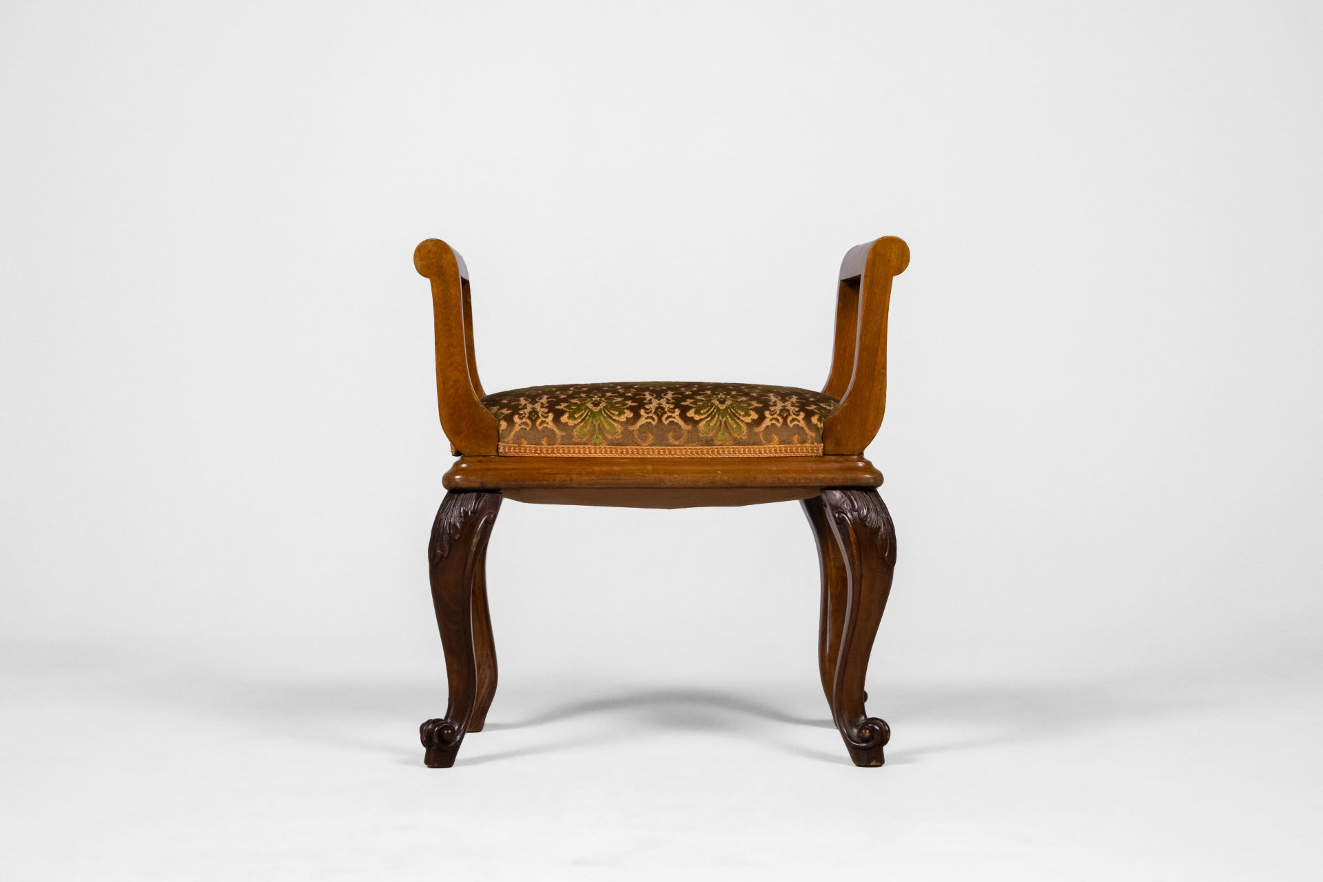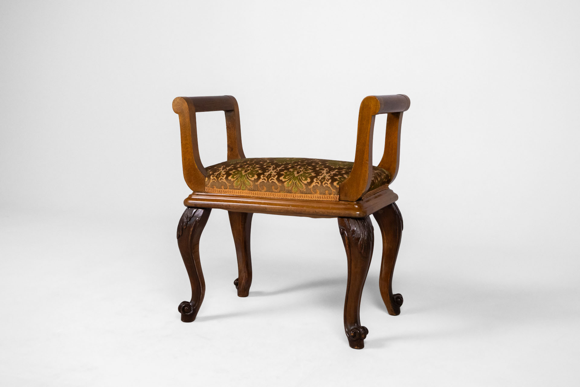 Elegáns, antik stílusú puff, masszív fából készült kerettel, díszes ülőfelülettel és ívelt karfákkal. A puff lábai faragott részletekkel díszítettek, ami különleges karaktert ad a bútornak. Ideális választás vintage...