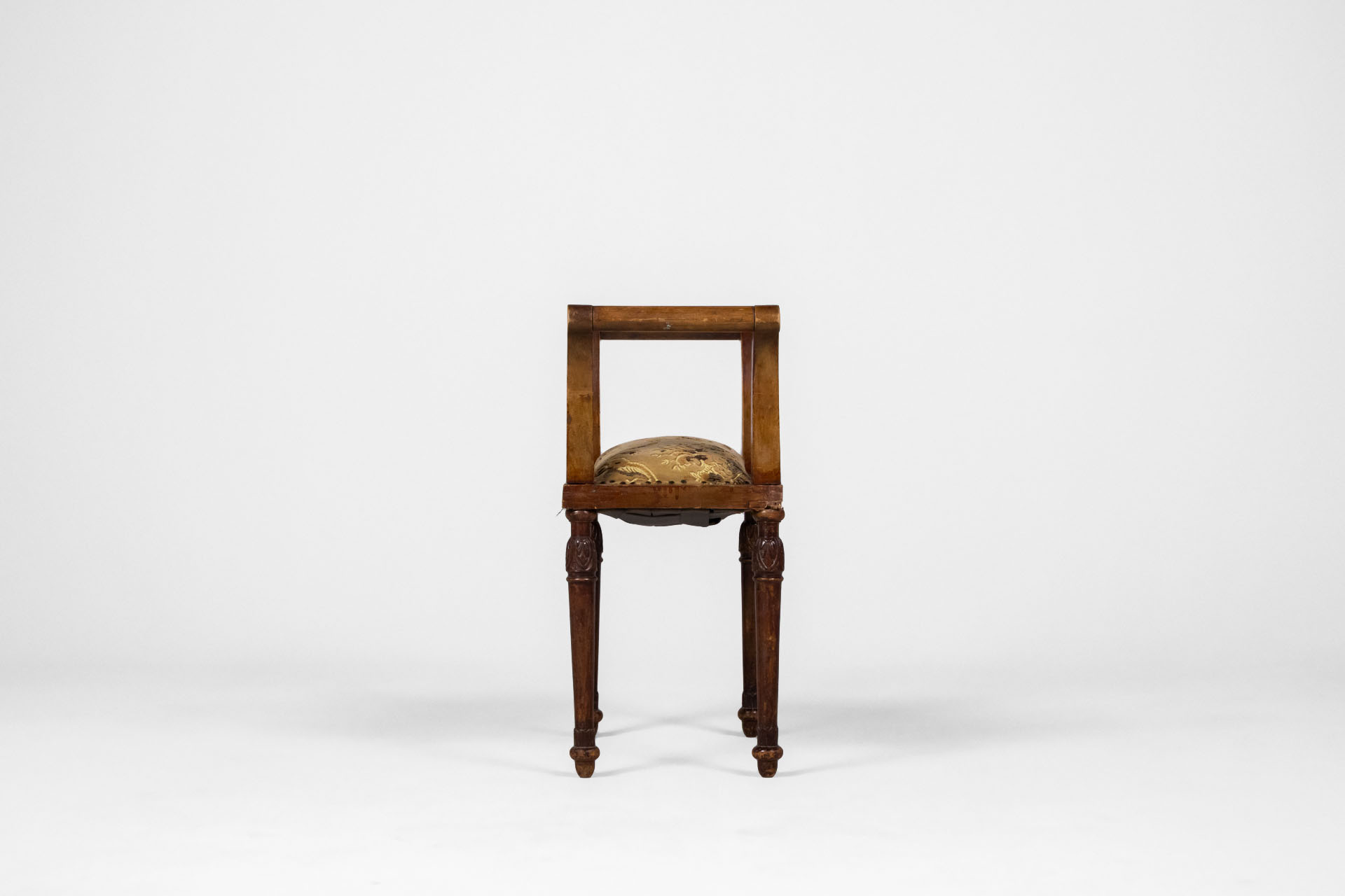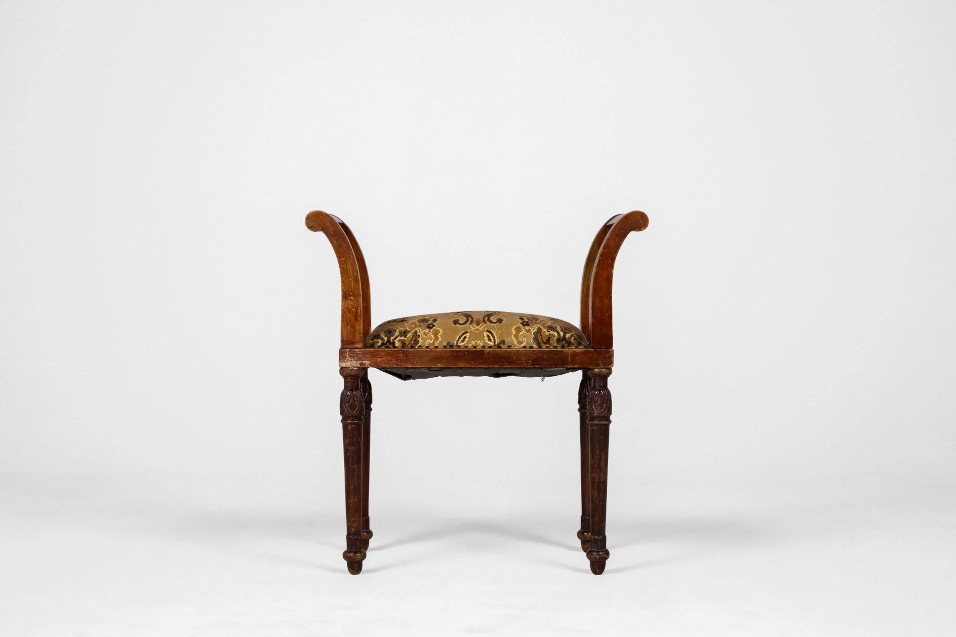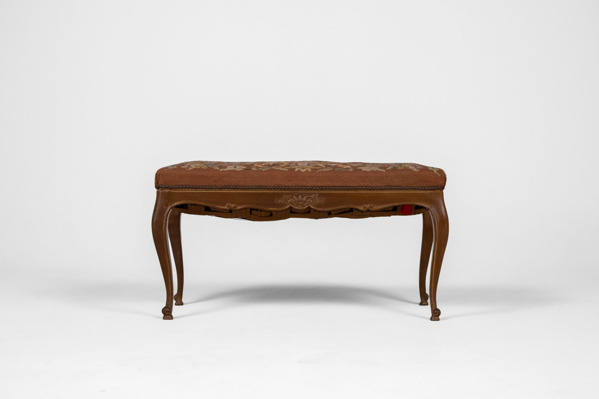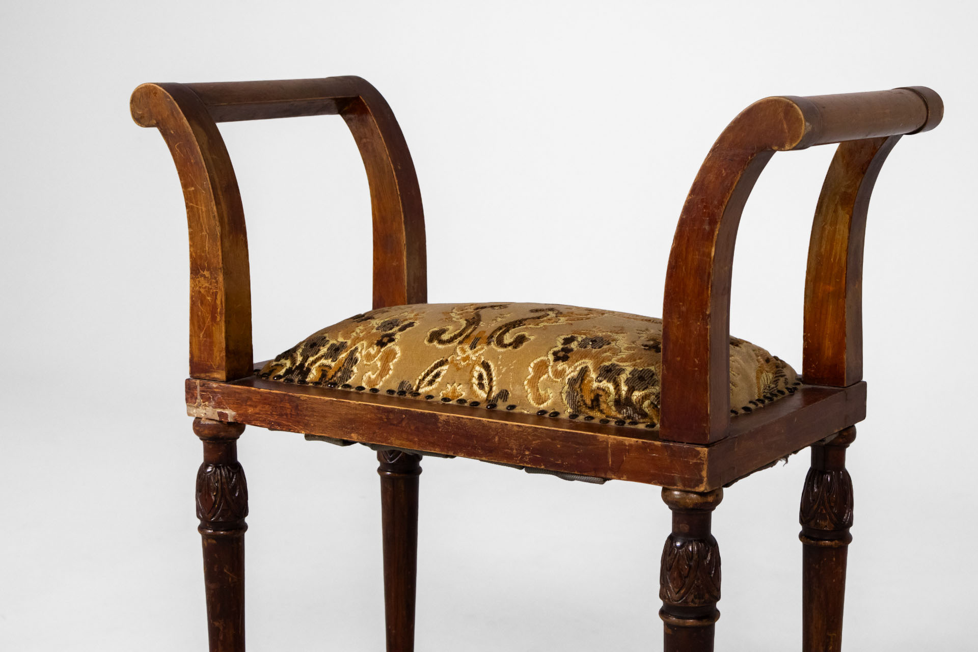 Elegáns, antik stílusú puff, masszív fából készült kerettel, díszes ülőfelülettel és ívelt karfákkal. A puff lábai faragott részletekkel díszítettek, ami különleges karaktert ad a bútornak. Ideális választás vintage...