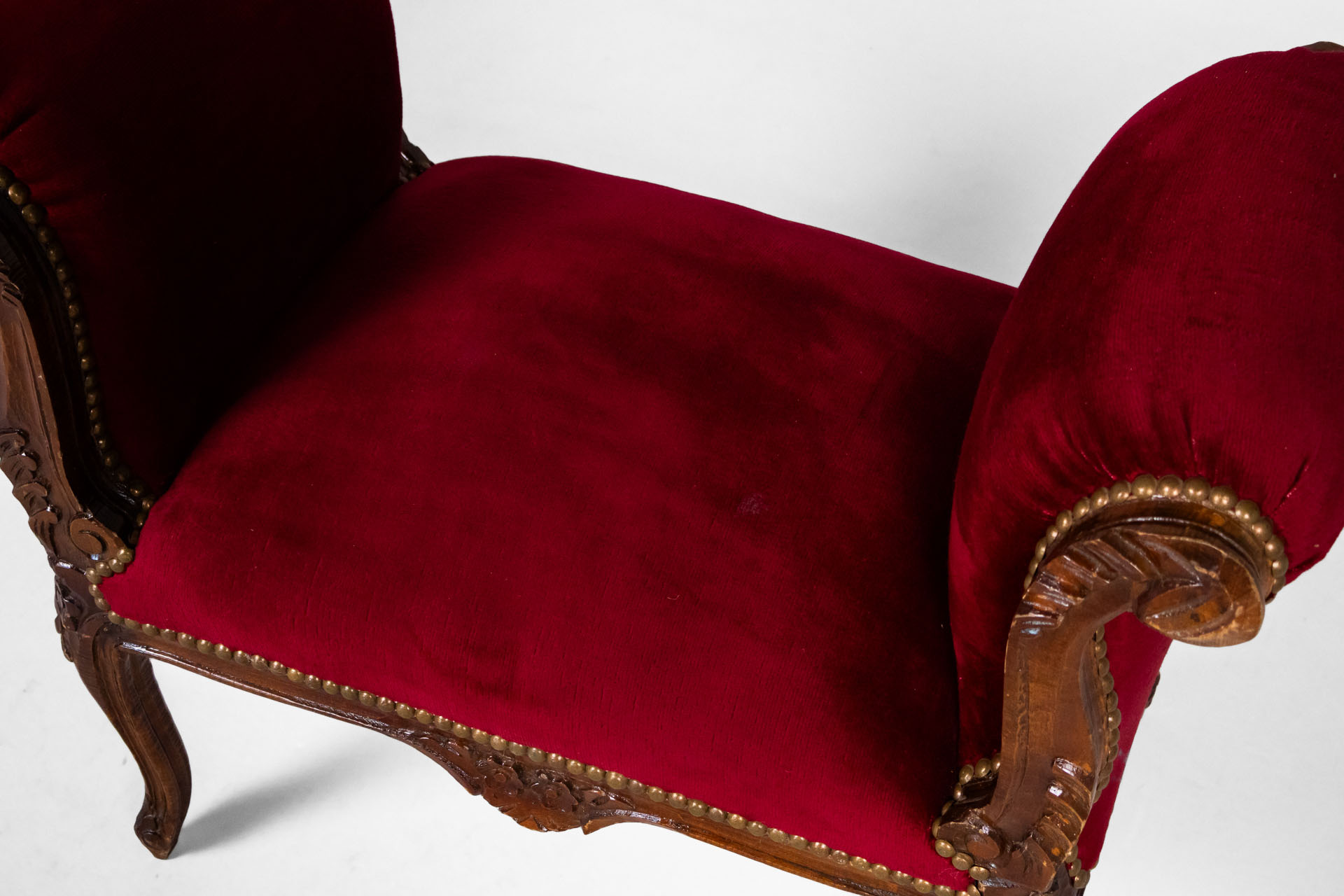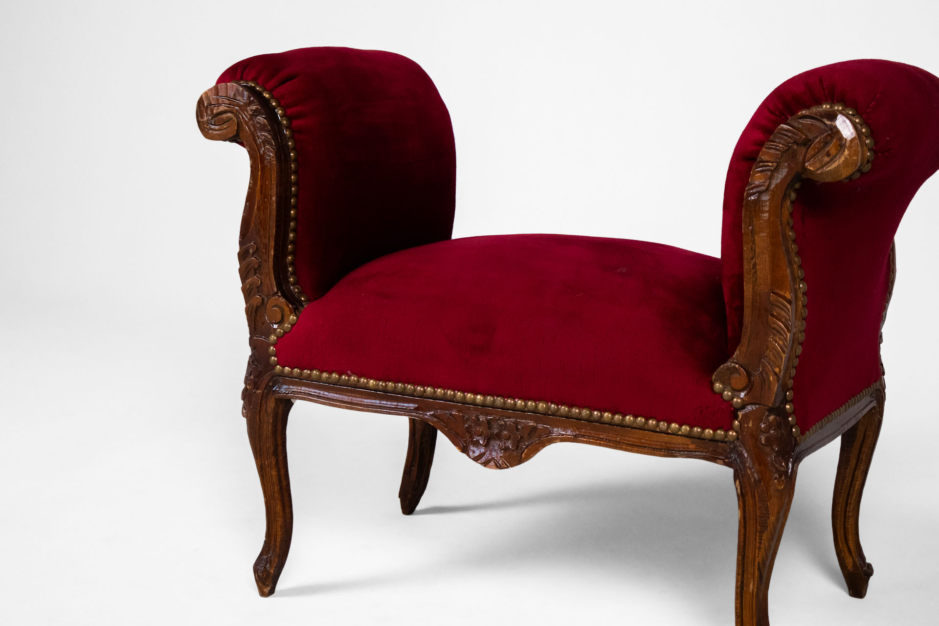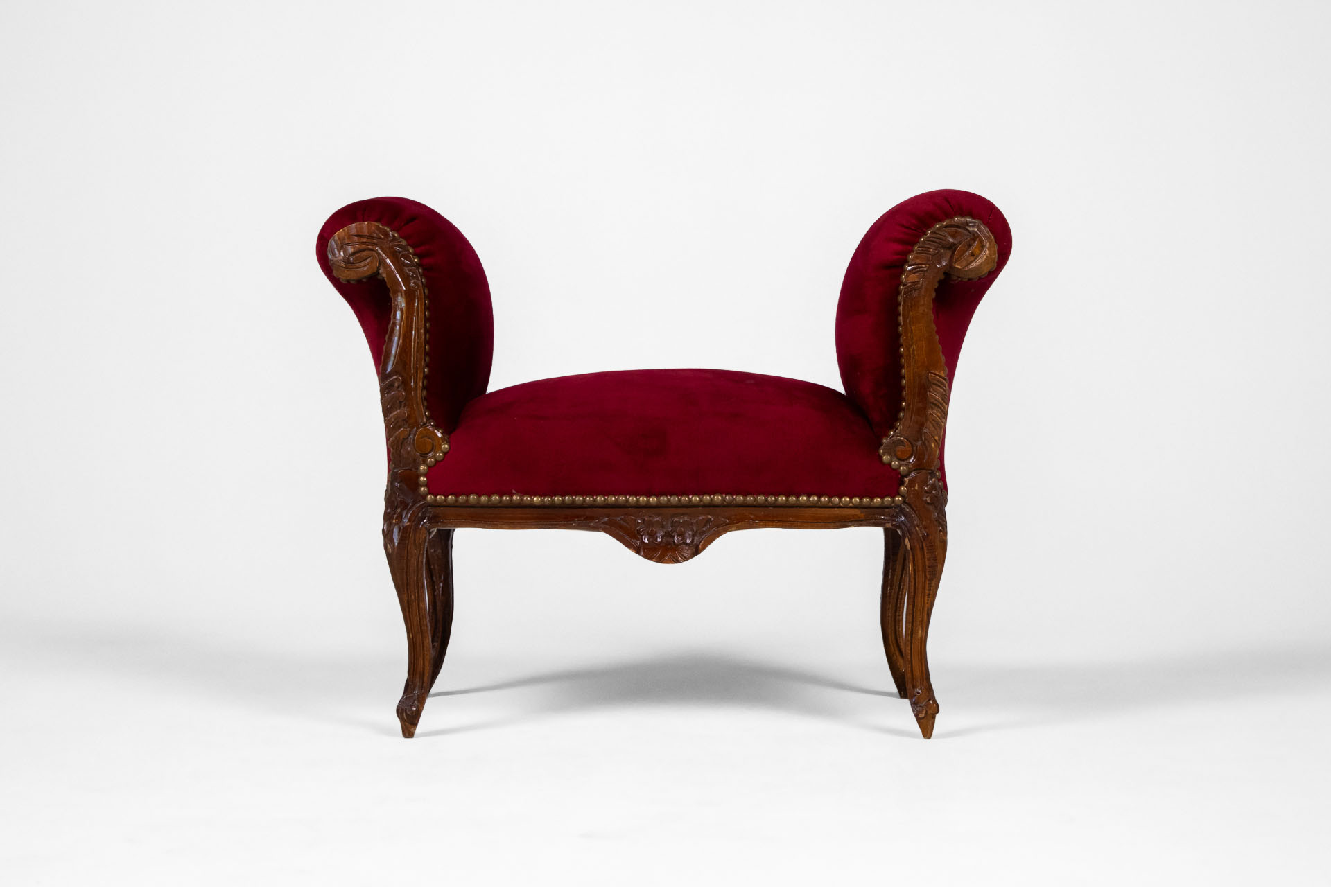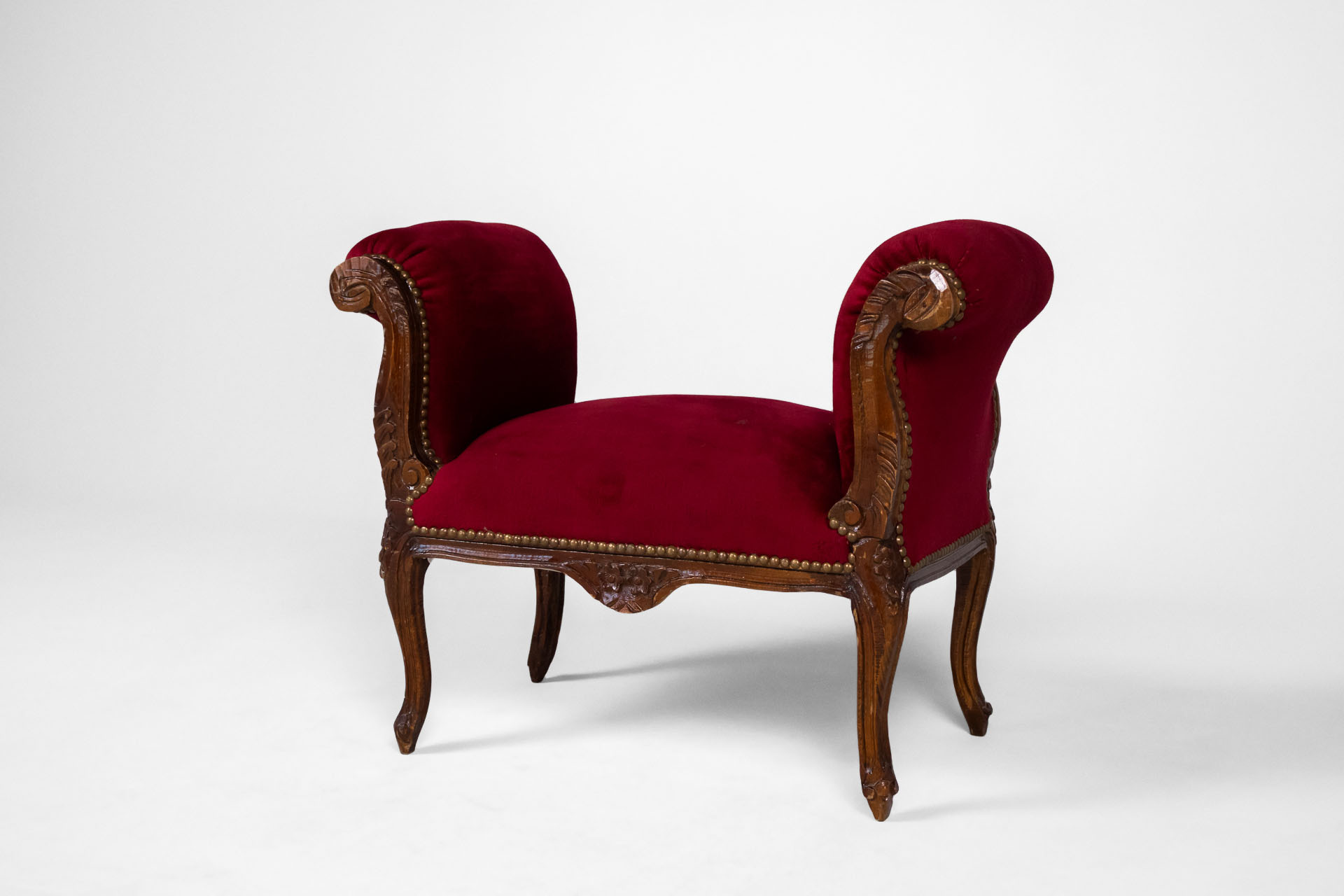 Elegáns, vintage stílusú puff, gazdagon díszített faragott fa kerettel és puha bordó bársonyos kárpittal. A puff formája ívelt, a karfák finoman emelkednek. Ideális kiegészítője lehet egy klasszikus nappalinak vagy...