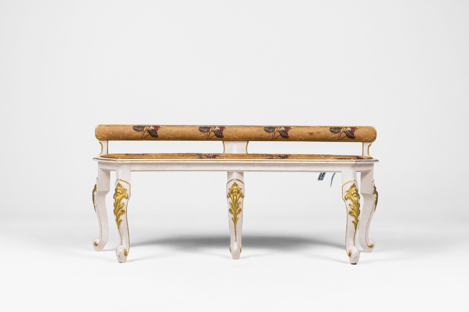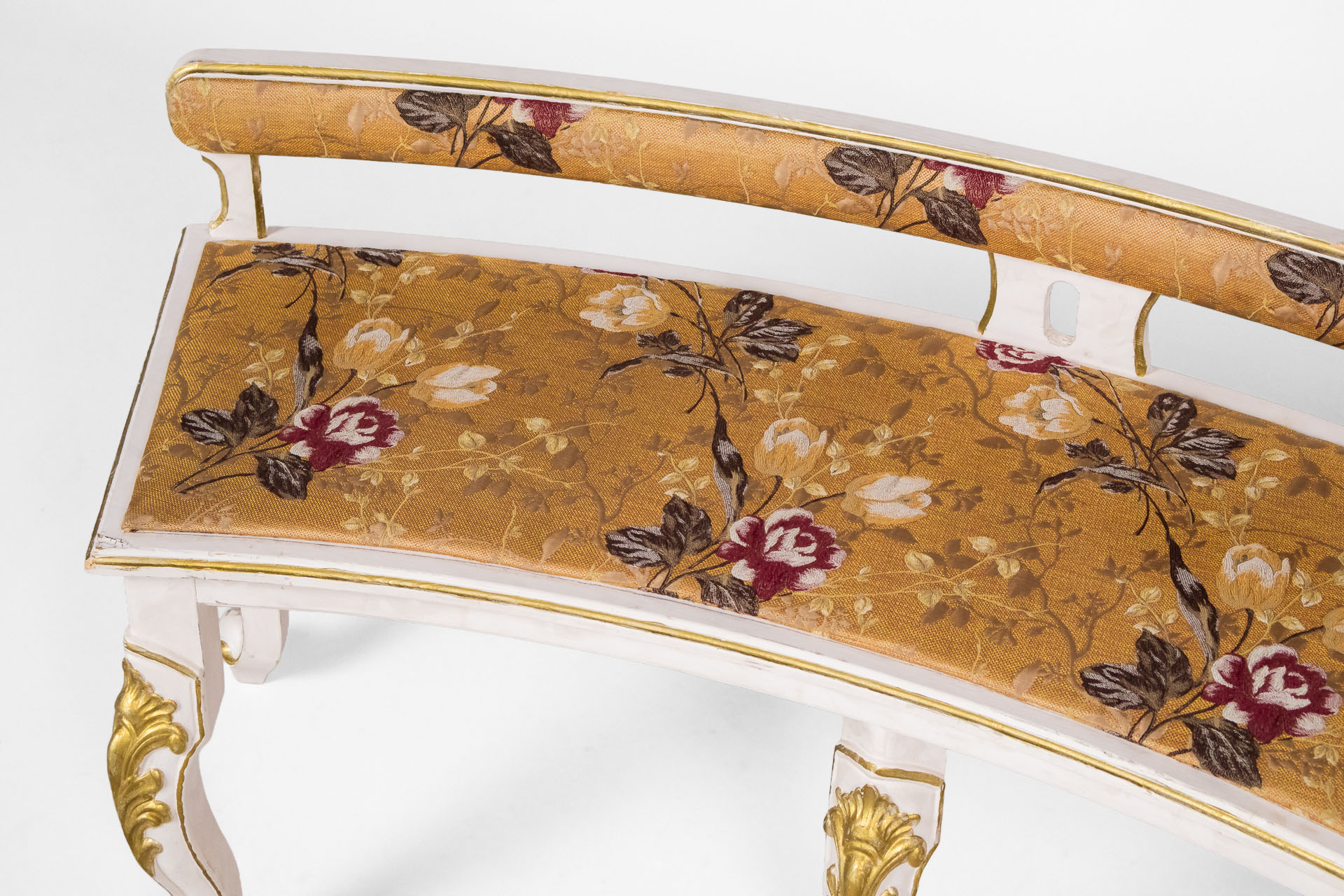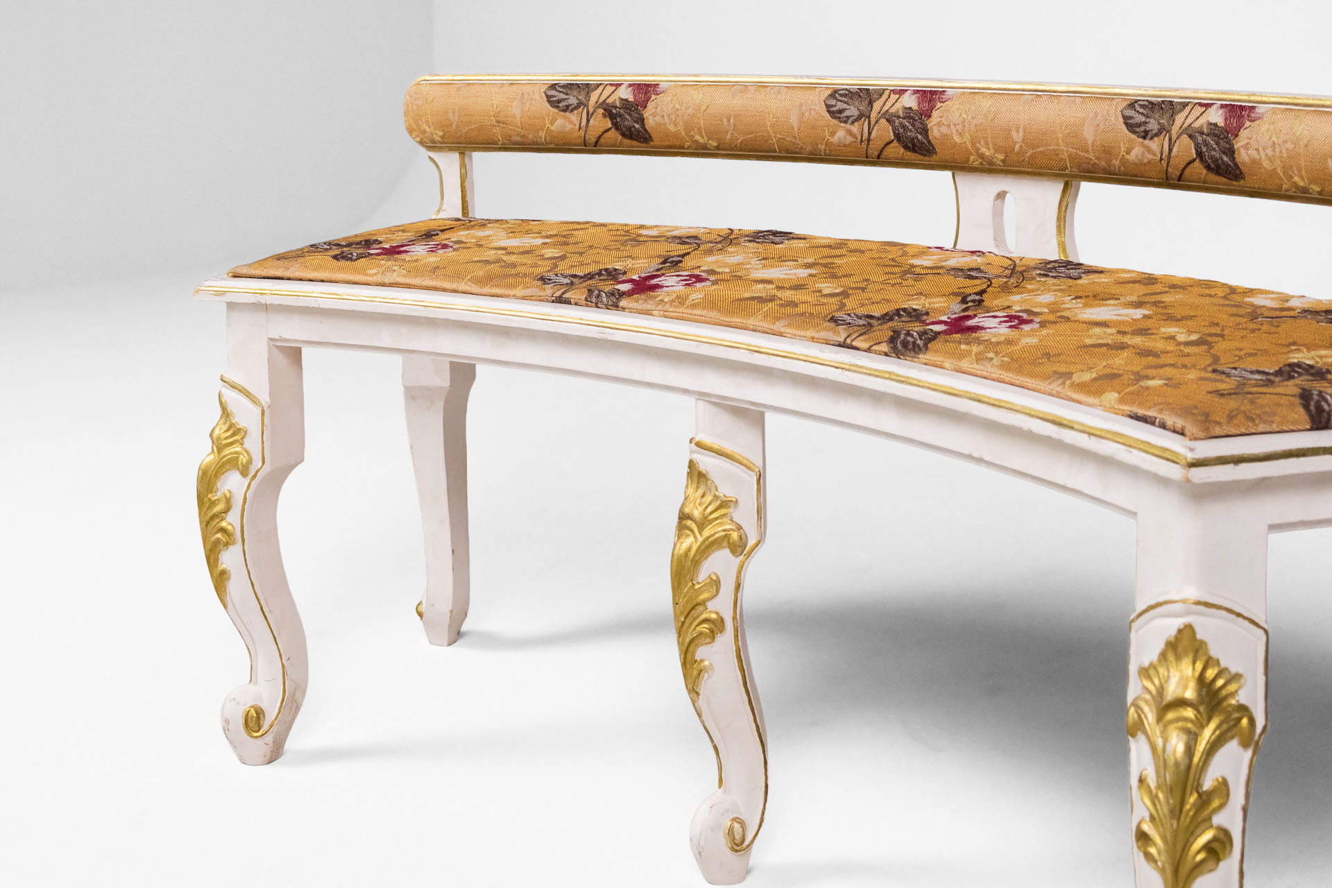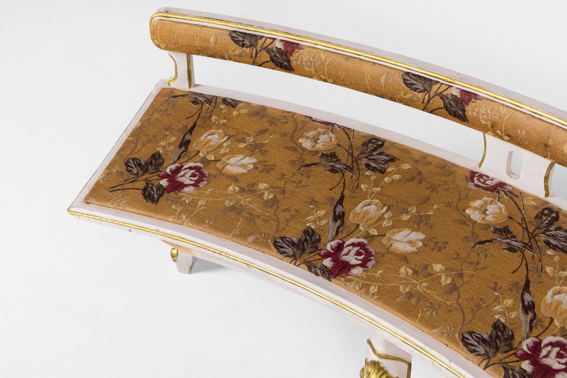 Elegáns, ívelt formájú díszes pad, amely gazdagon díszített, virágmintás textillel borított ülőfelülettel rendelkezik. A pad kerete finoman faragott, aranyozott részletekkel és kecses lábakkal van ellátva, amelyek...