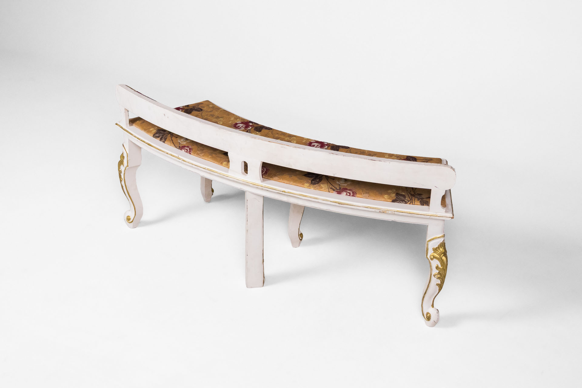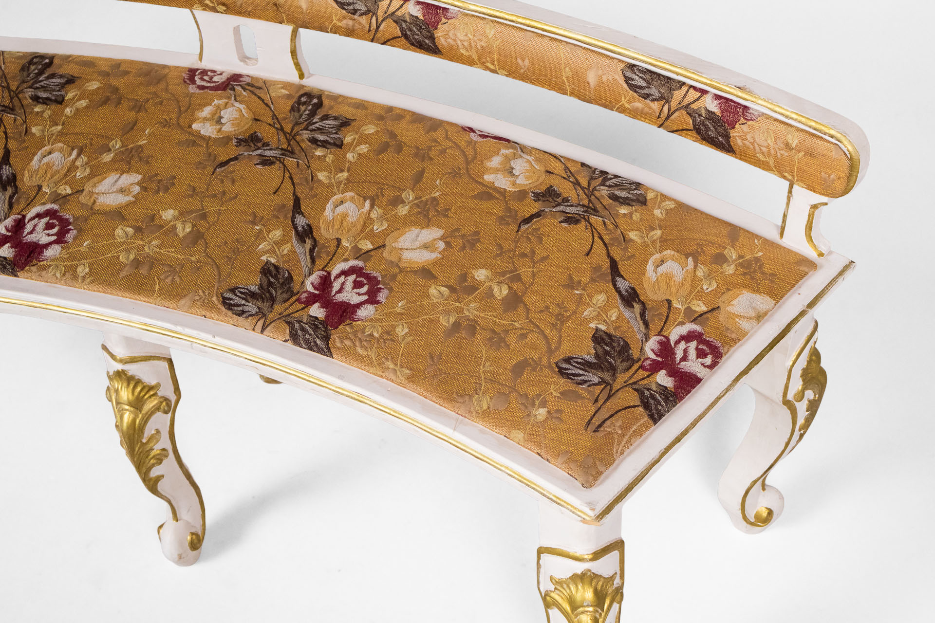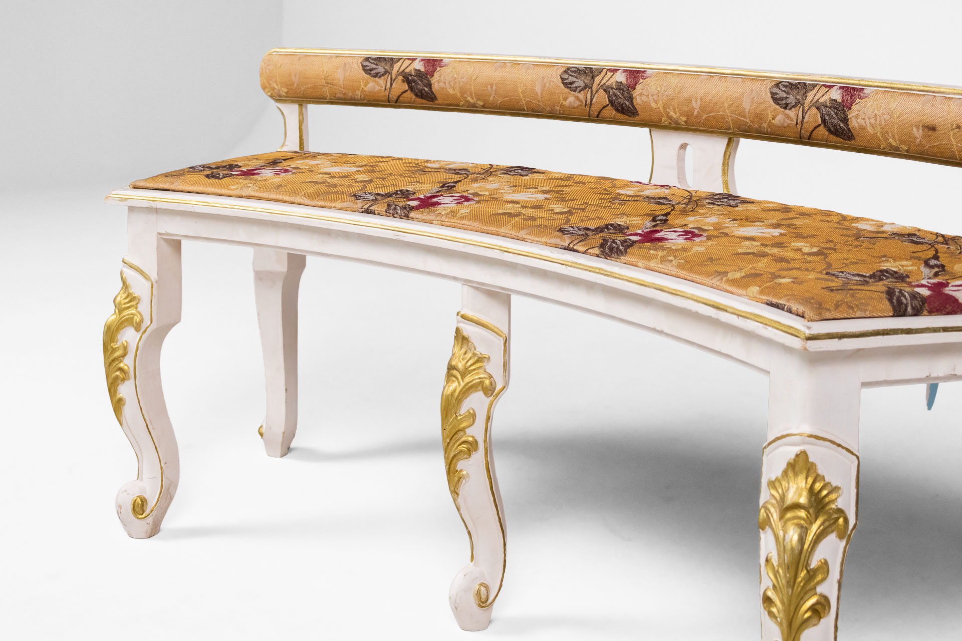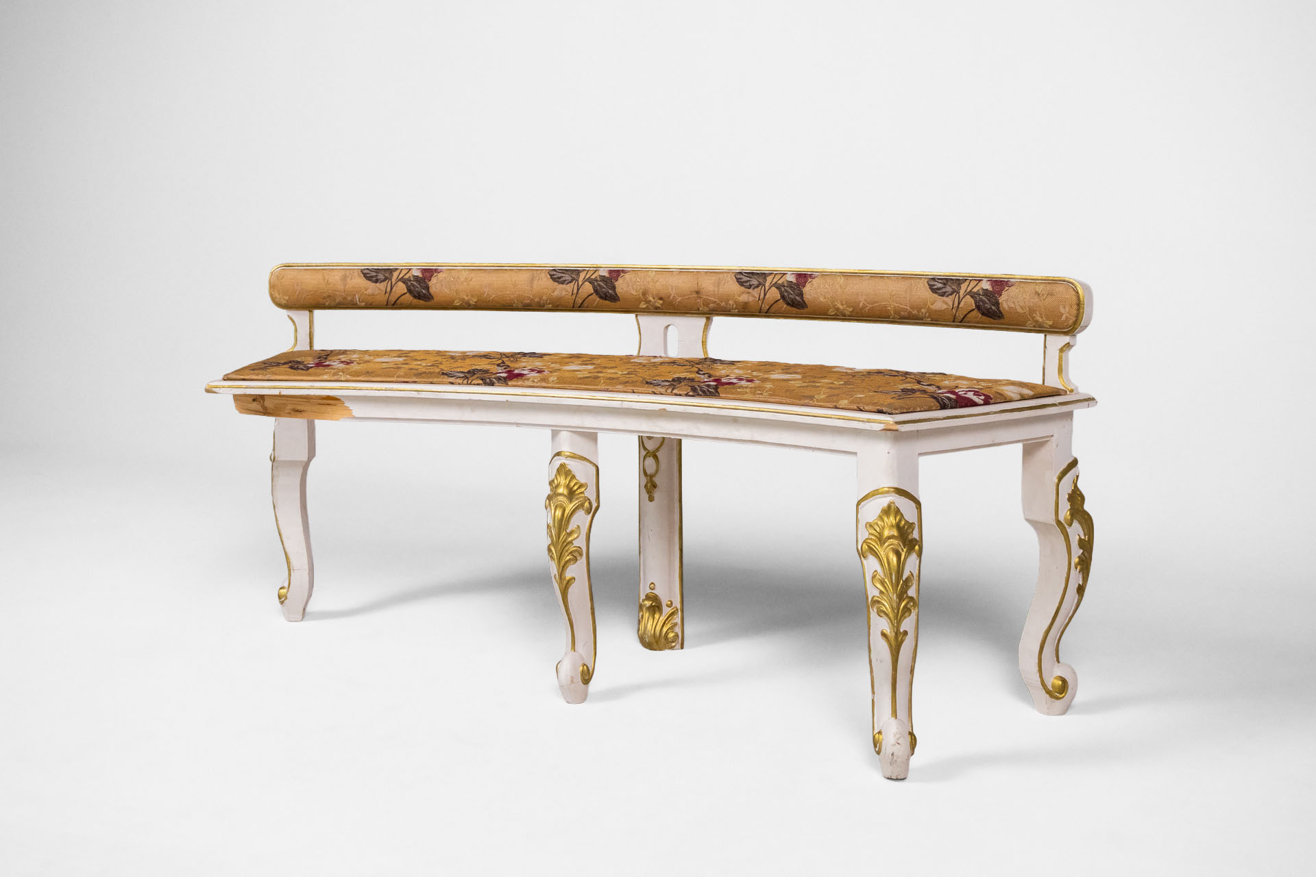 Elegáns, ívelt formájú díszes pad, amely gazdagon díszített, virágmintás textillel borított ülőfelülettel rendelkezik. A pad kerete finoman faragott, aranyozott részletekkel és kecses lábakkal van ellátva, amelyek...