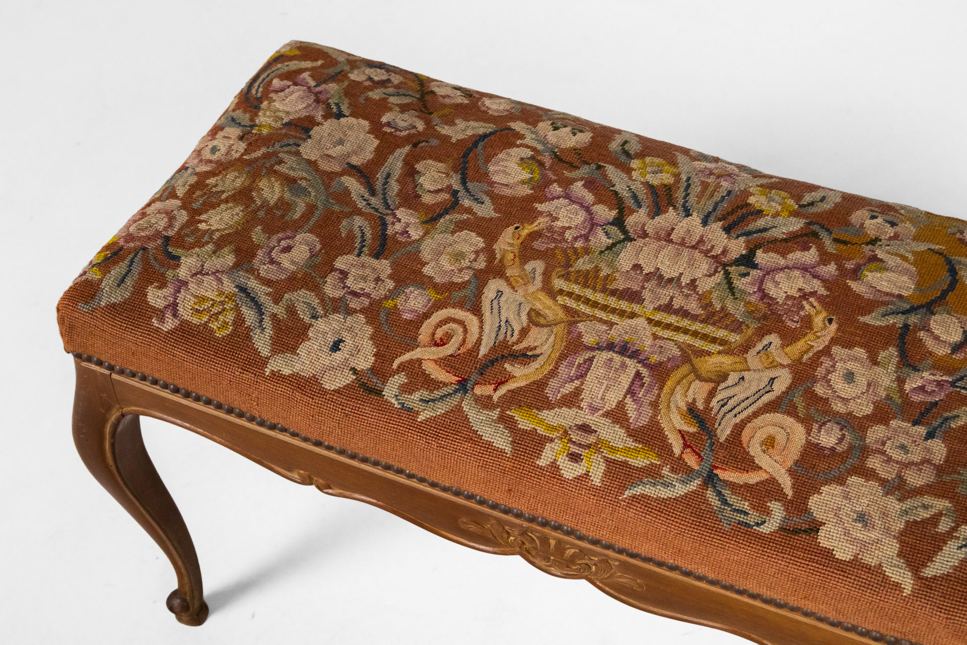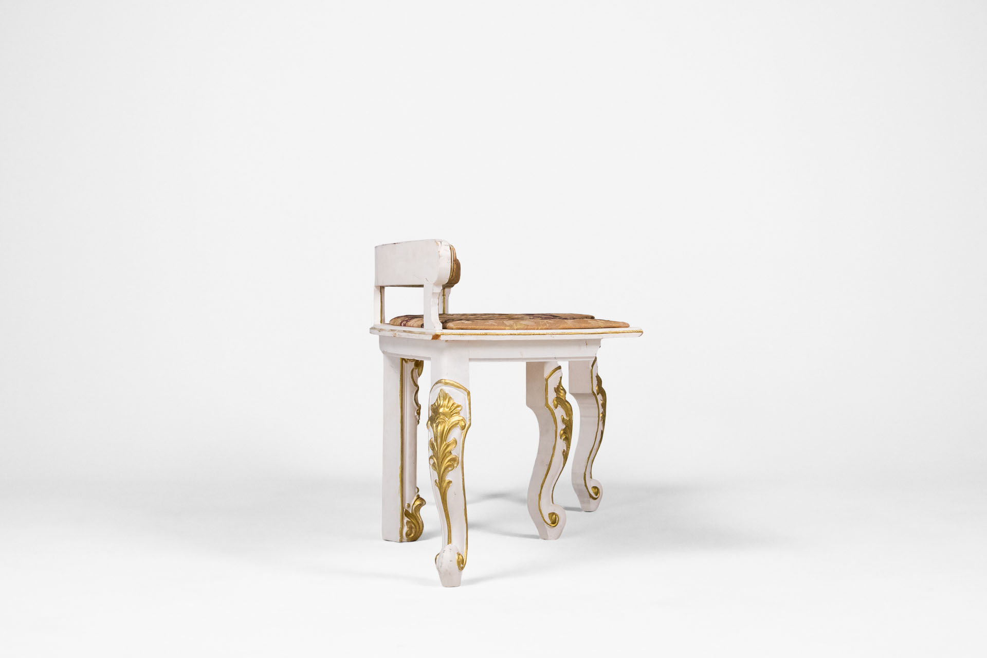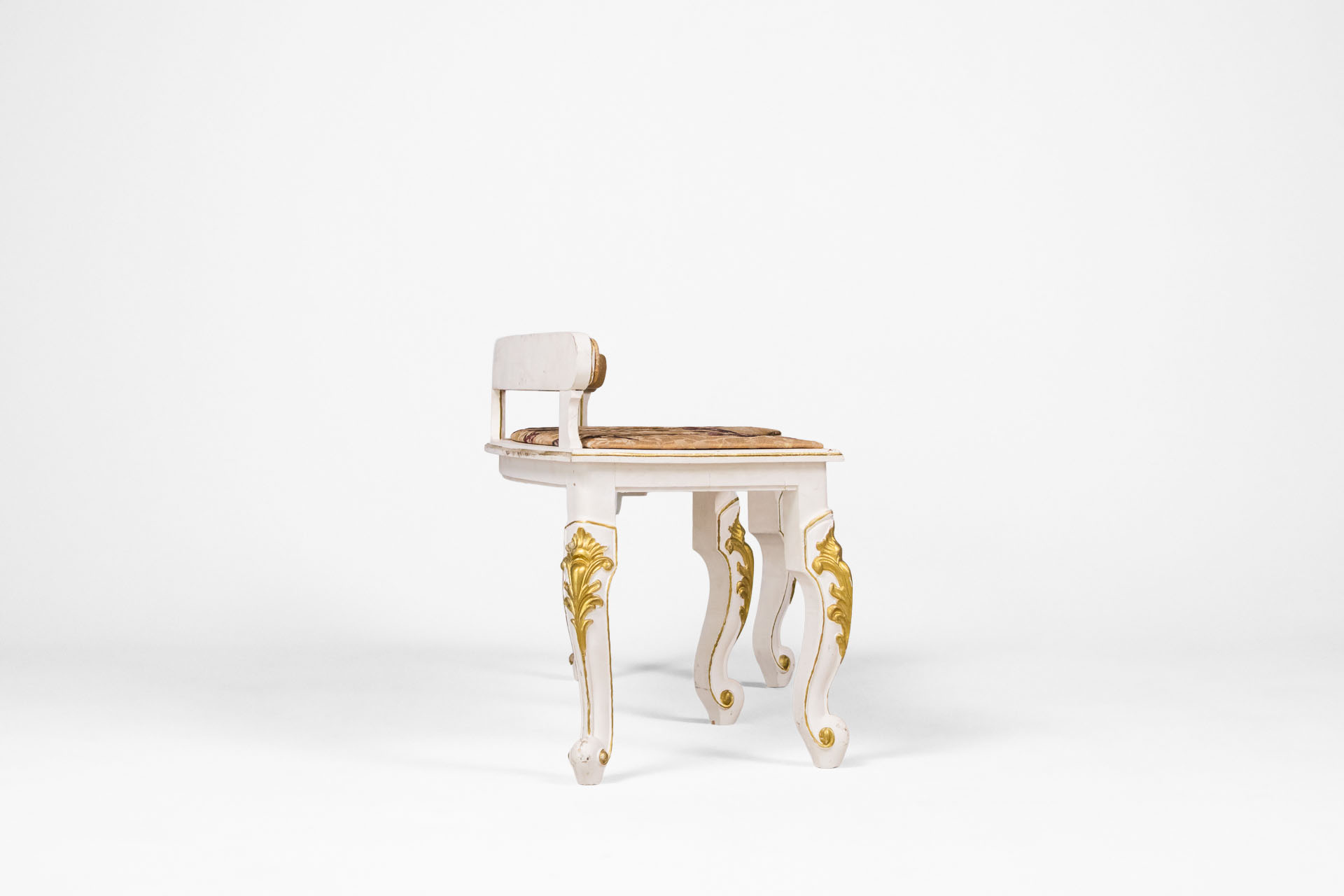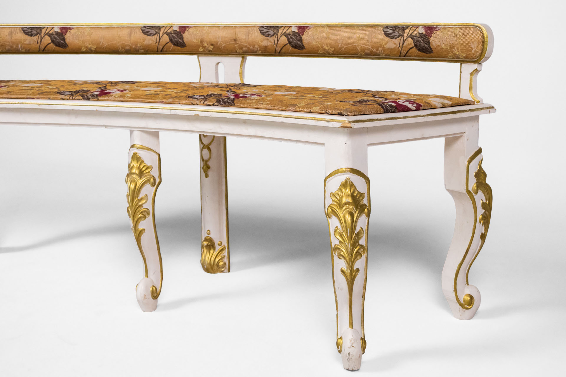 Elegáns, ívelt formájú díszes pad, amely gazdagon díszített, virágmintás textillel borított ülőfelülettel rendelkezik. A pad kerete finoman faragott, aranyozott részletekkel és kecses lábakkal van ellátva, amelyek...