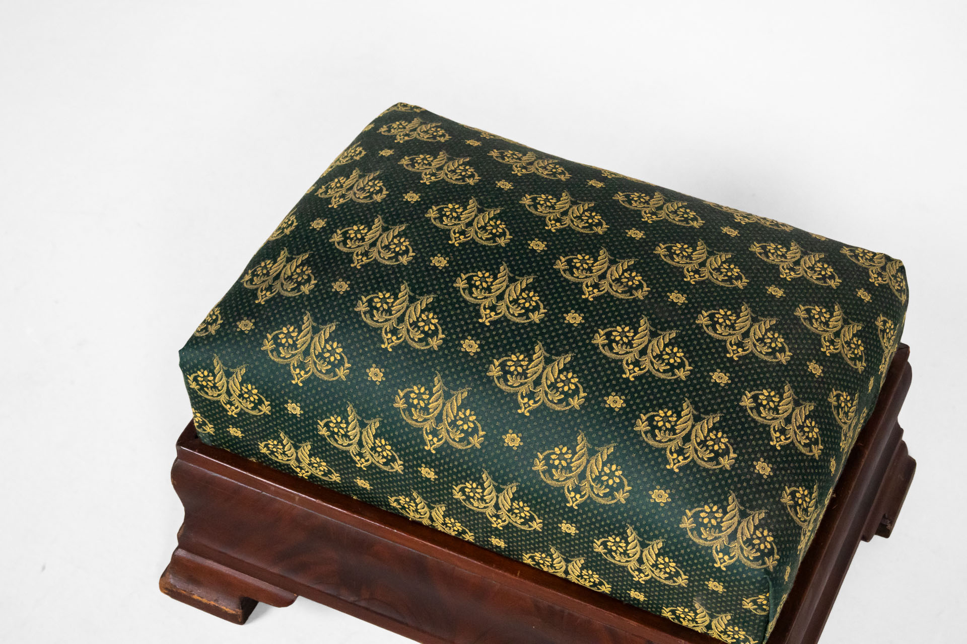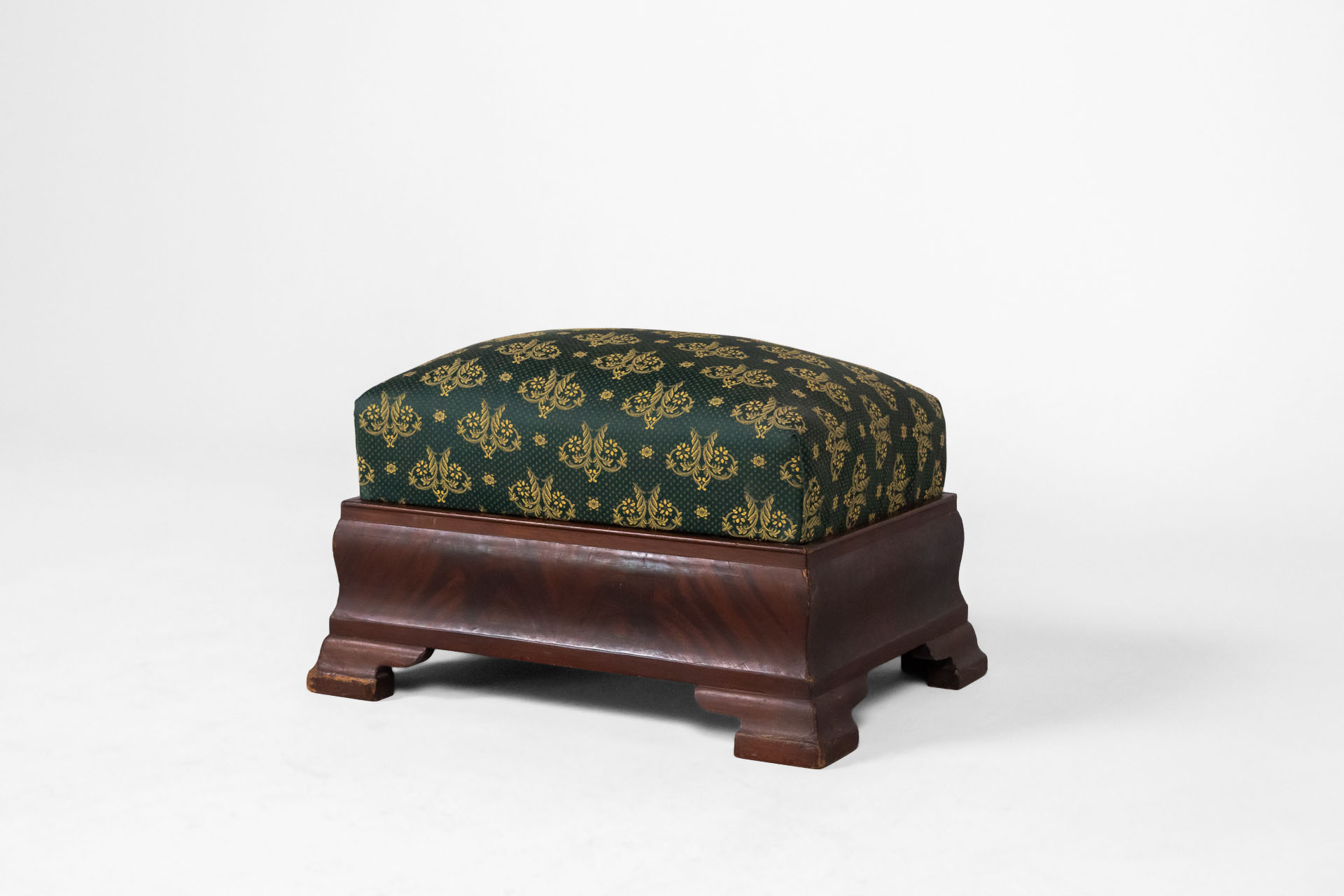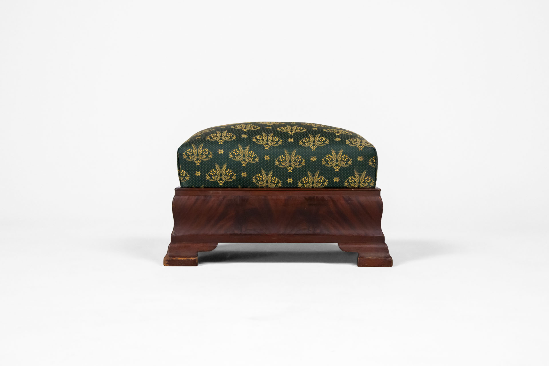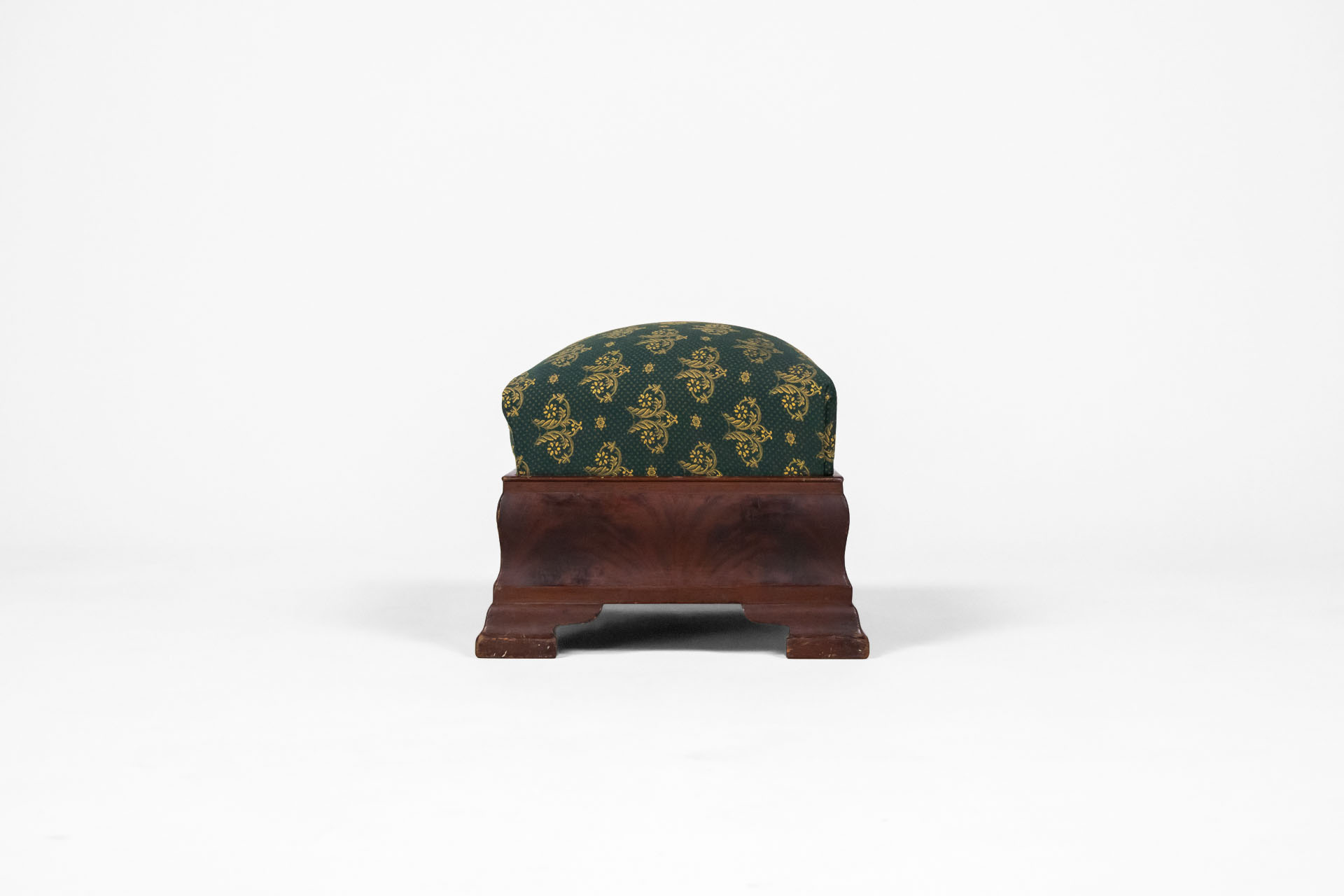 Elegáns, kis méretű lábtartó, masszív mahagóni szerkezettel és gazdagon díszített, zöld-arany színű textilborítással. A lábtartó formája lekerekített, amely kényelmet és stílust sugall, ideális választás vintage vagy...