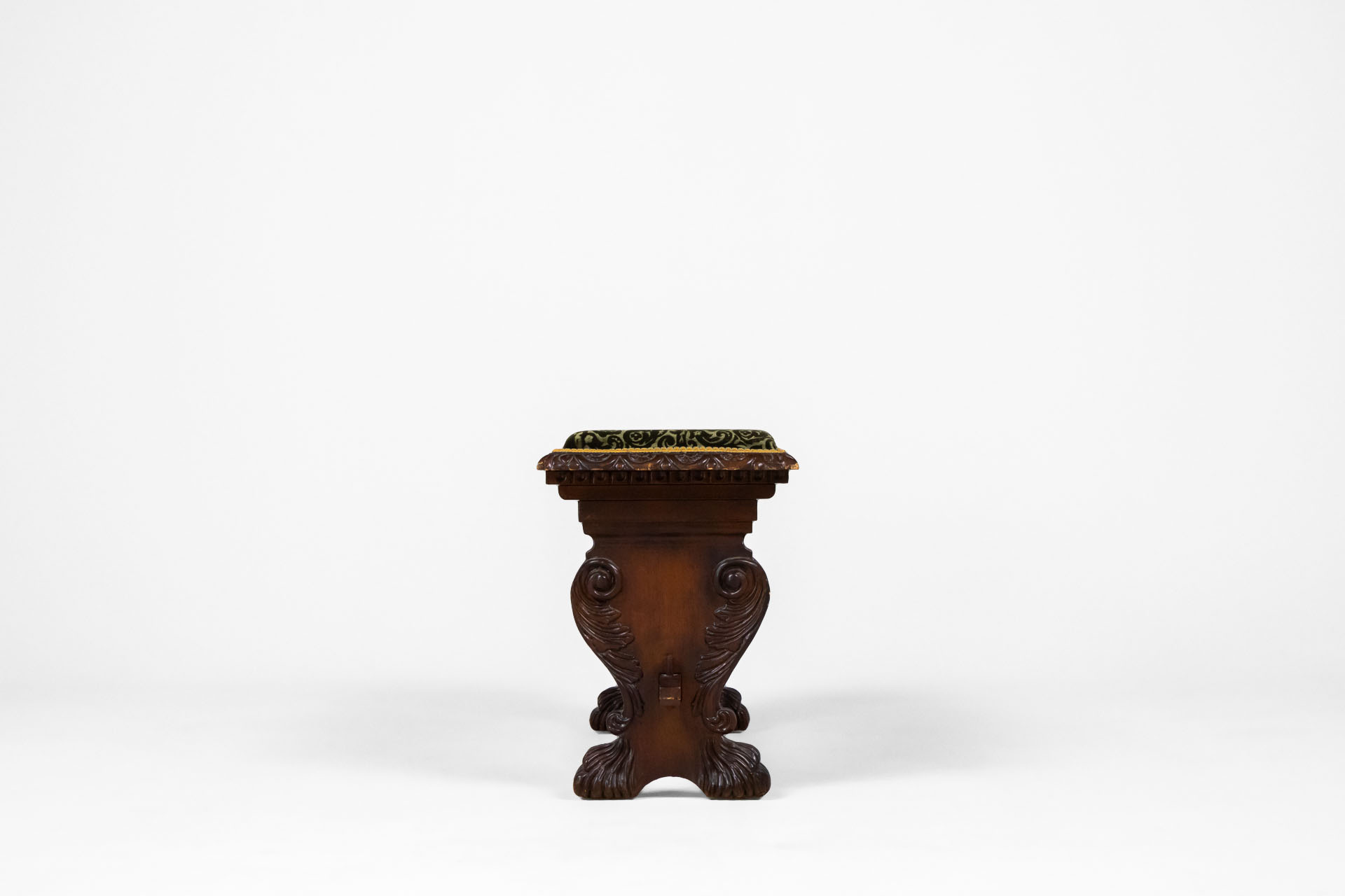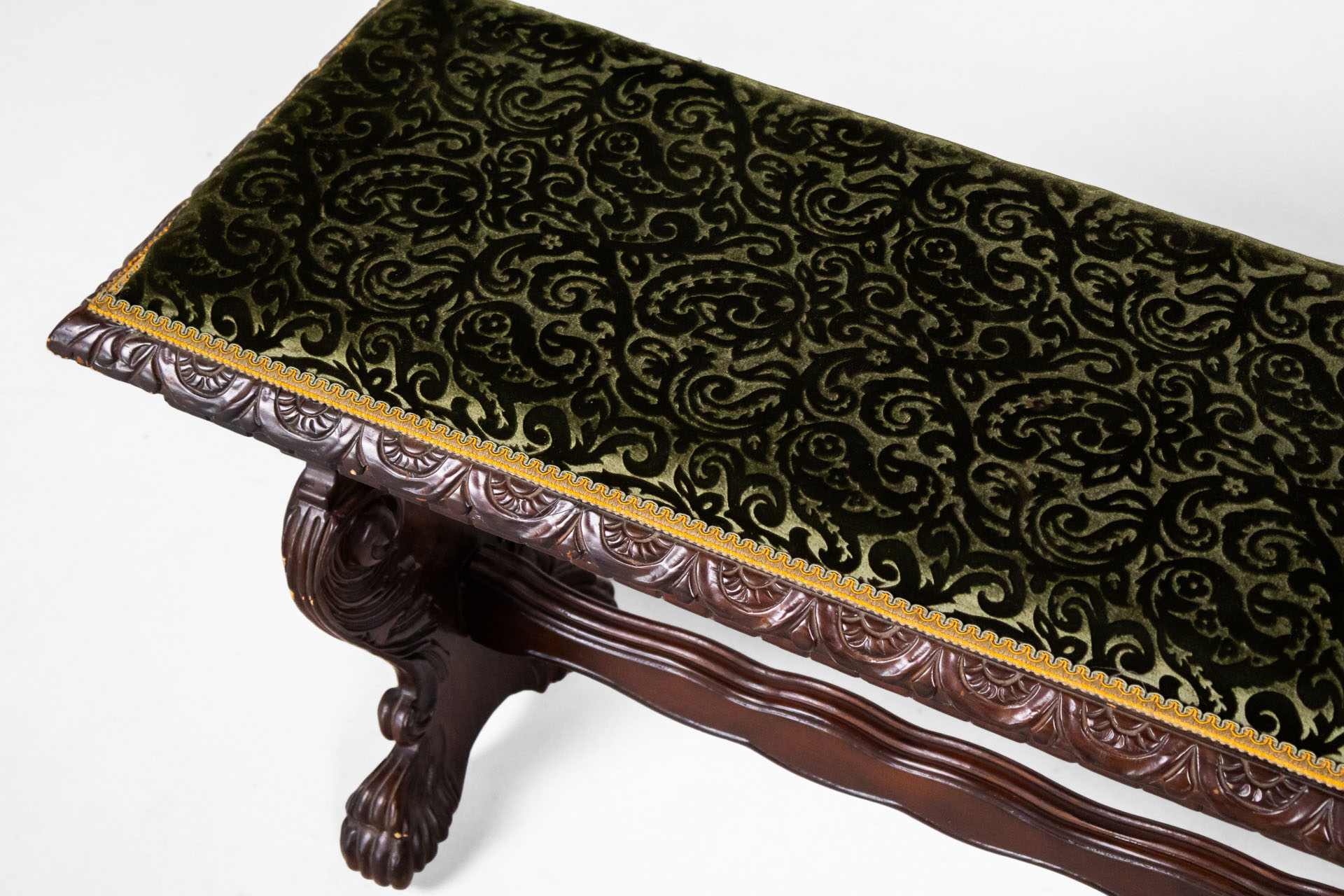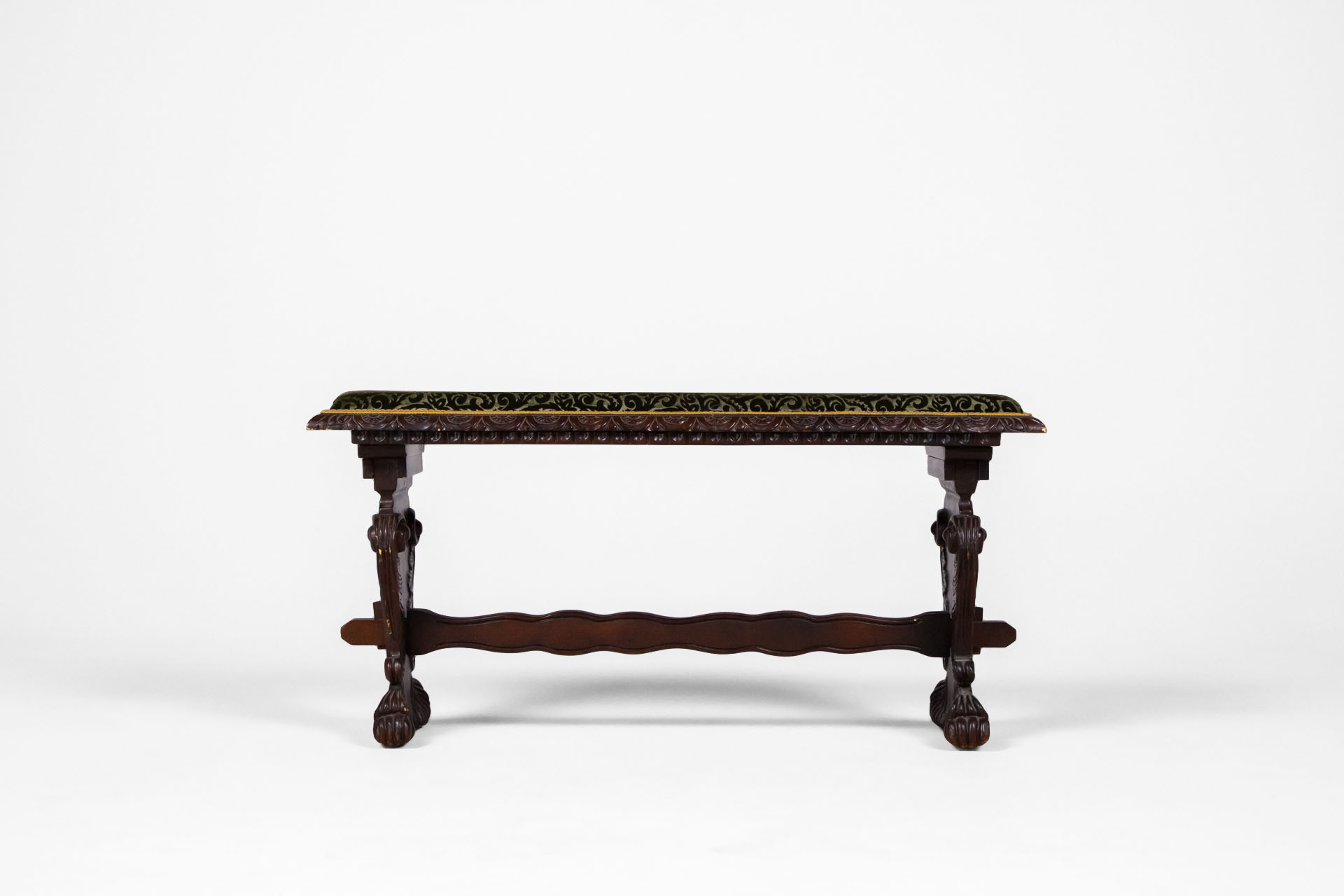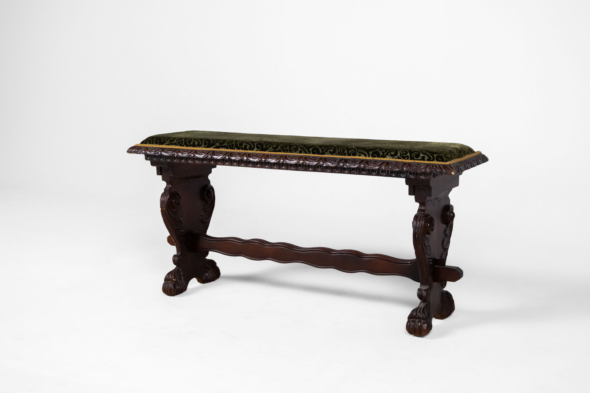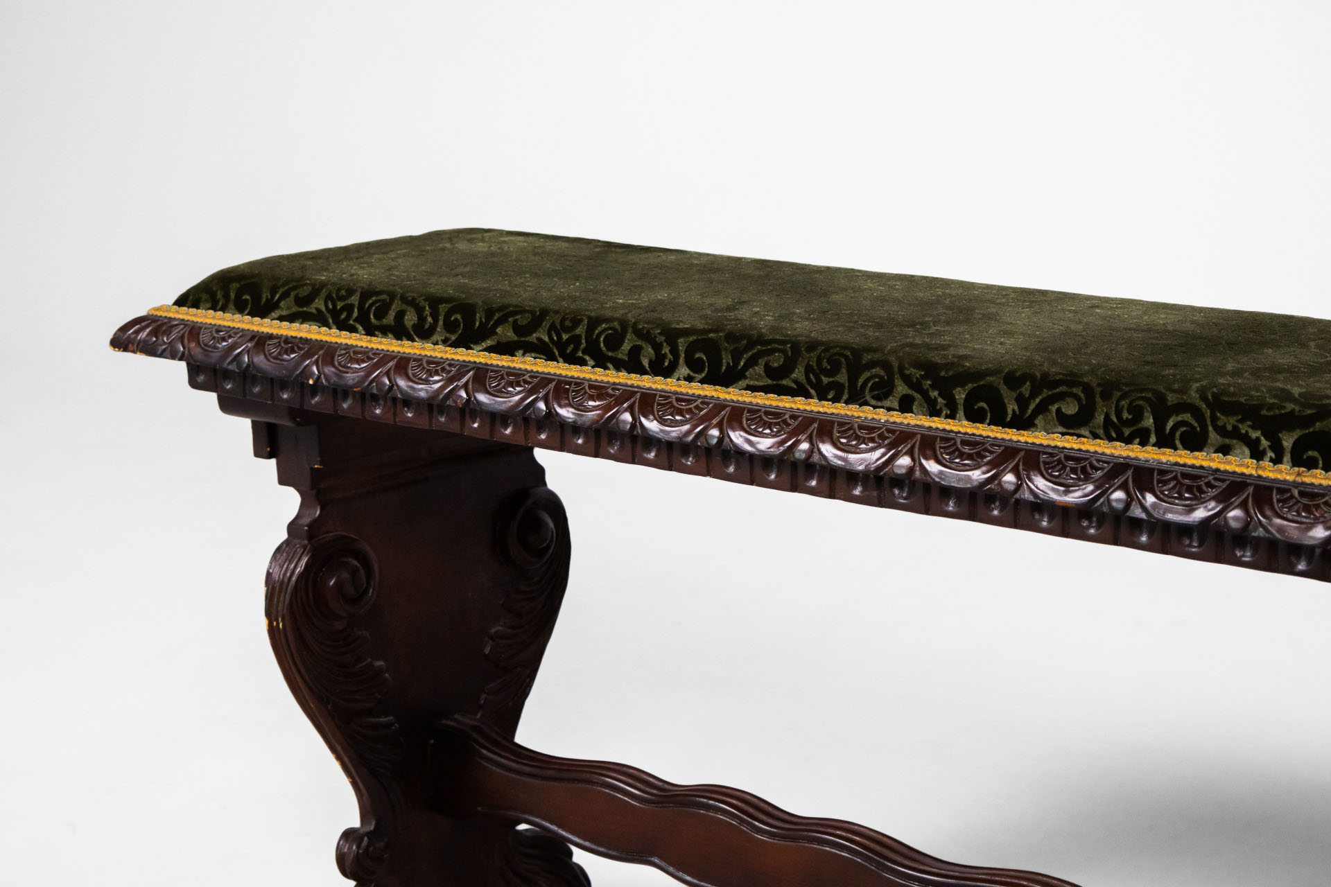 Elegáns, klasszikus stílusú, hosszúkás formájú pad, gazdagon díszített mahagóni kerettel és sötétzöld bársonyos ülőfelülettel, amely kényelmes és stílusos megoldást kínál bármely elegáns enteriőrben