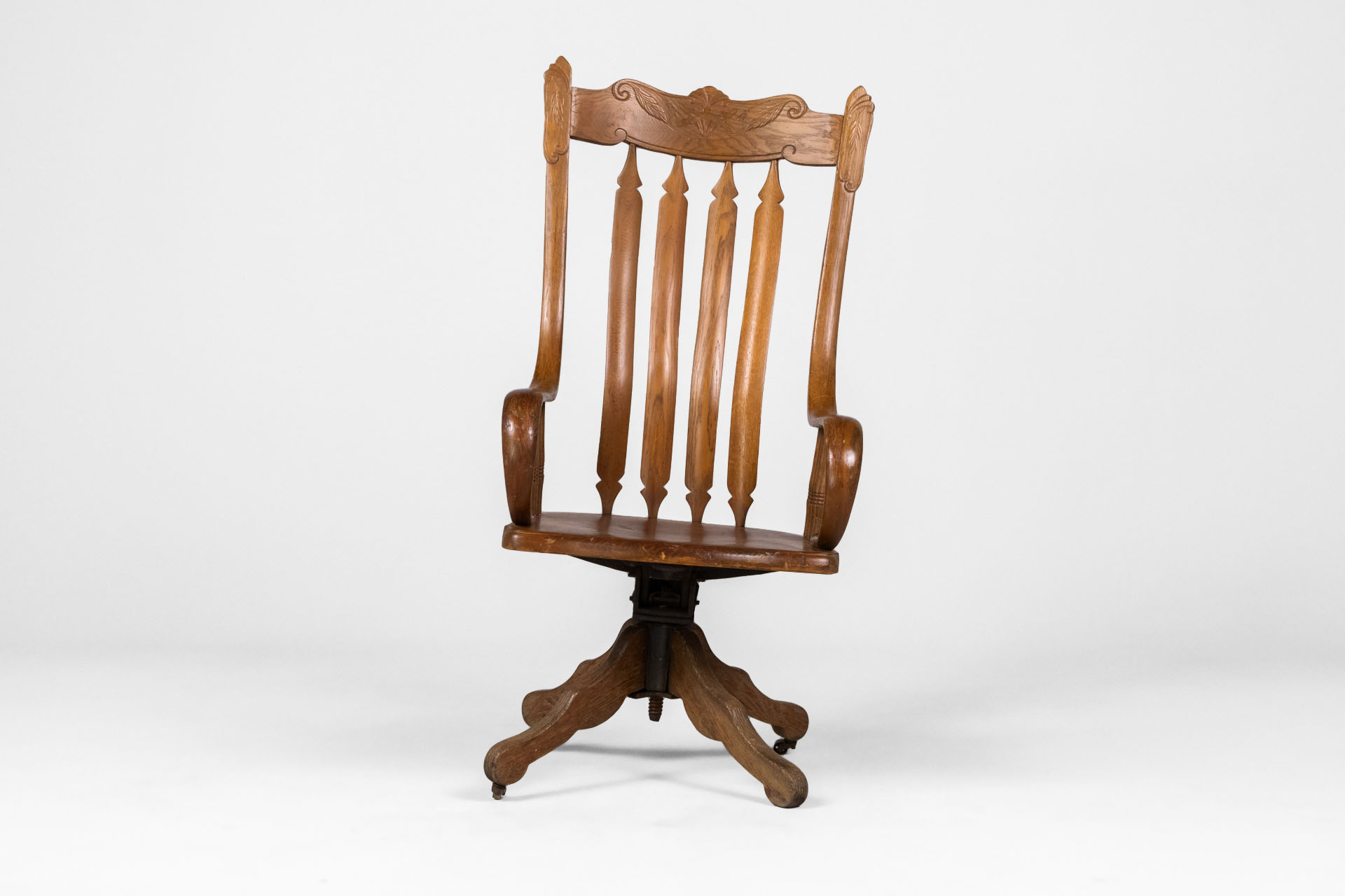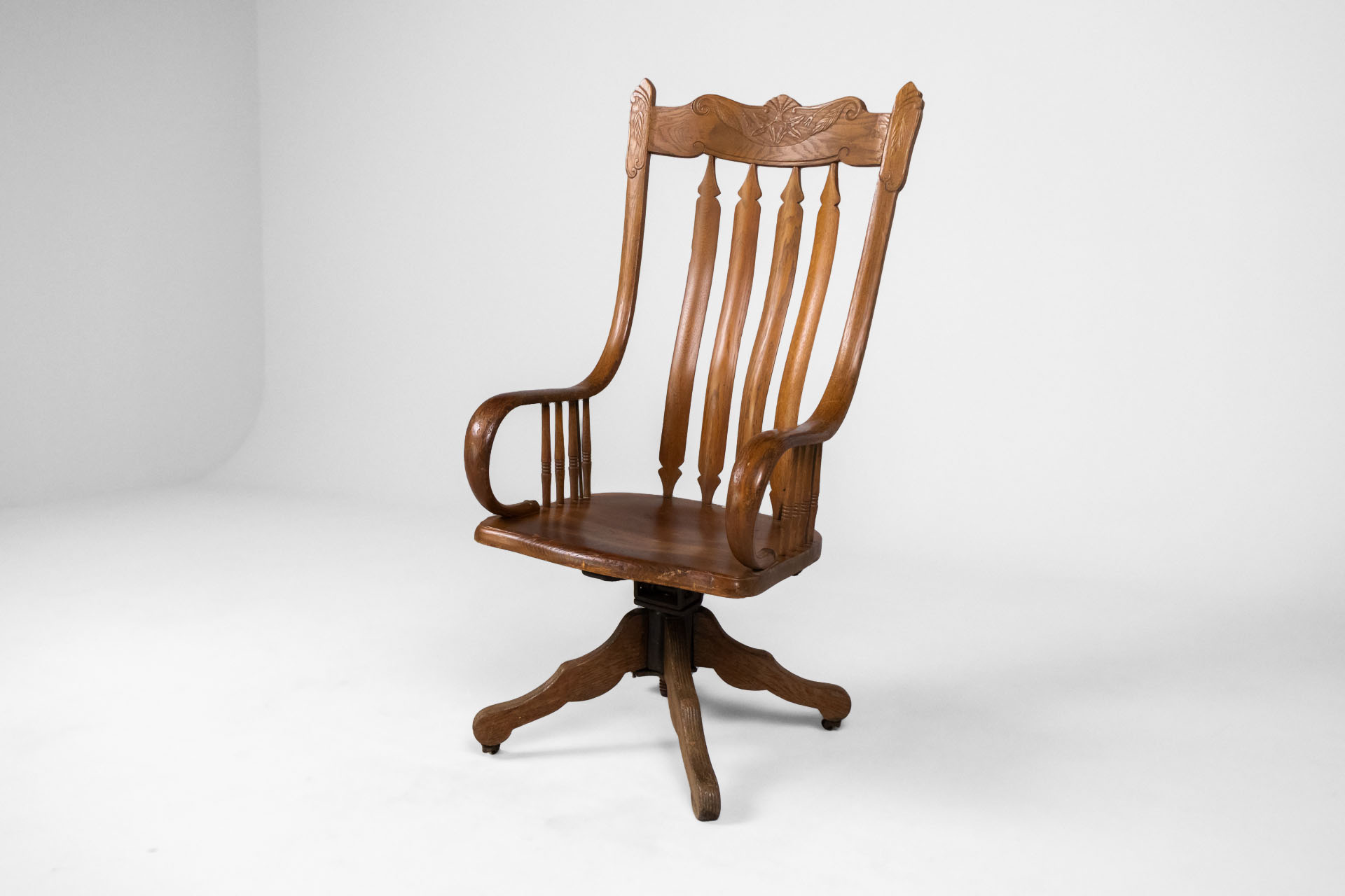 Klasszikus stílusú forgószék, amely elegáns vonalvezetésével ideális választás irodákba vagy otthoni munkakörnyezetbe. A széket díszes háttámla és ívelt karfák jellemzik, amelyek vintage megjelenést kölcsönöznek