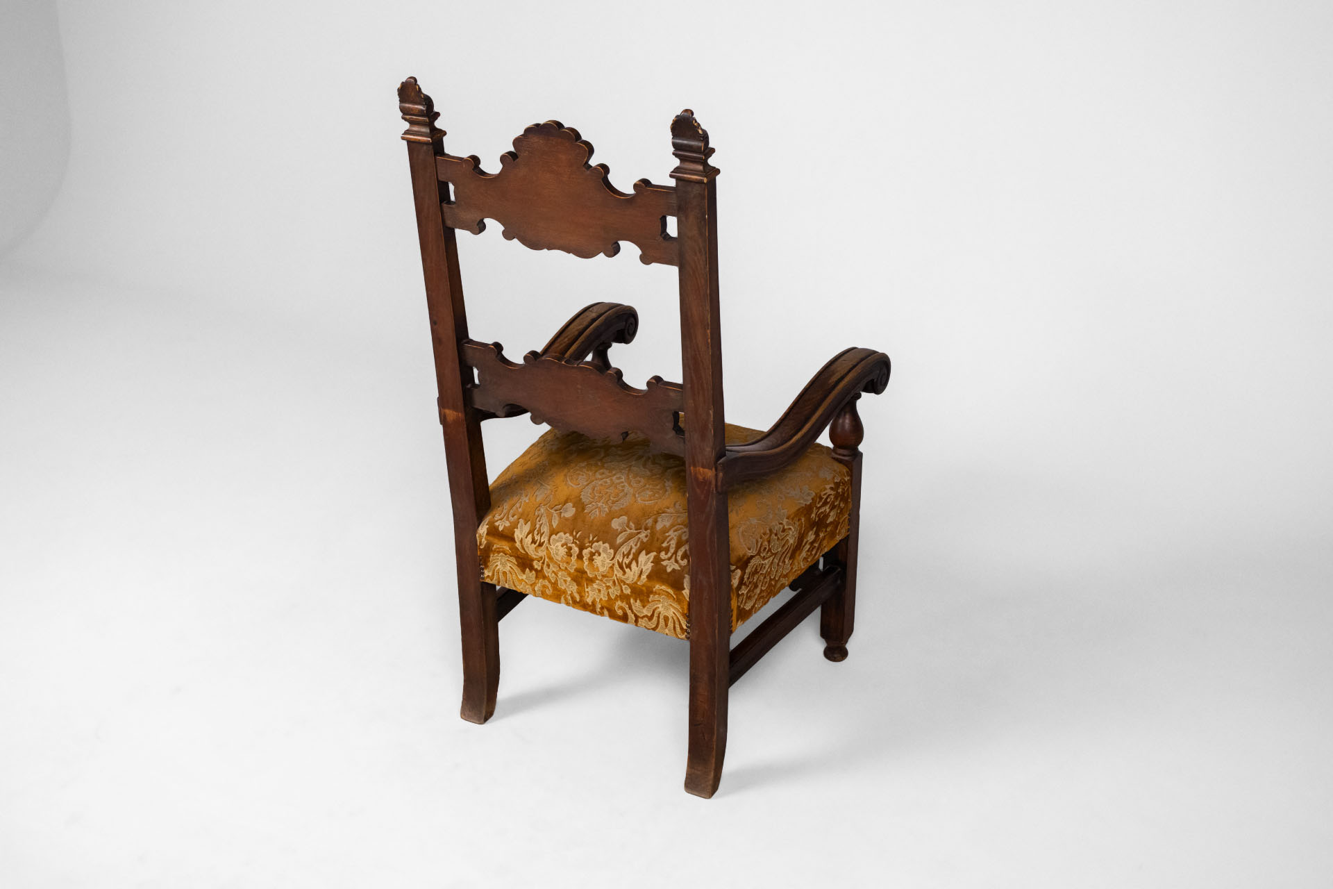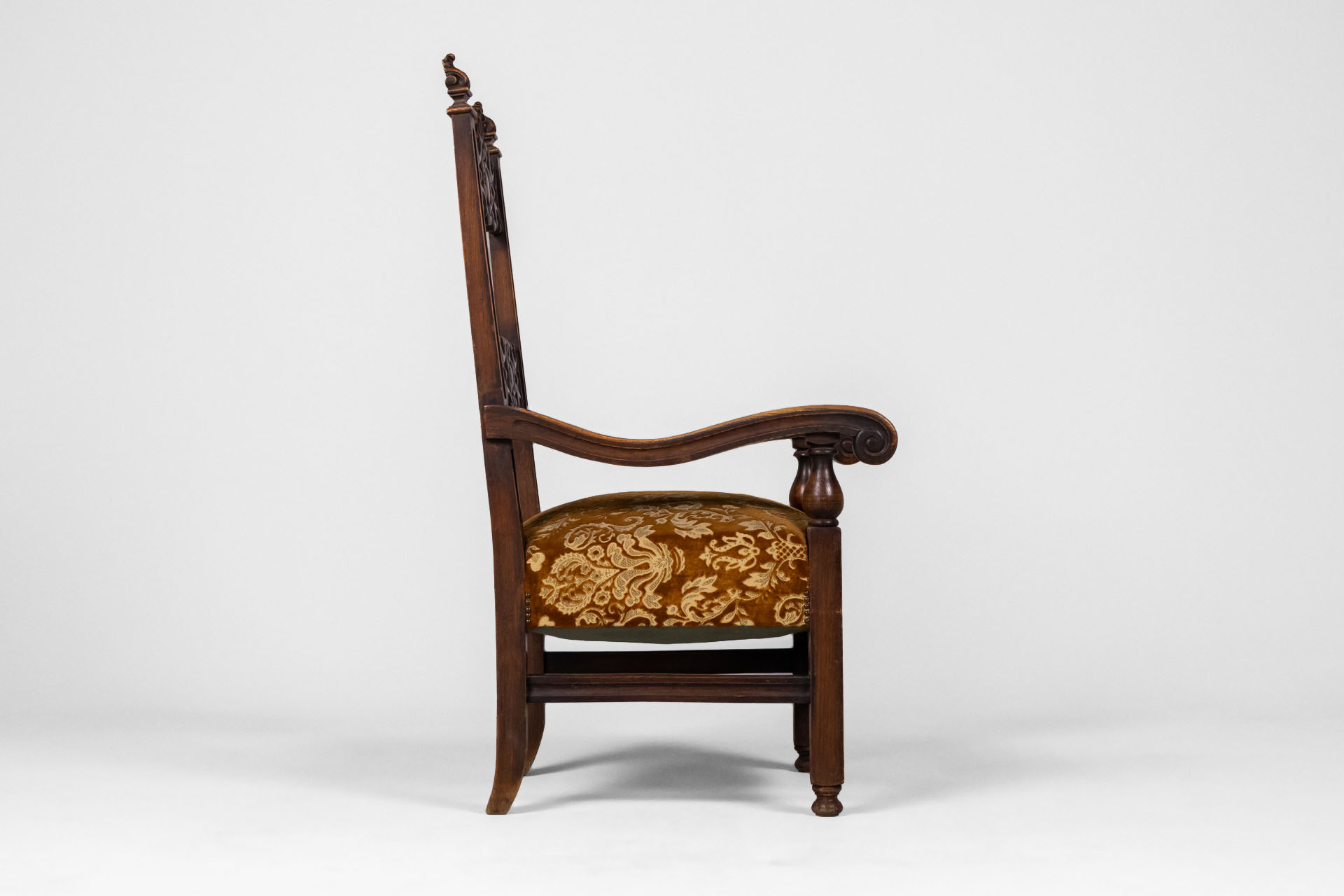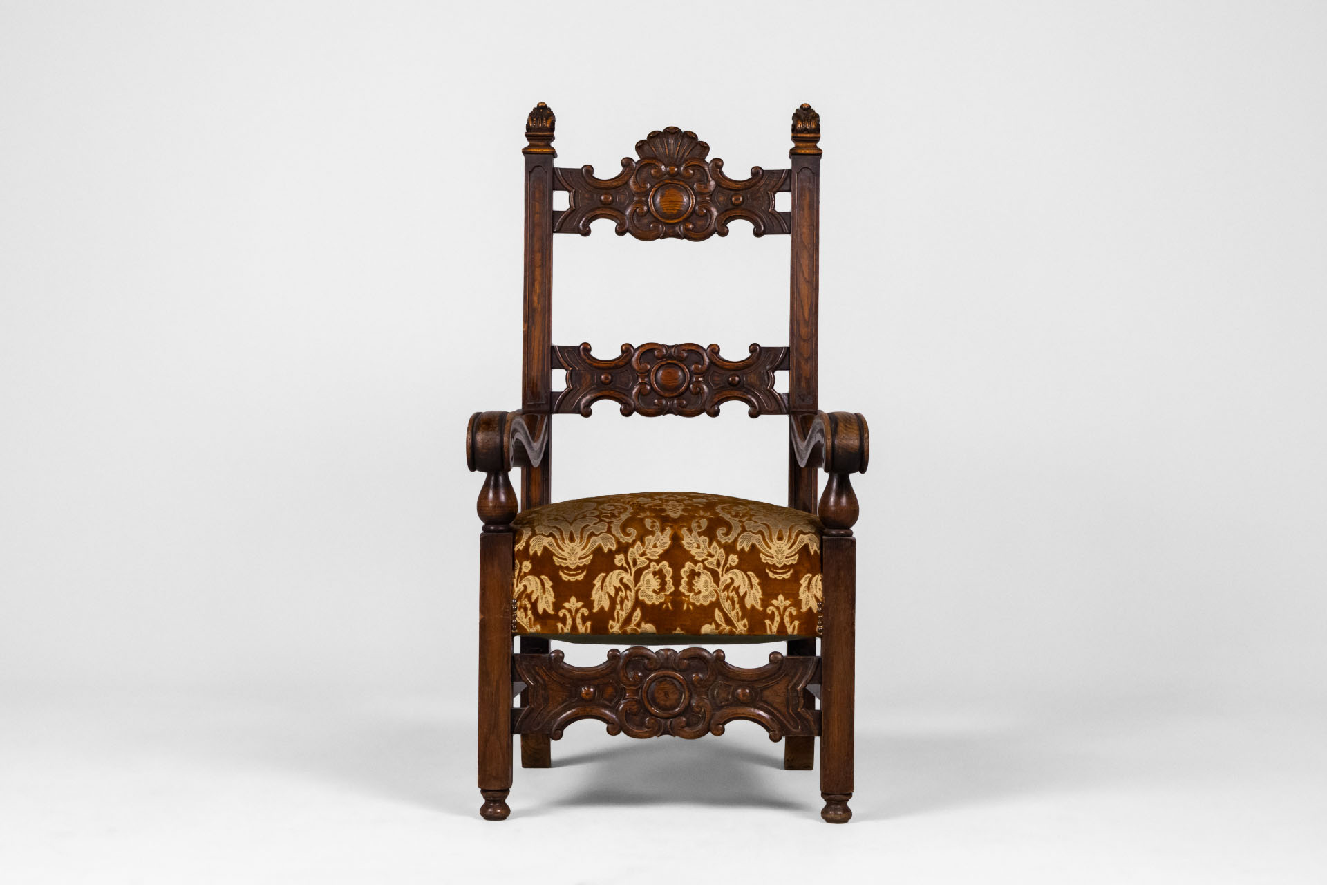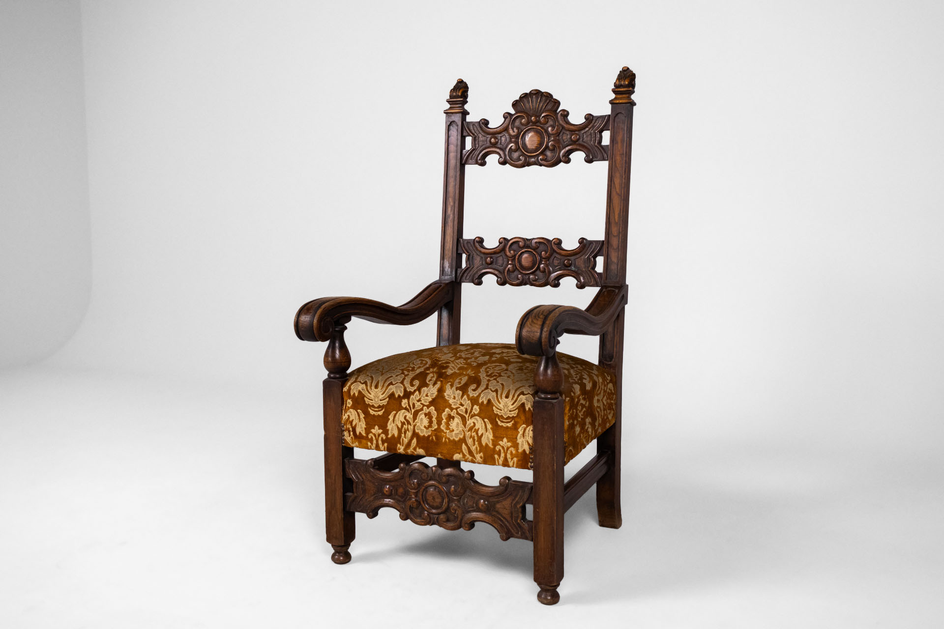 Klasszikus stílusú, díszes karosszék, gazdagon faragott fa kerettel és arany színű, mintás kárpittal. A magas háttámla és az ívelt karfák eleganciát sugároznak, míg a stabil szerkezet biztosítja a kényelmet és a...