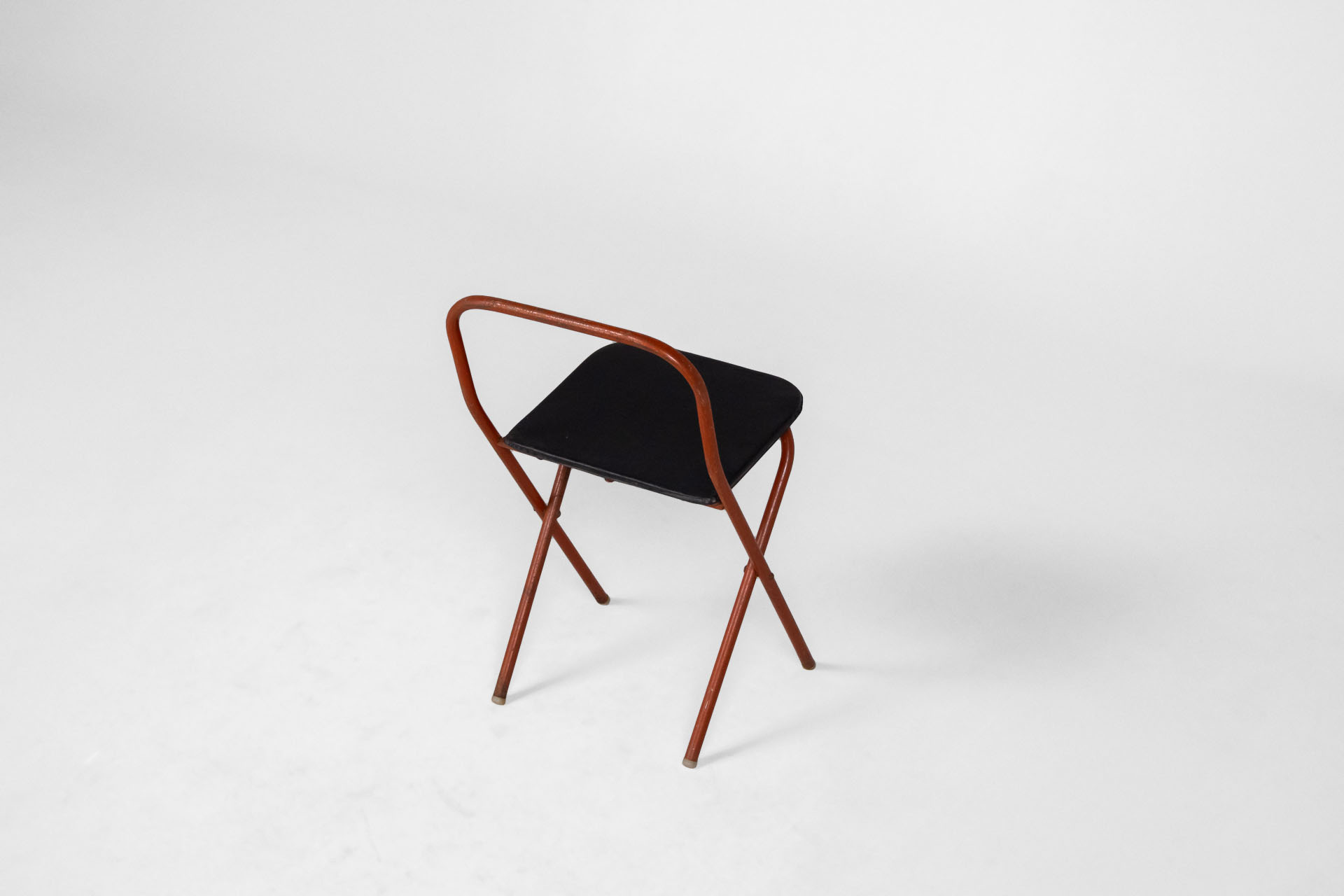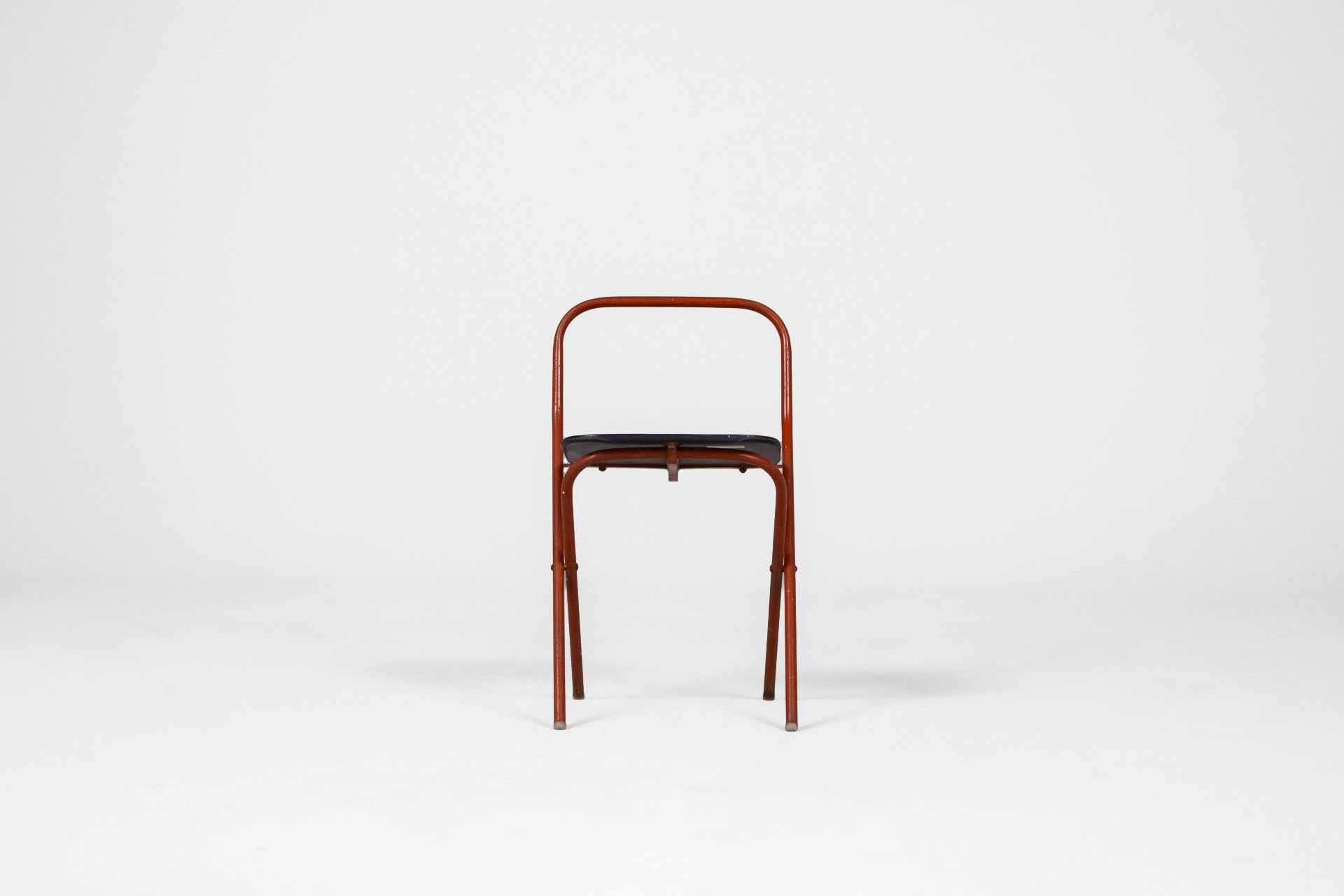 Modern, minimalista stílusú összehajtható szék, amely könnyű, de tartós fém vázzal rendelkezik. A fekete műbőr ülőfelület és a meleg, vörösesbarna keret kontrasztja friss, kortárs megjelenést kölcsönöz. Ideális...