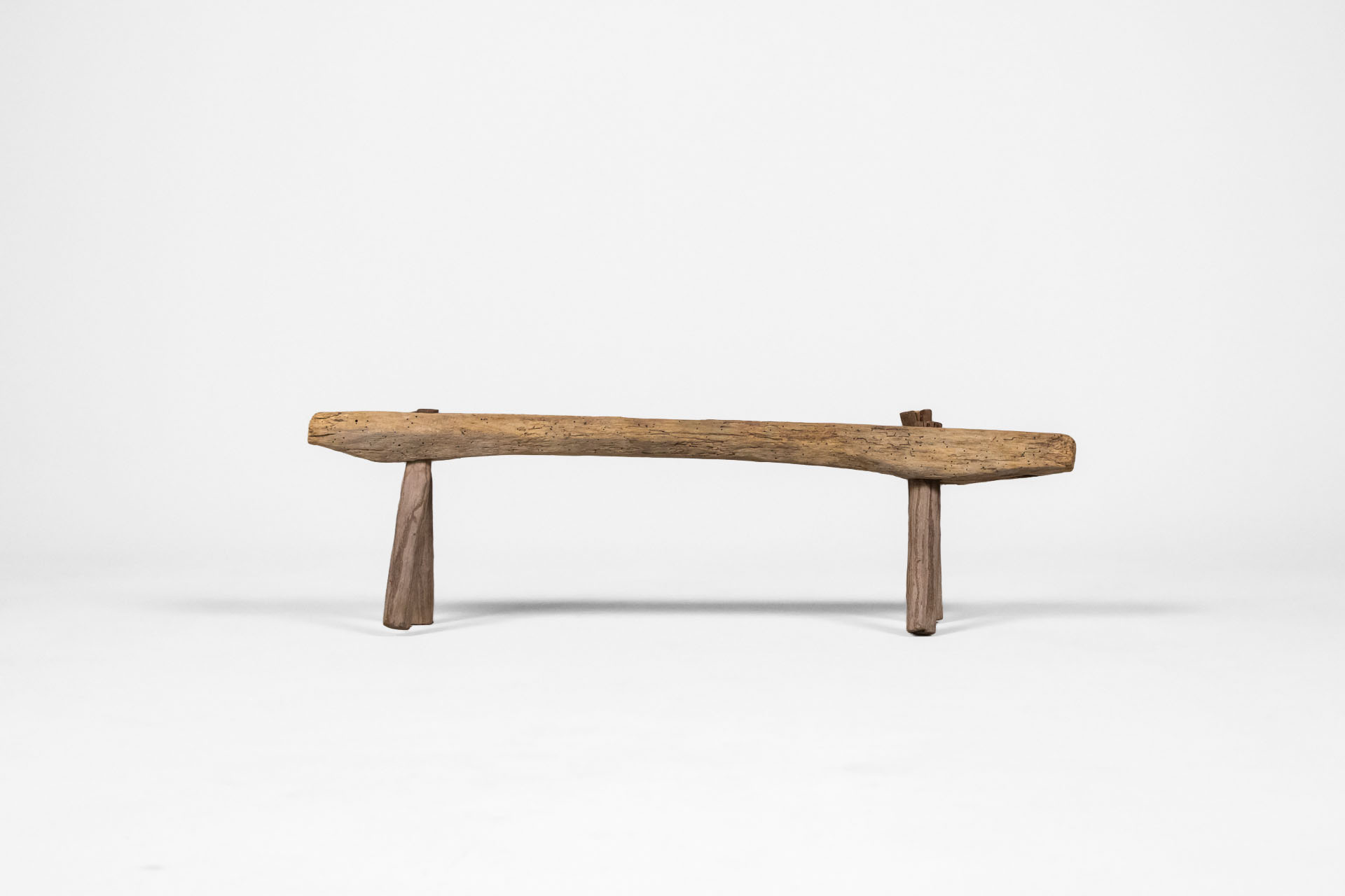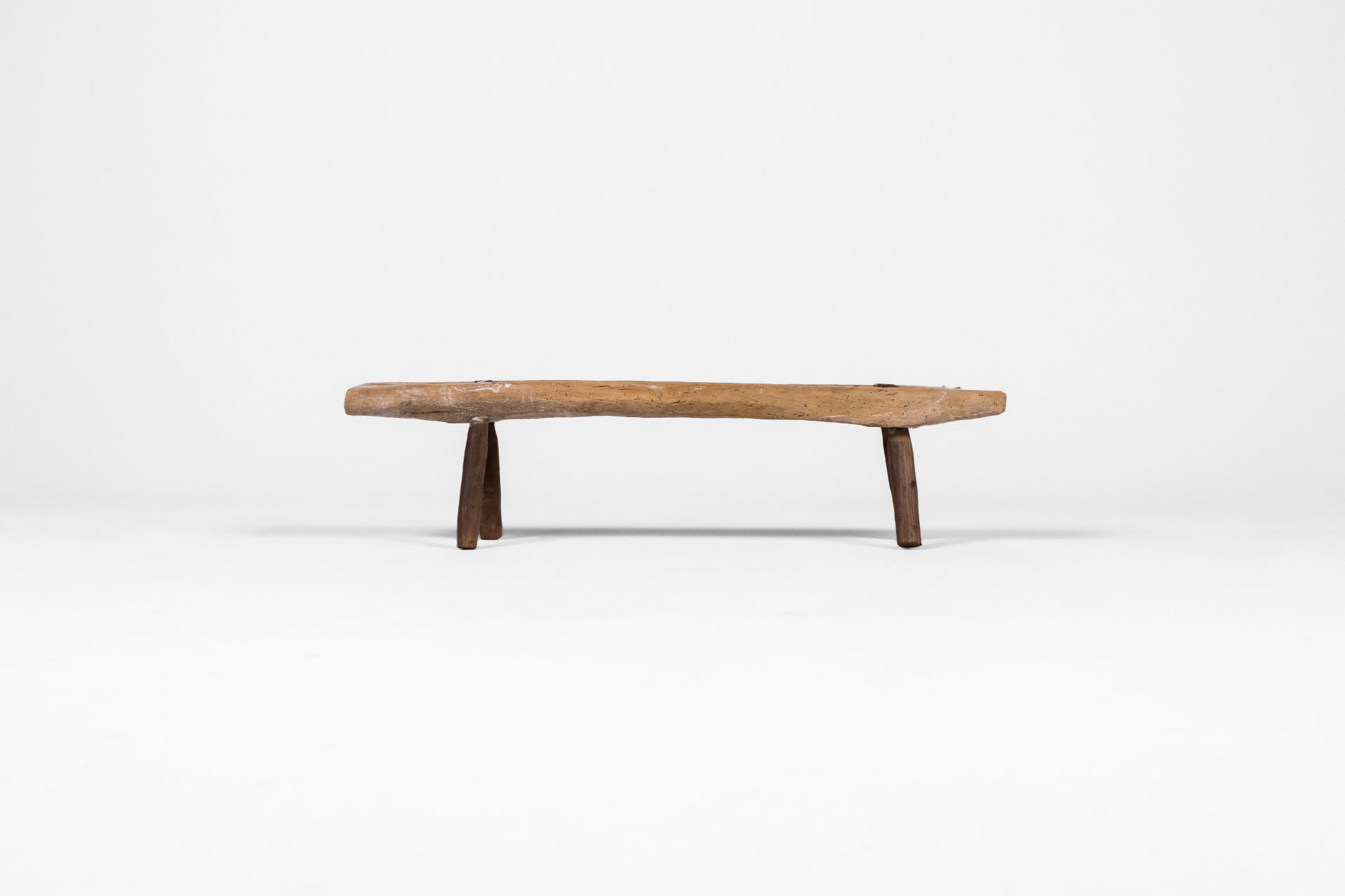Egyedi, rusztikus stílusú pad, természetes faanyagból készült, aszimmetrikus formával és masszív, fából készült lábakkal. A felület érdessége és a lábak természetes vonalai egyedi karaktert kölcsönöznek