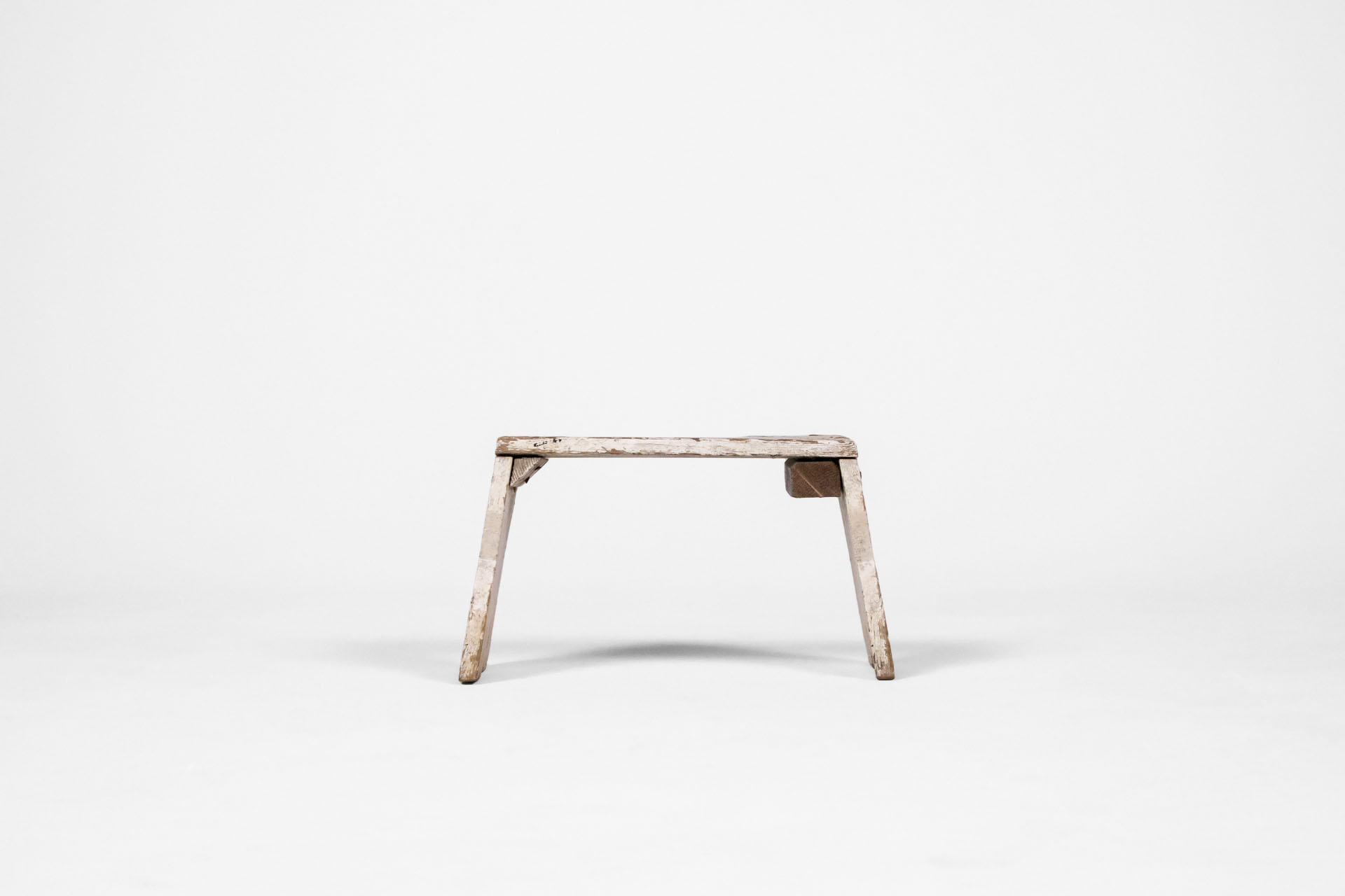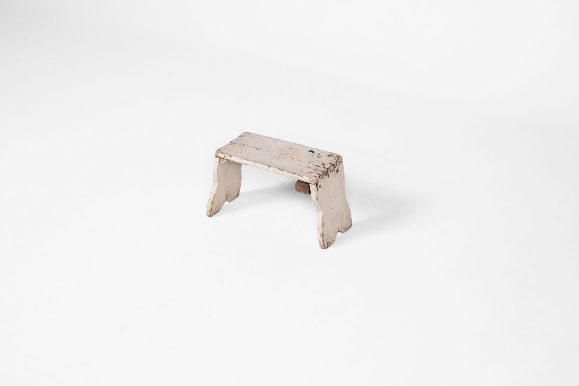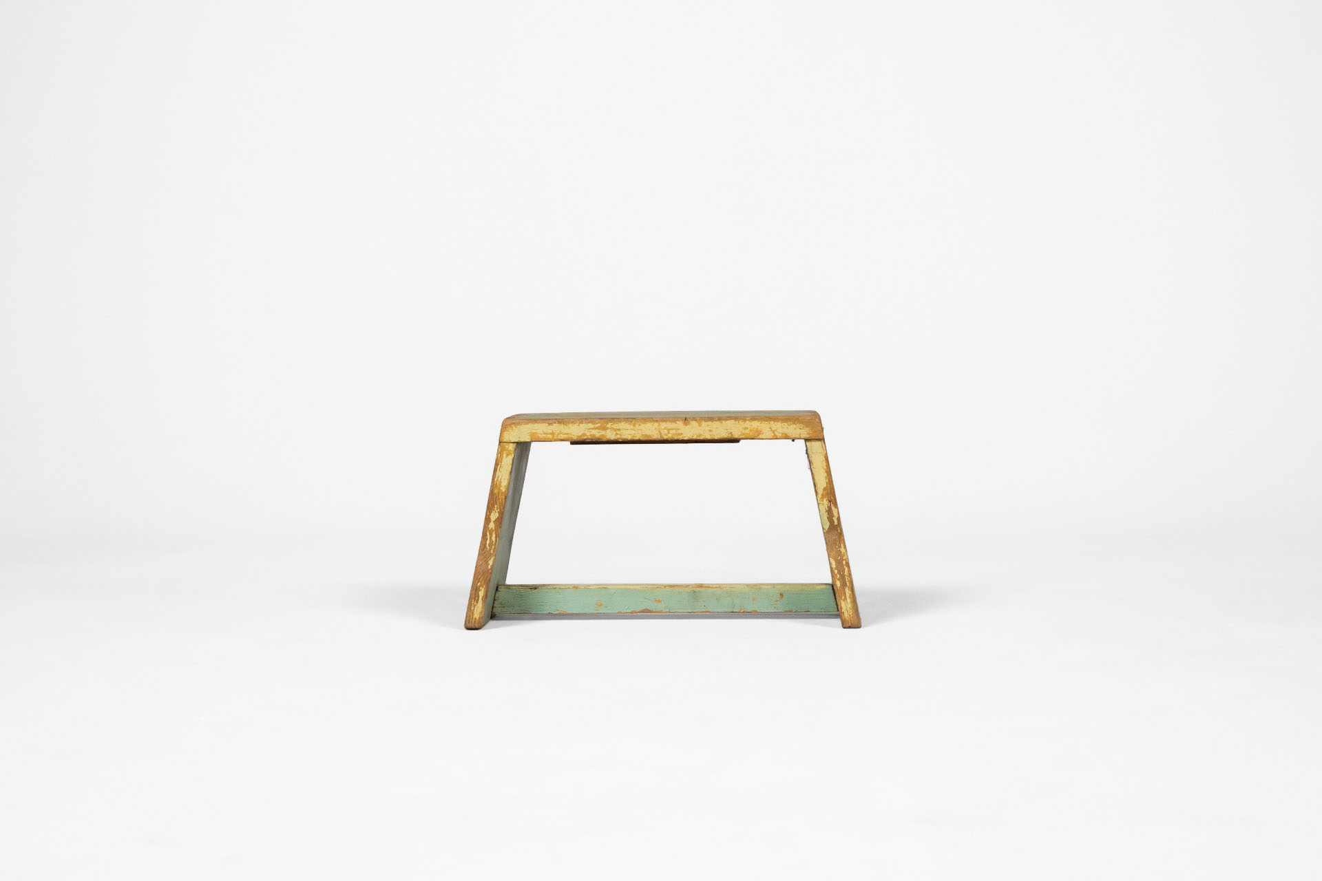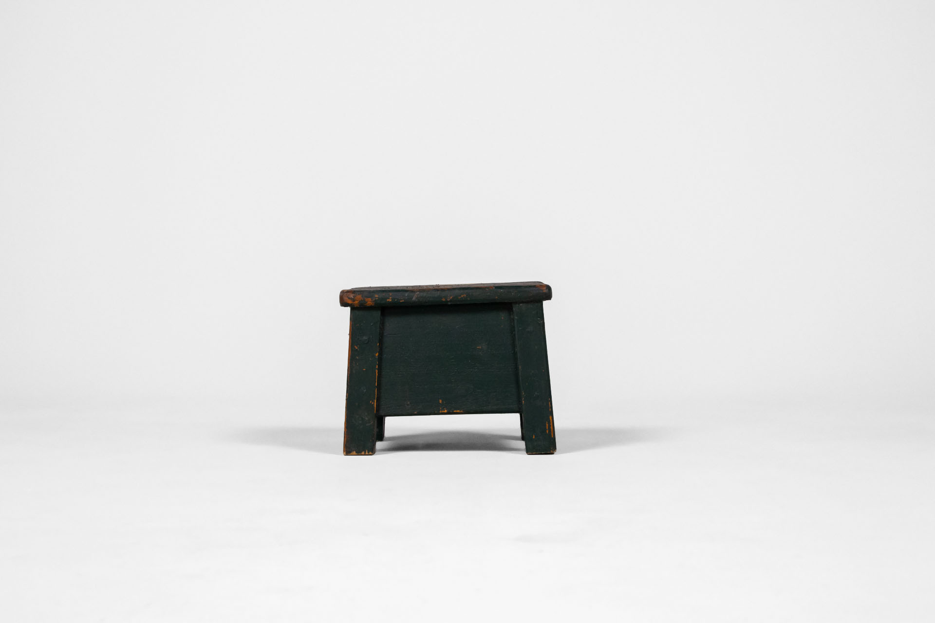 Retro stílusú, alacsony sámli, amely kopottas, zöldes árnyalatú festékkel van bevonva. A masszív, de egyszerű kialakítás lehetővé teszi, hogy praktikus használati tárgyként szolgáljon, miközben egyedi karaktert ad