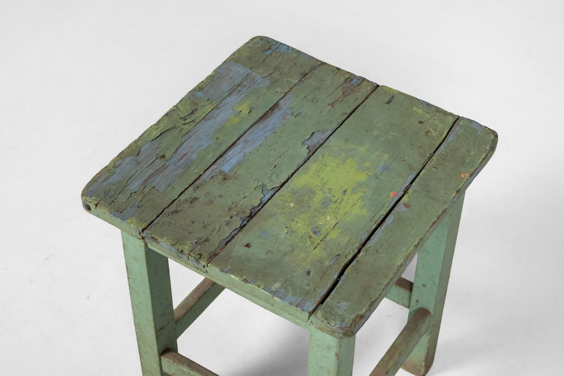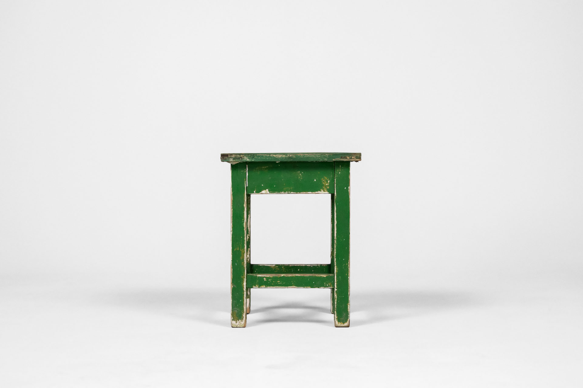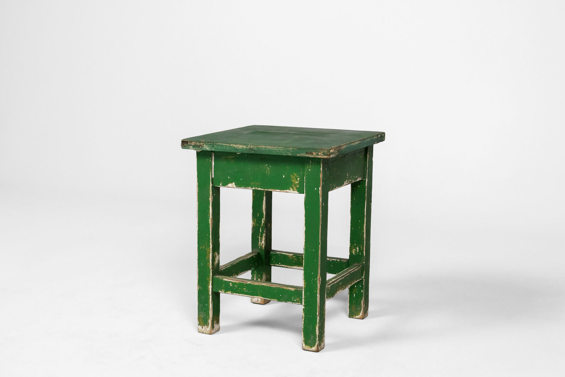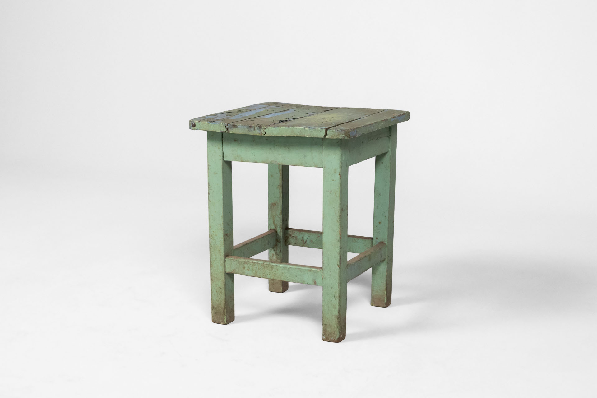 Egyszerű, négyzet alakú, zöld színű hokedli, amely vintage stílusával és kopottas felületével rusztikus hangulatot teremt bármely enteriőrben. Ideális kiegészítője lehet egy vidéki háznak vagy egy retro díszletnek