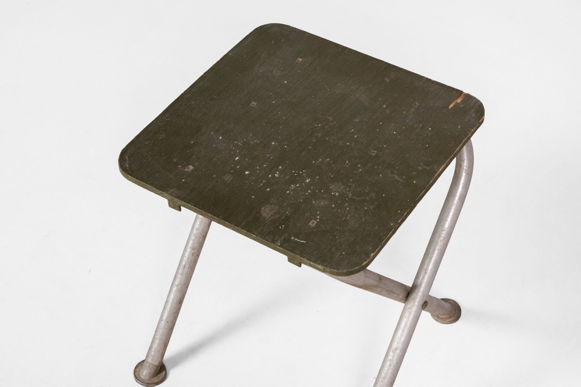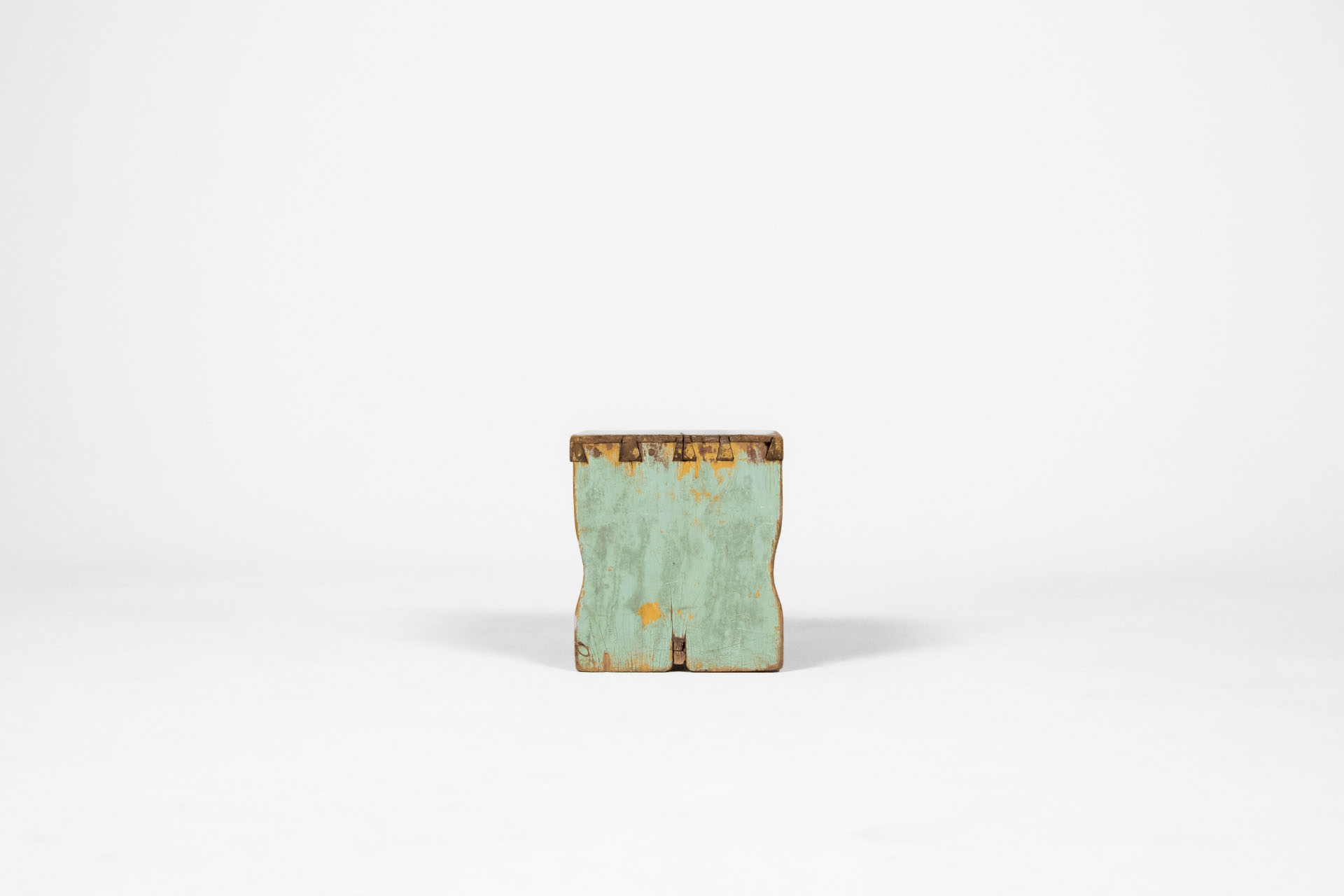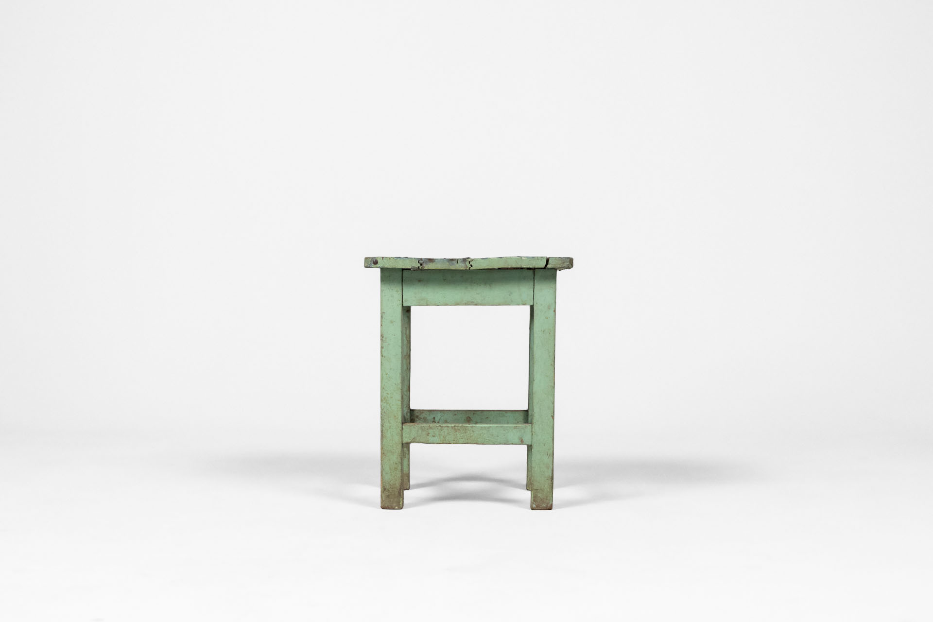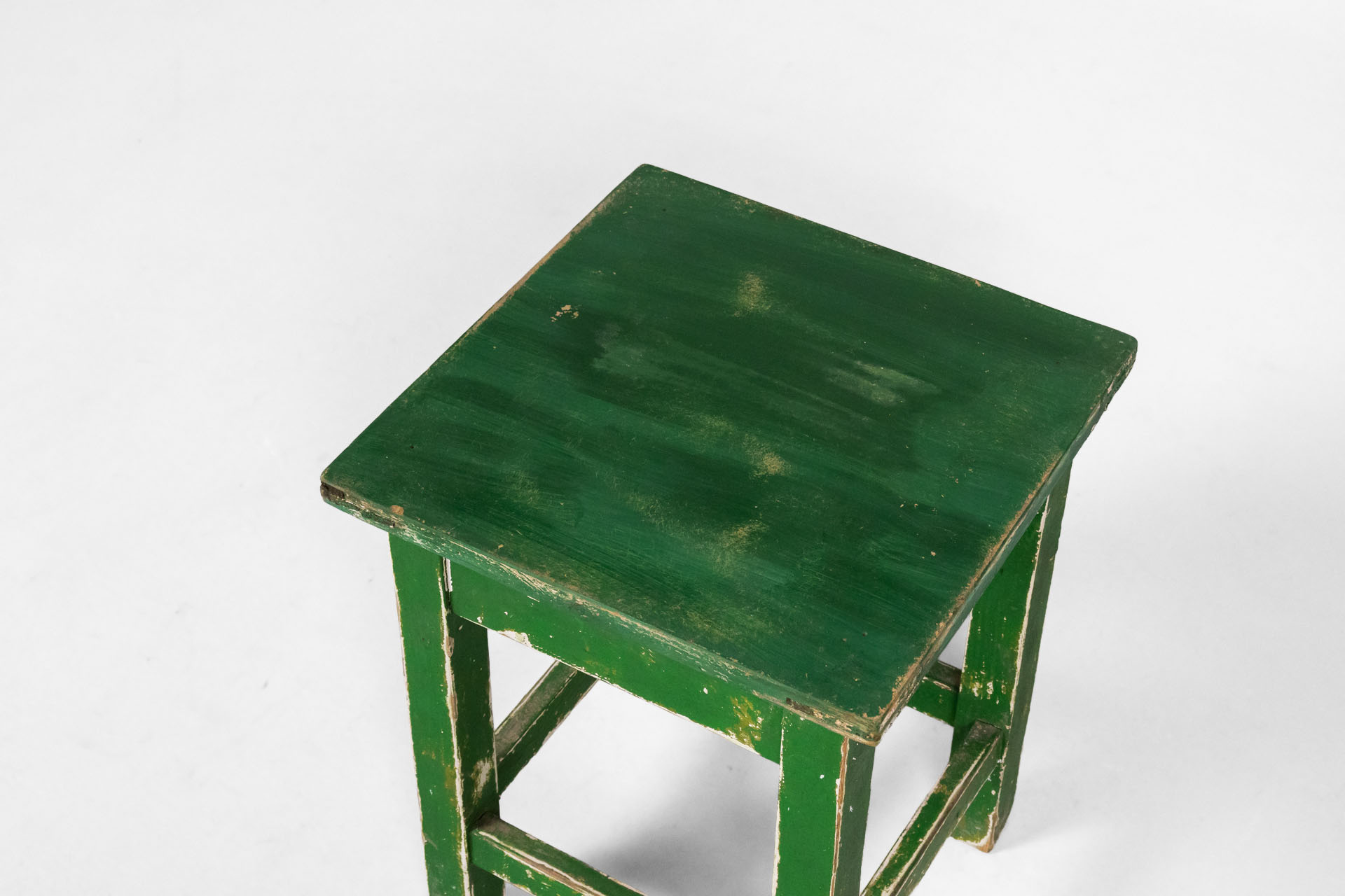 Egyszerű, négyzet alakú, zöld színű hokedli, amely vintage stílusával és kopottas felületével rusztikus hangulatot teremt bármely enteriőrben. Ideális kiegészítője lehet egy vidéki háznak vagy egy retro díszletnek