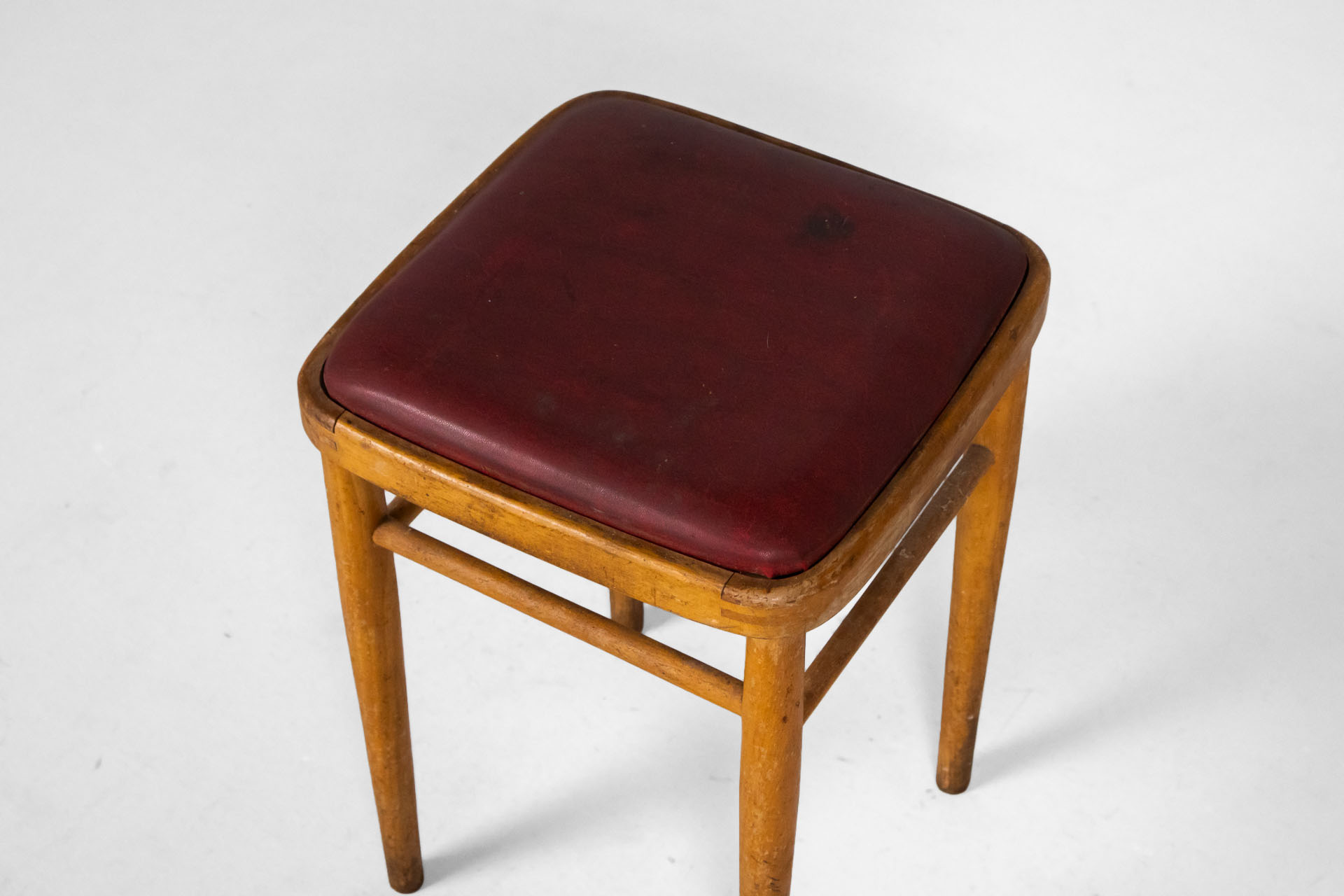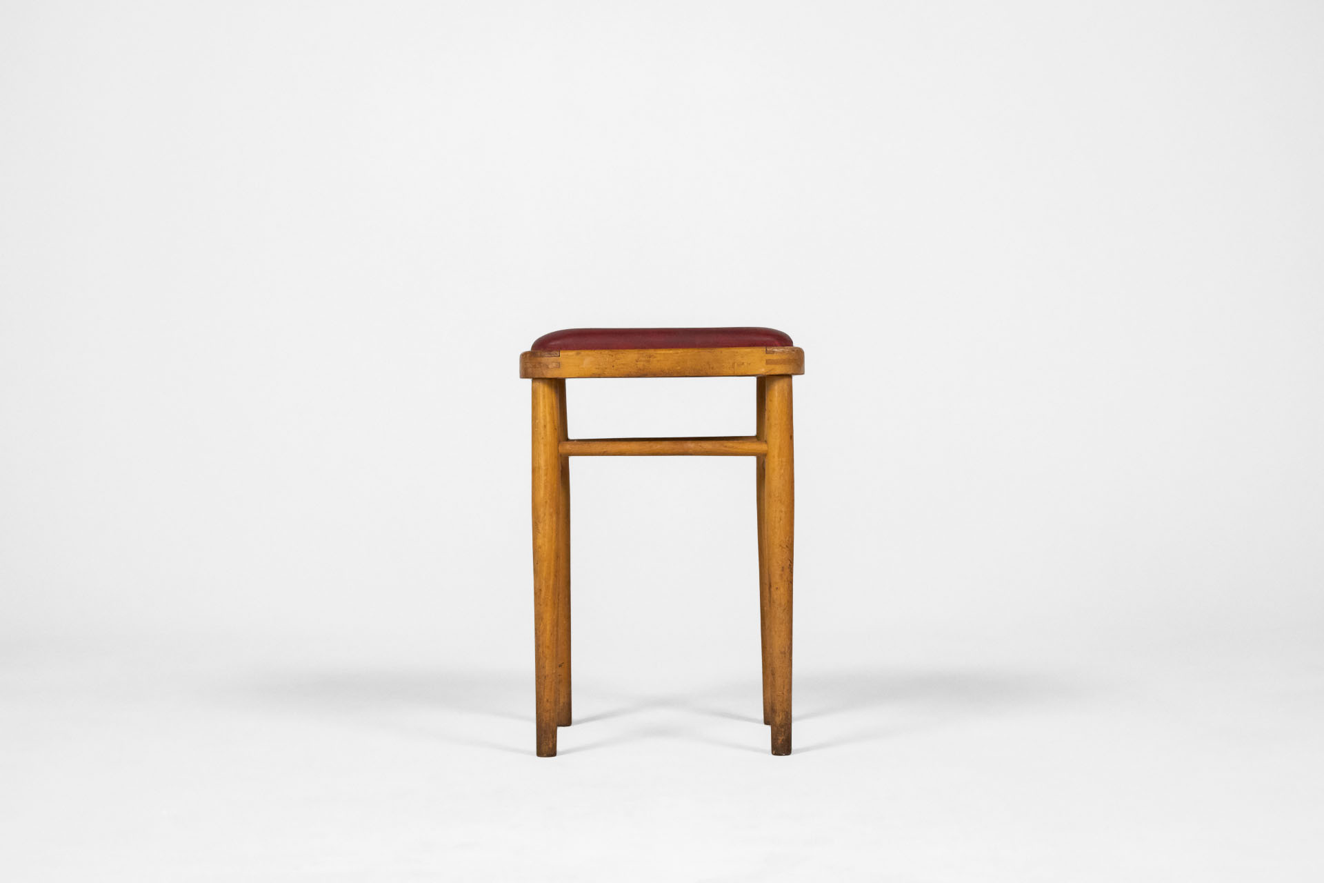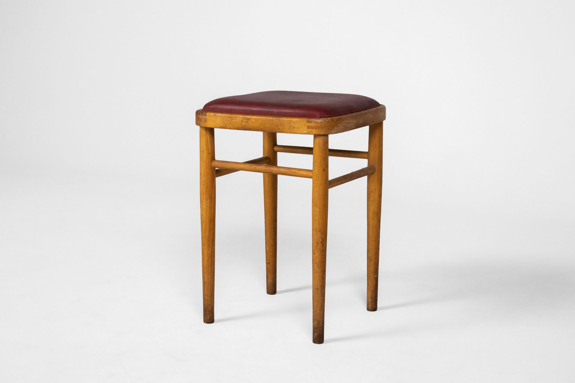 Egyszerű, de funkcionális dizájnú, vintage étkezőszék, amely fa kerettel és kényelmes, bordó színű bőr párnázással rendelkezik. A vékony lábakkal és a lekerekített ülőfelülettel, ideális választás retro stílusú enteriőrökbe