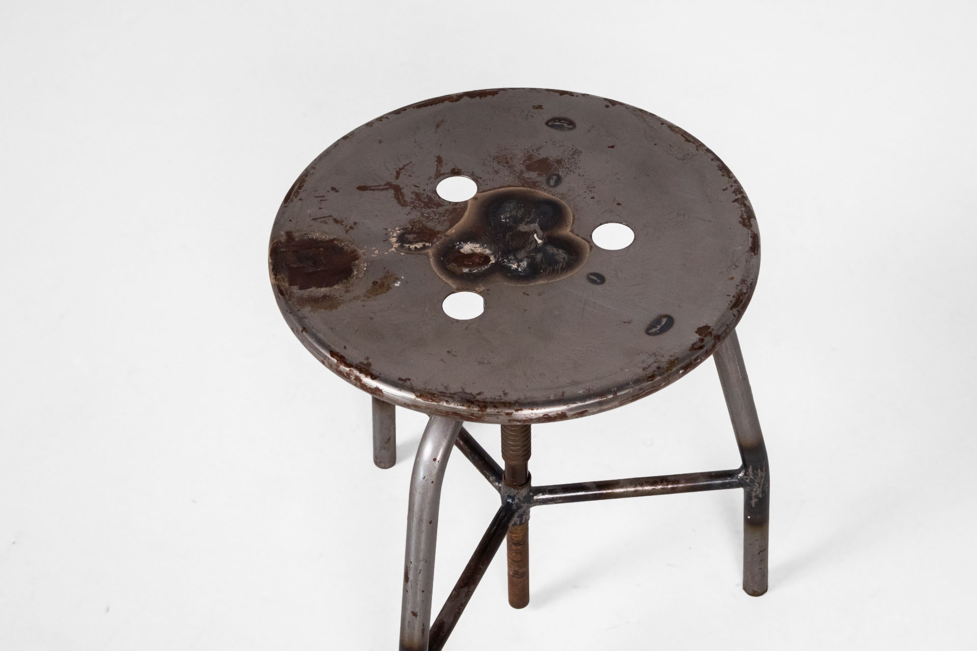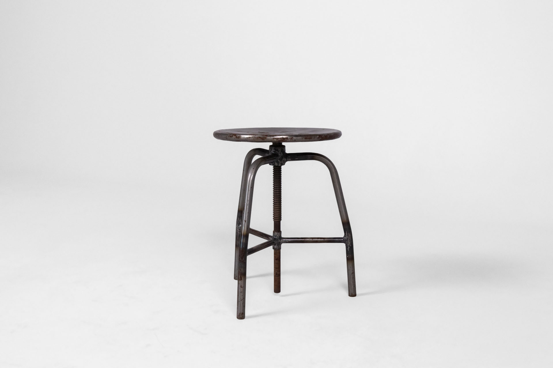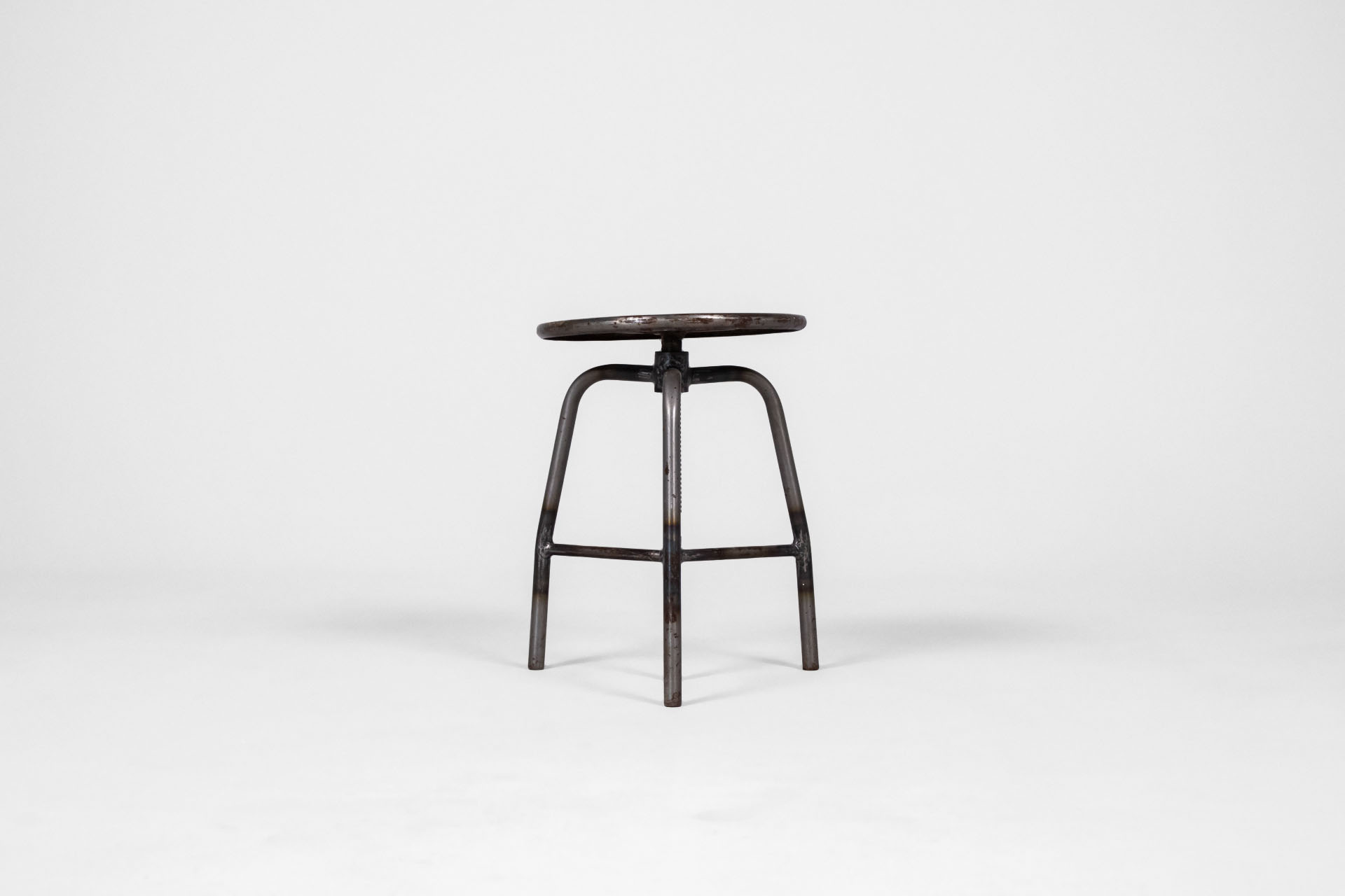 Modern, ipari stílusú fém forgószék, kör alakú ülőfelülettel és stabil, háromlábú szerkezettel. A szék egyszerű, de funkcionális kialakítása ideálissá teszi különböző környezetekben, legyen az egy műhely, egy bár...