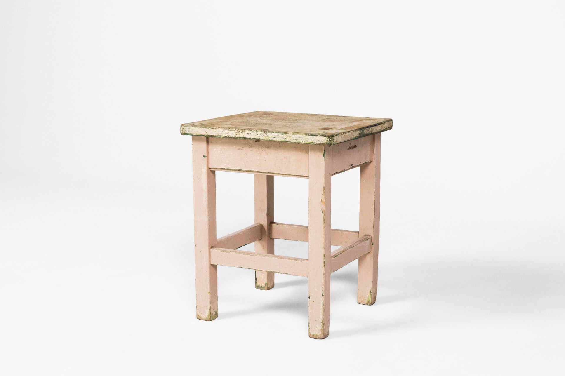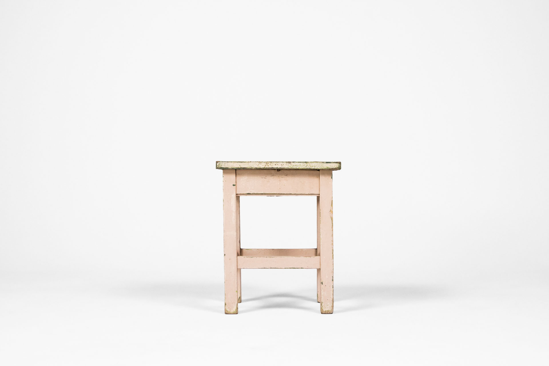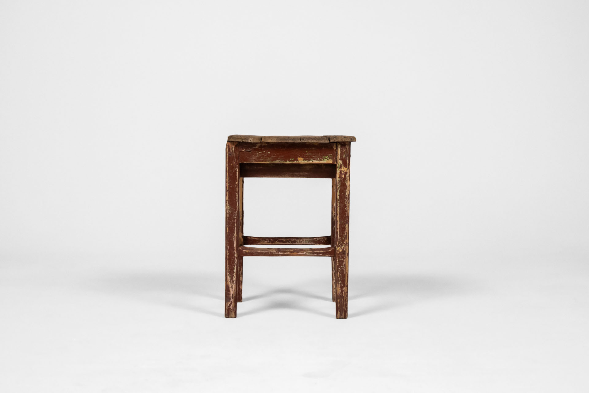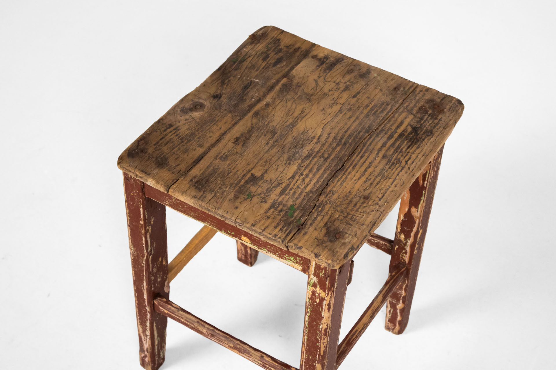 Vintage stílusú, négyzet alakú kis szék, amely elhasználódott, de karakteres megjelenésével bármely díszletbe autentikus hangulatot kölcsönöz. A kopott, festett felület és a rusztikus lábak egyedi bájt sugároznak