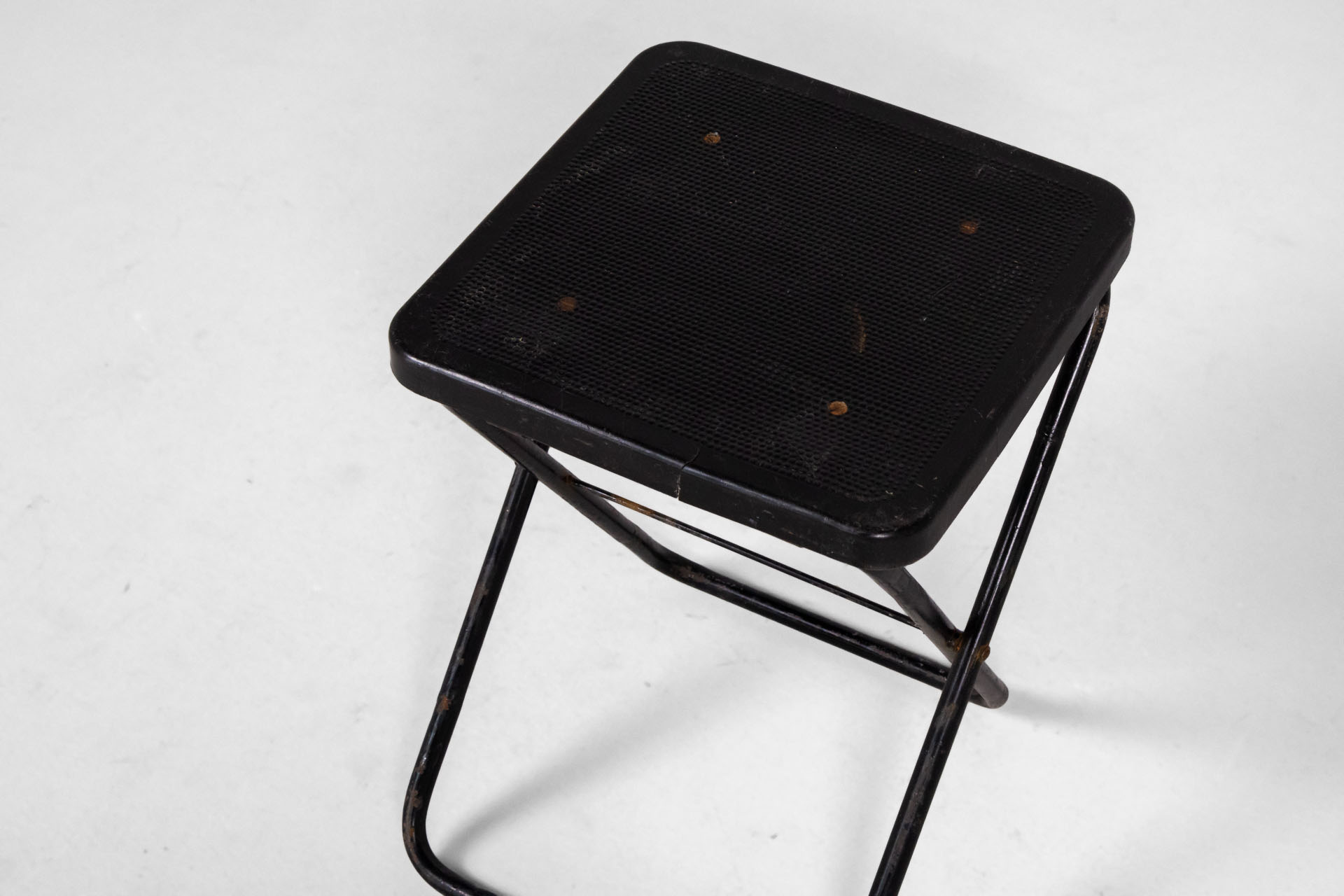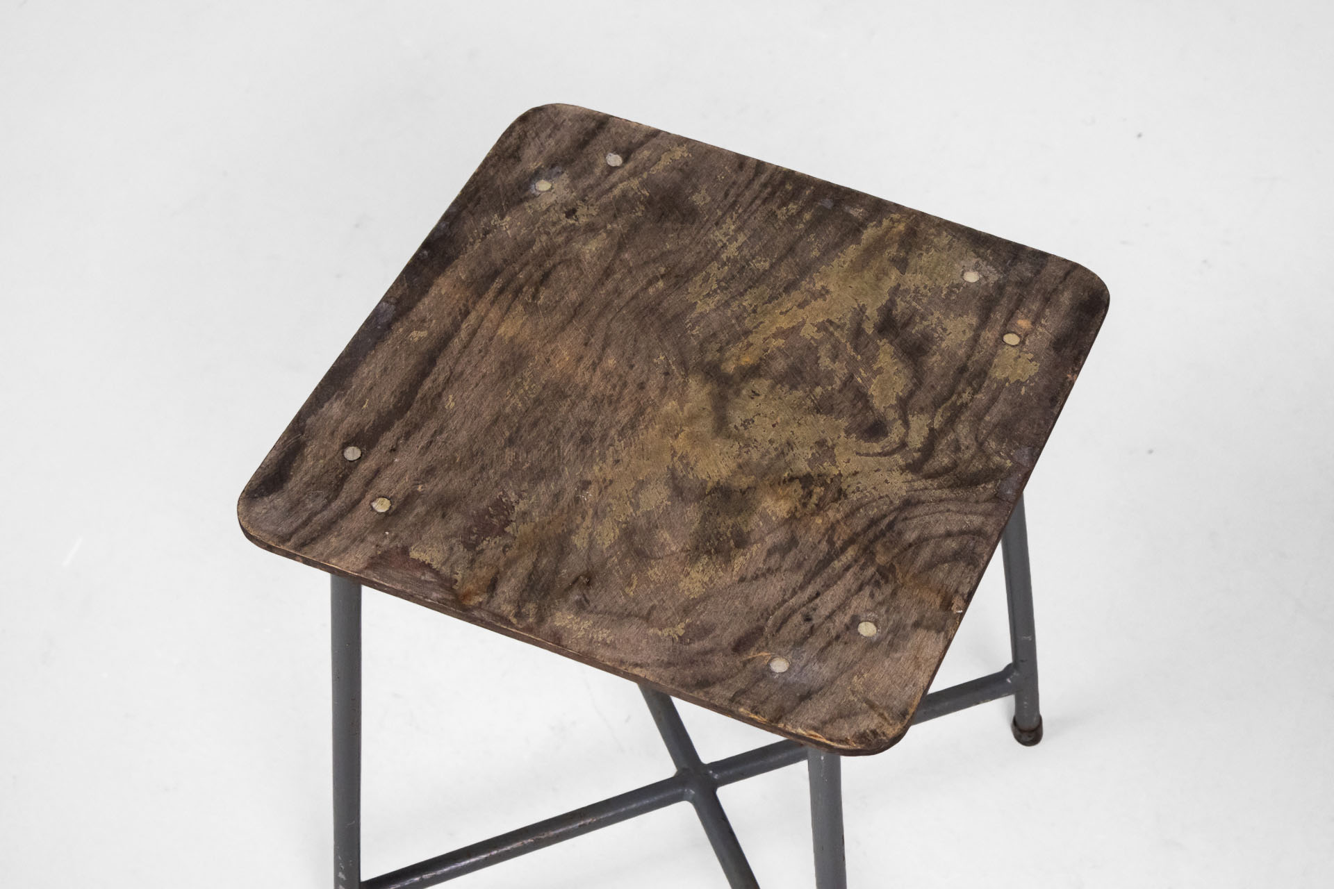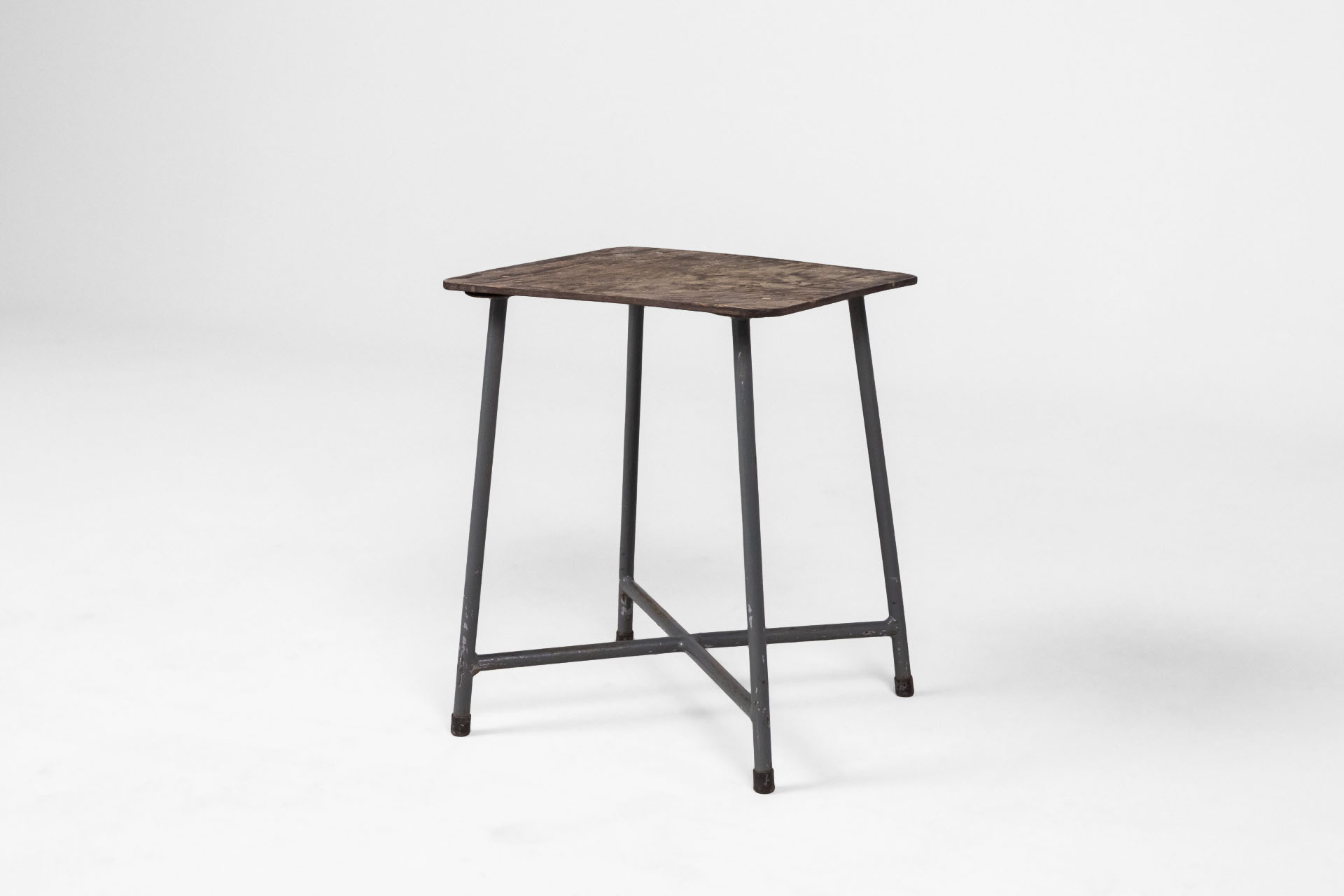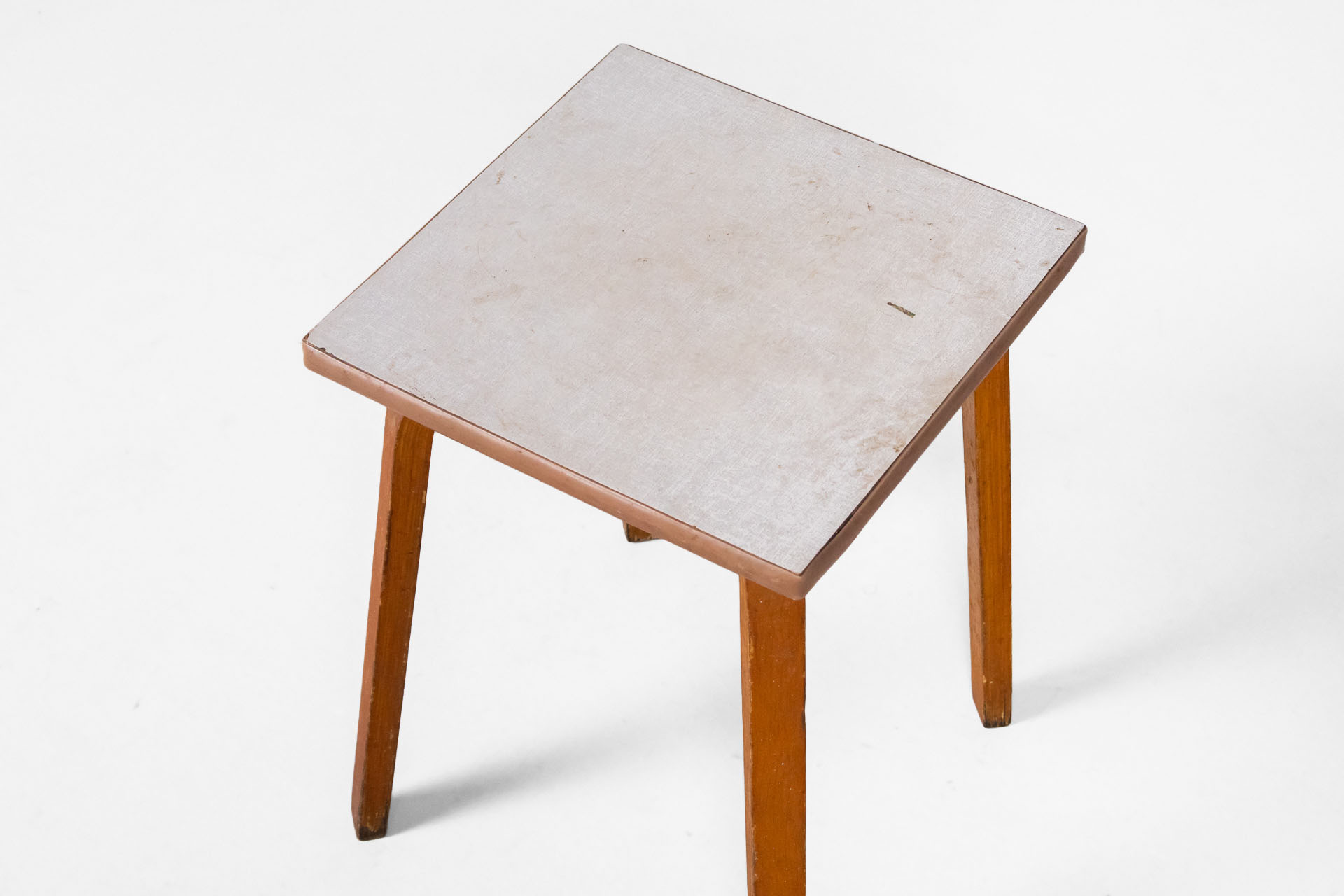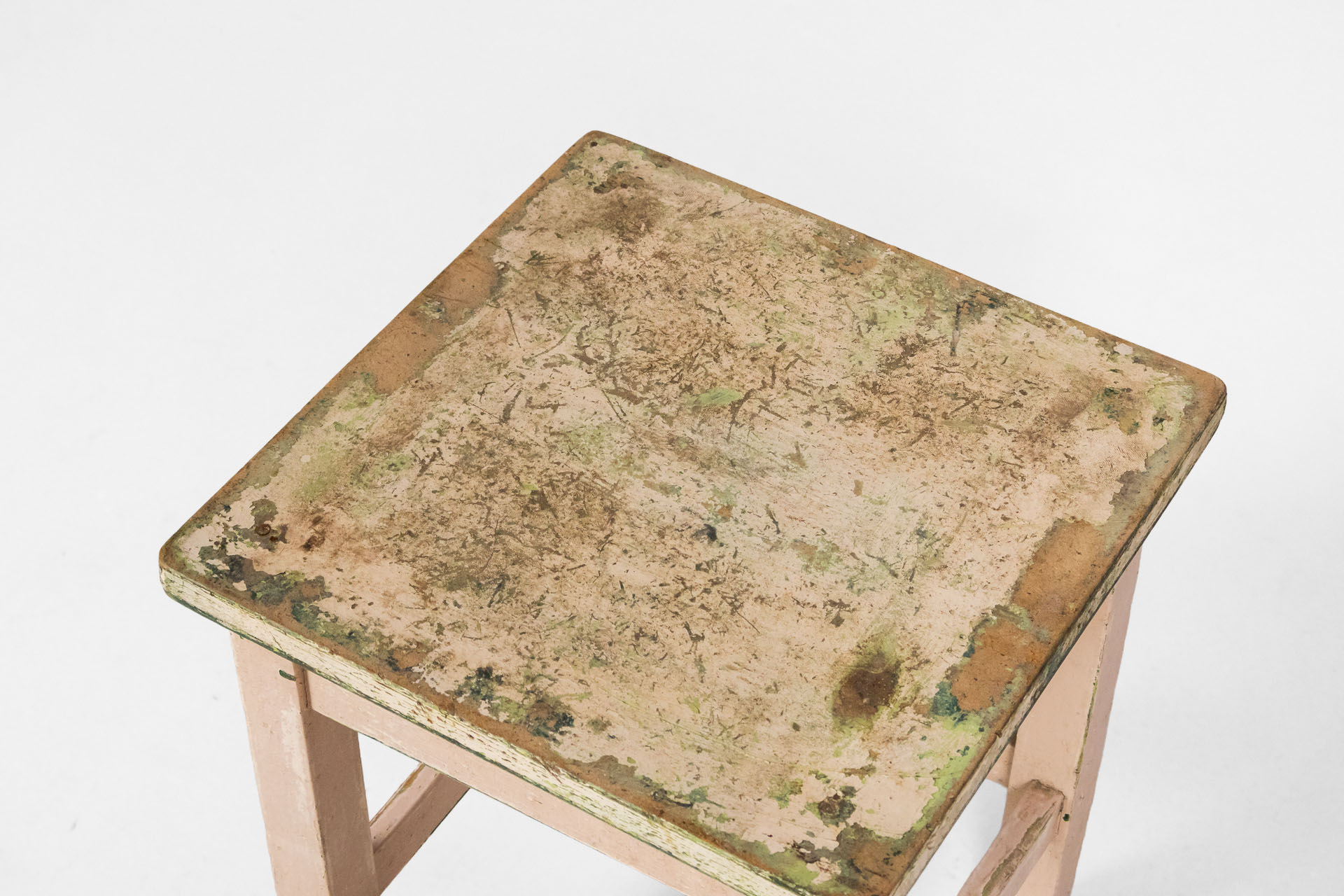 Vintage stílusú, négyzet alakú kis szék, amely elhasználódott, de karakteres megjelenésével bármely díszletbe autentikus hangulatot kölcsönöz. A kopott, festett felület és a rusztikus lábak egyedi bájt sugároznak