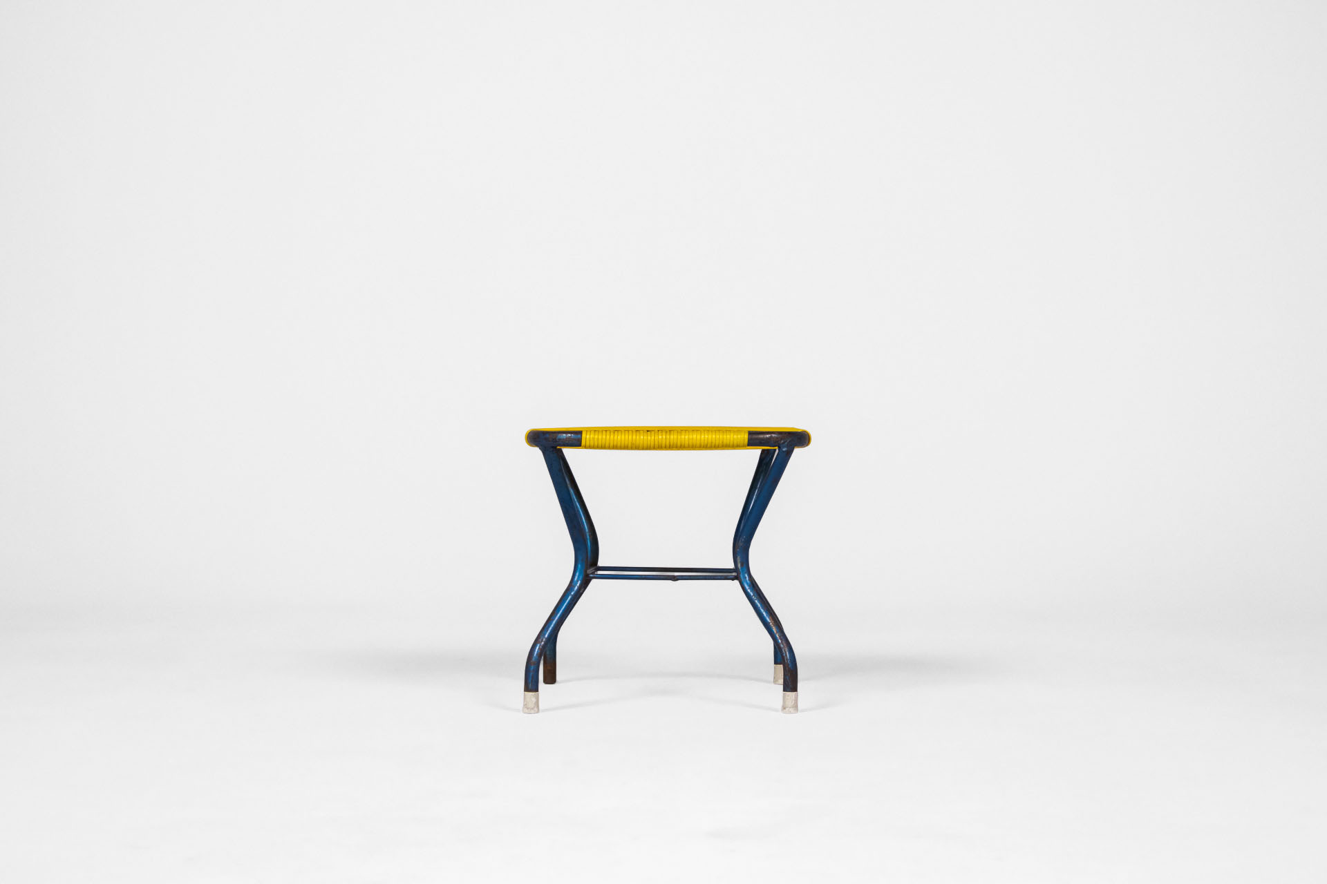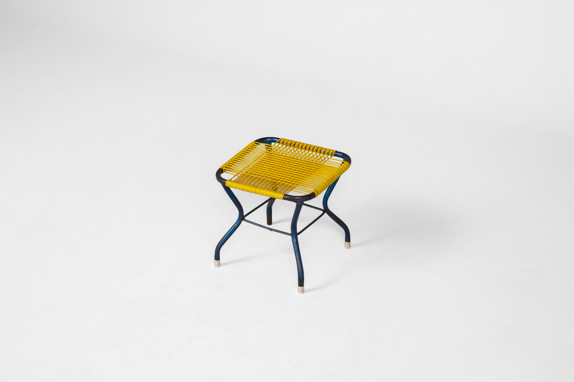 Modern, minimalista stílusú, négyzet alakú kis szék, amely színes fonott ülőfelülettel és fém vázszerkezettel rendelkezik. A sárga szín élénk megjelenést kölcsönöz, míg a kék váz stabilitást biztosít. Ideális...