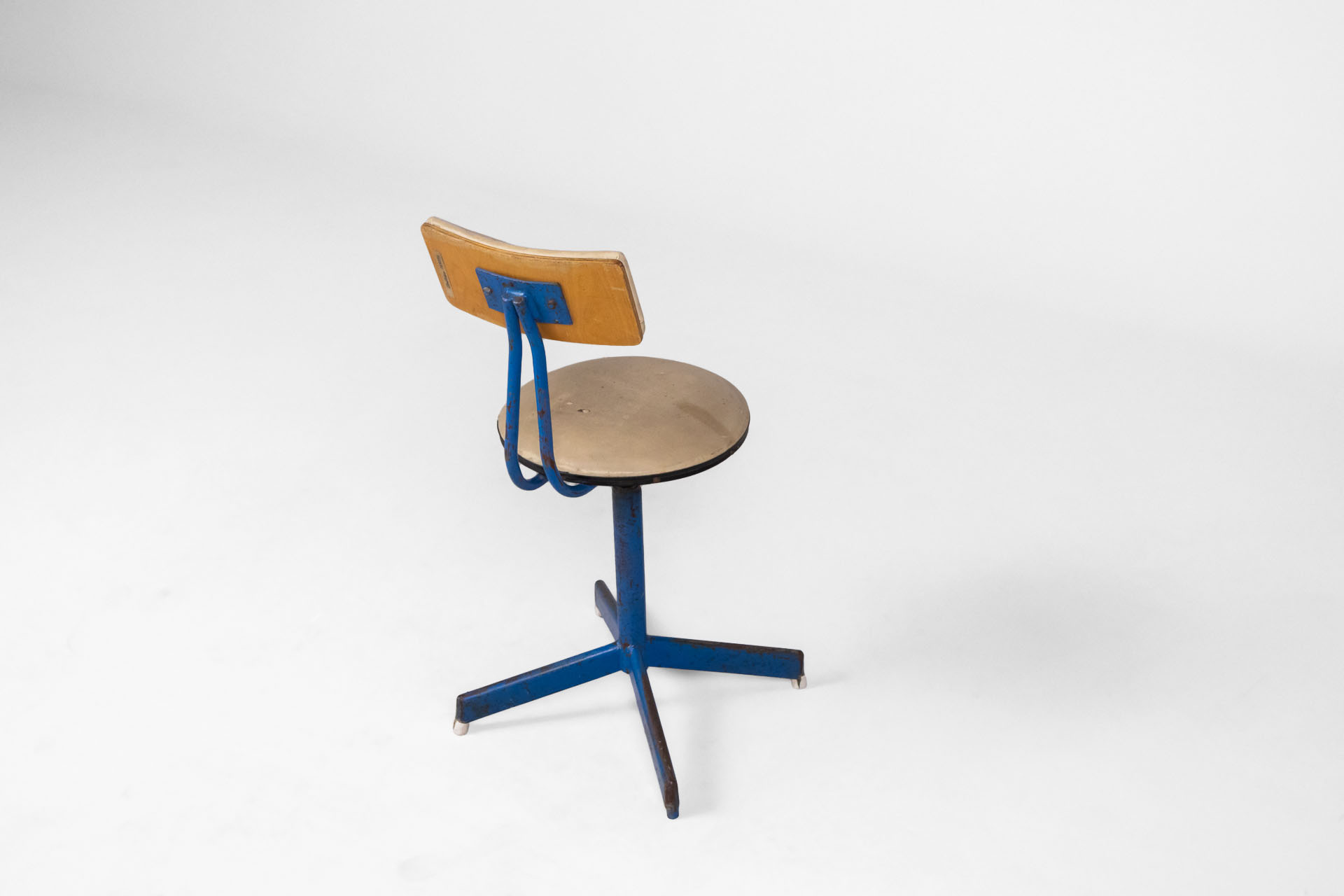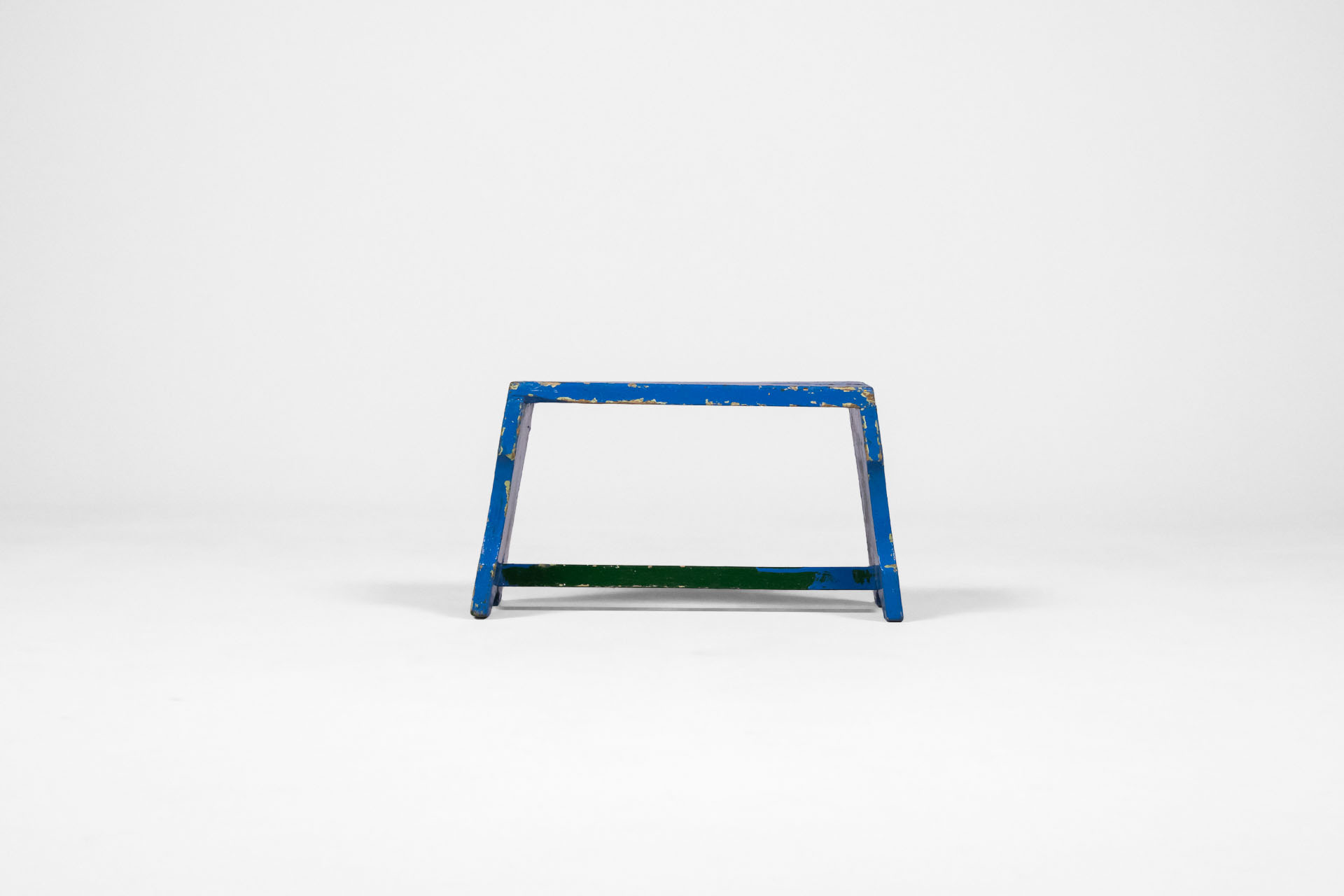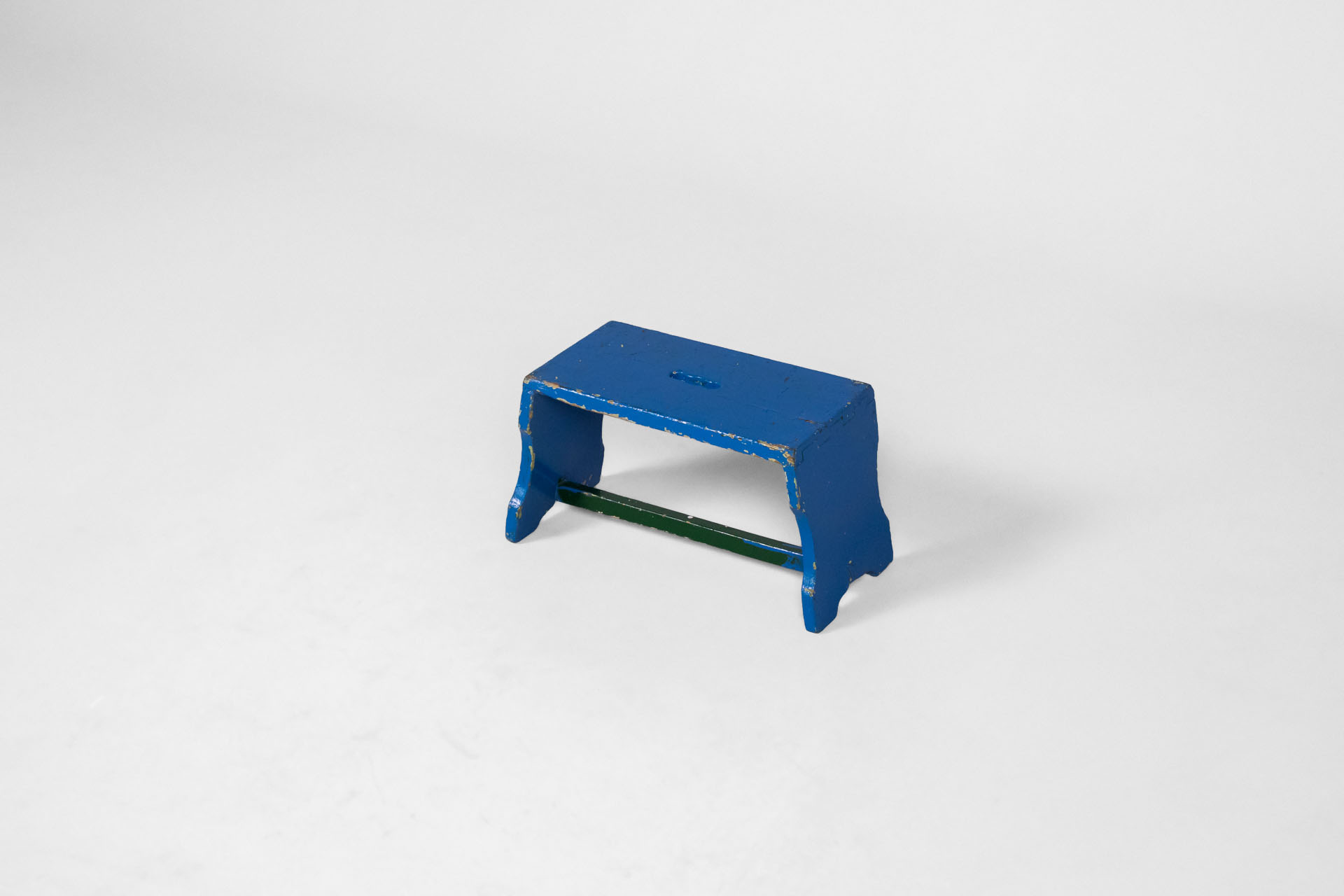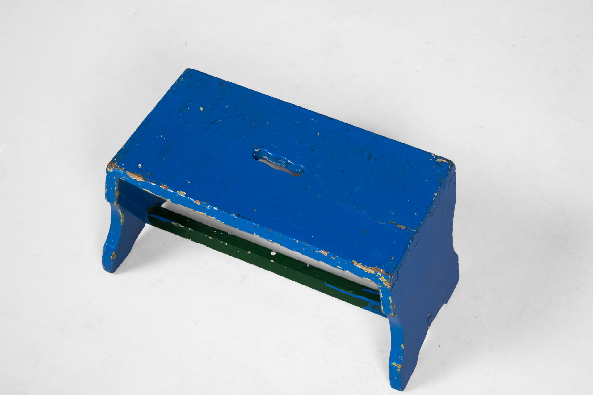 Egyszerű, funkcionális sámli, élénk kék színben, amely vintage megjelenést kölcsönöz. A kopottas felület és a festékhibák karakteres megjelenést kölcsönöznek, ideálissá téve retro stílusú enteriőrökbe