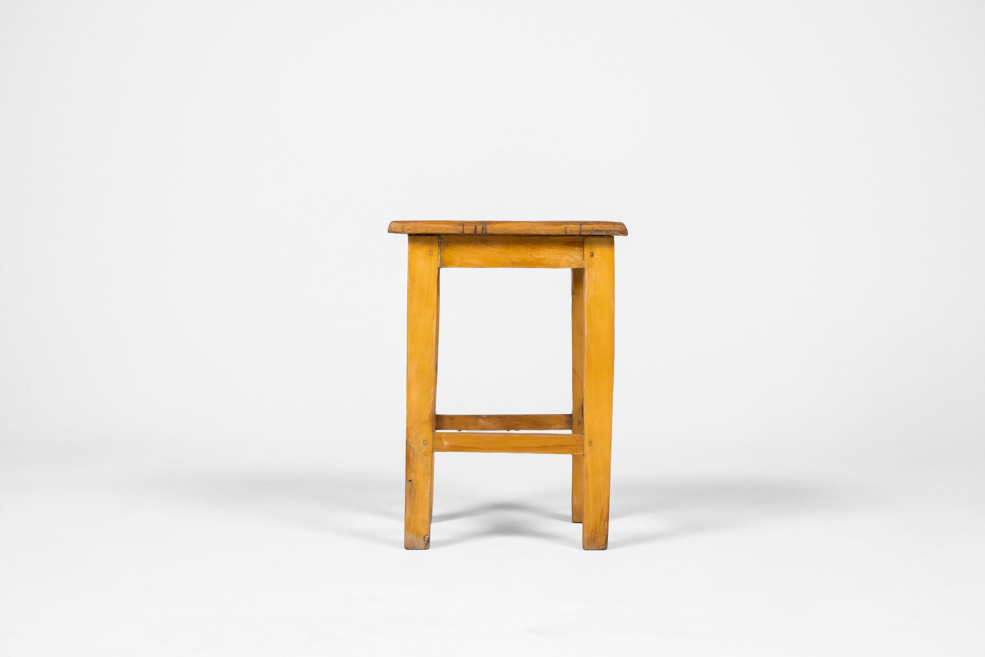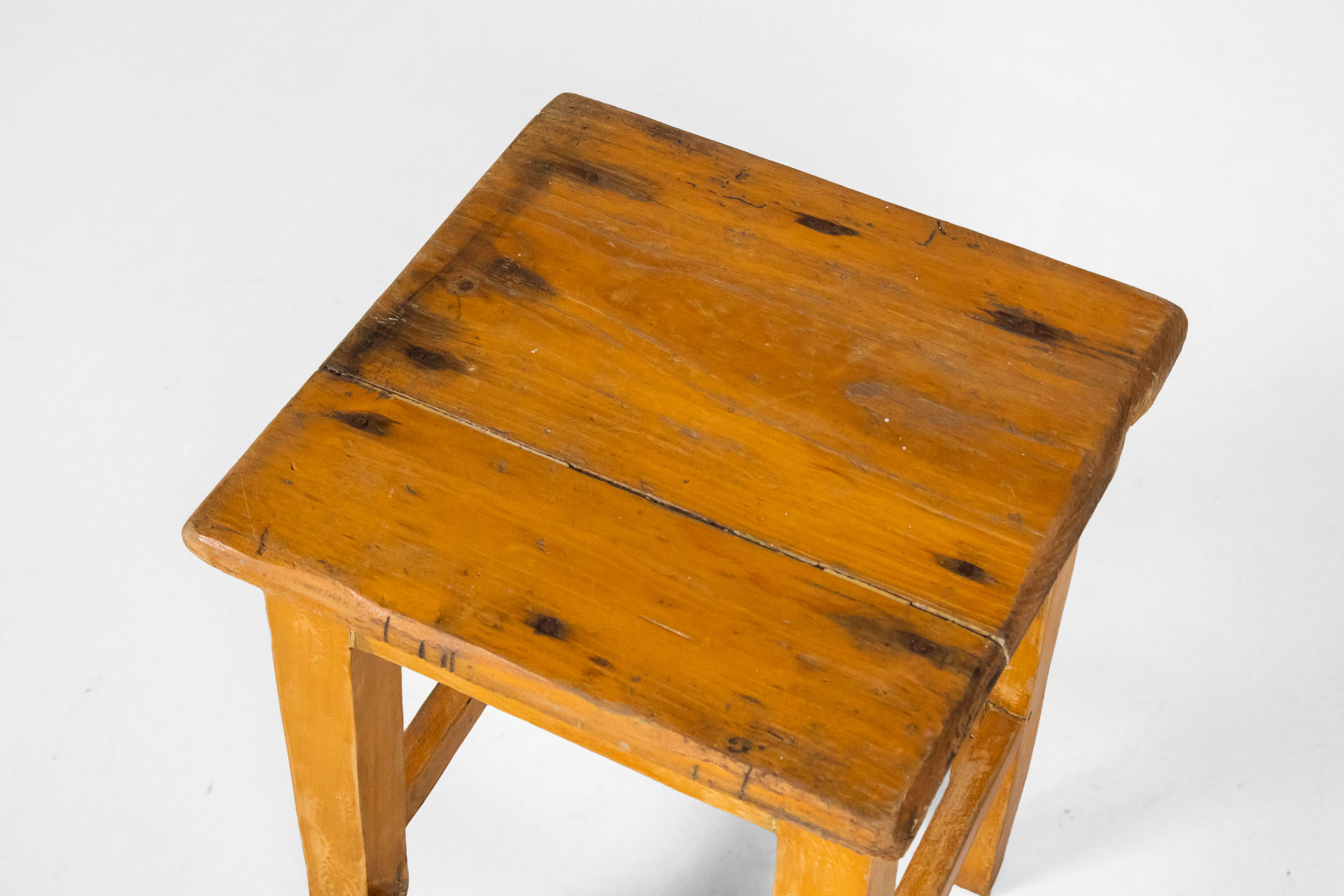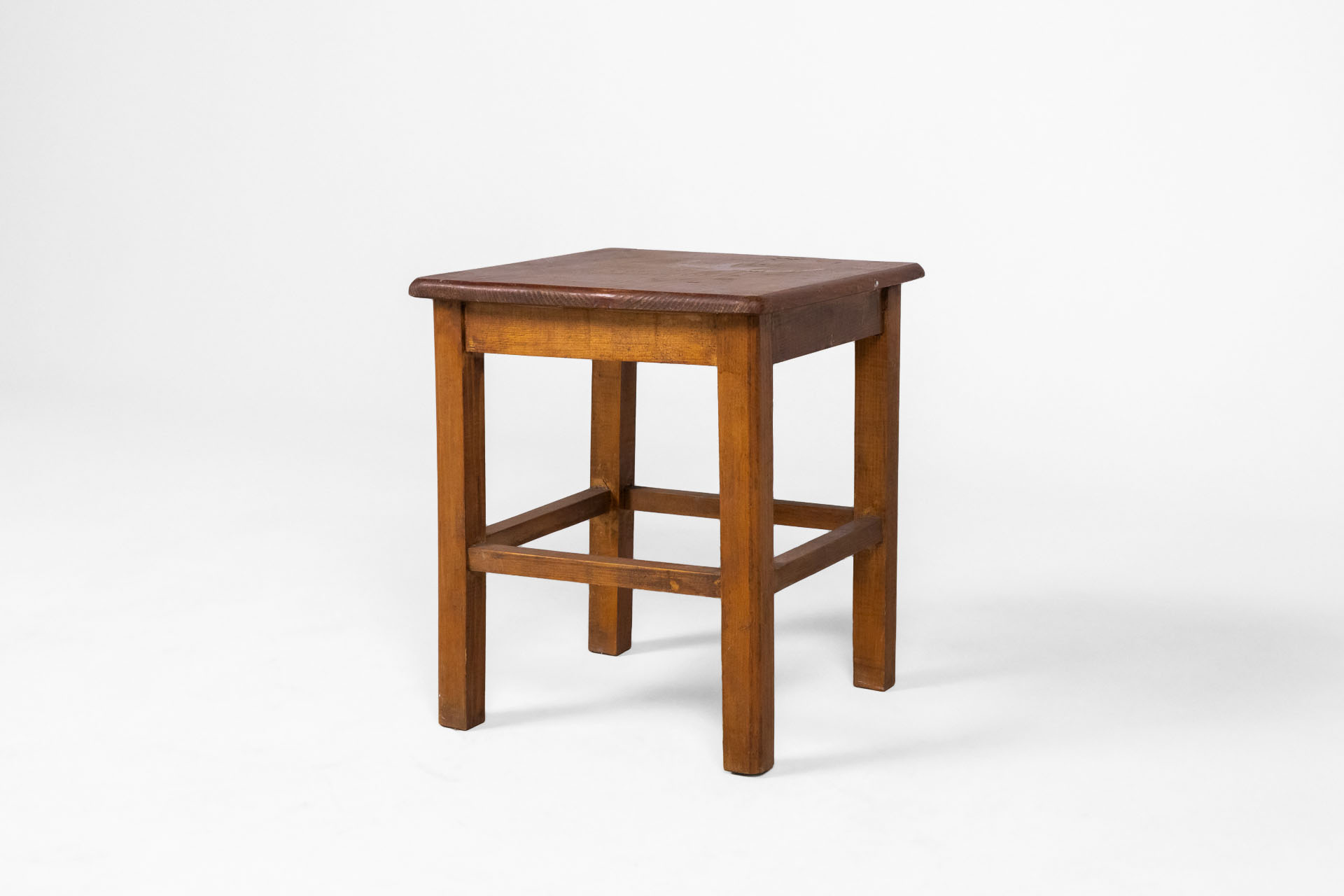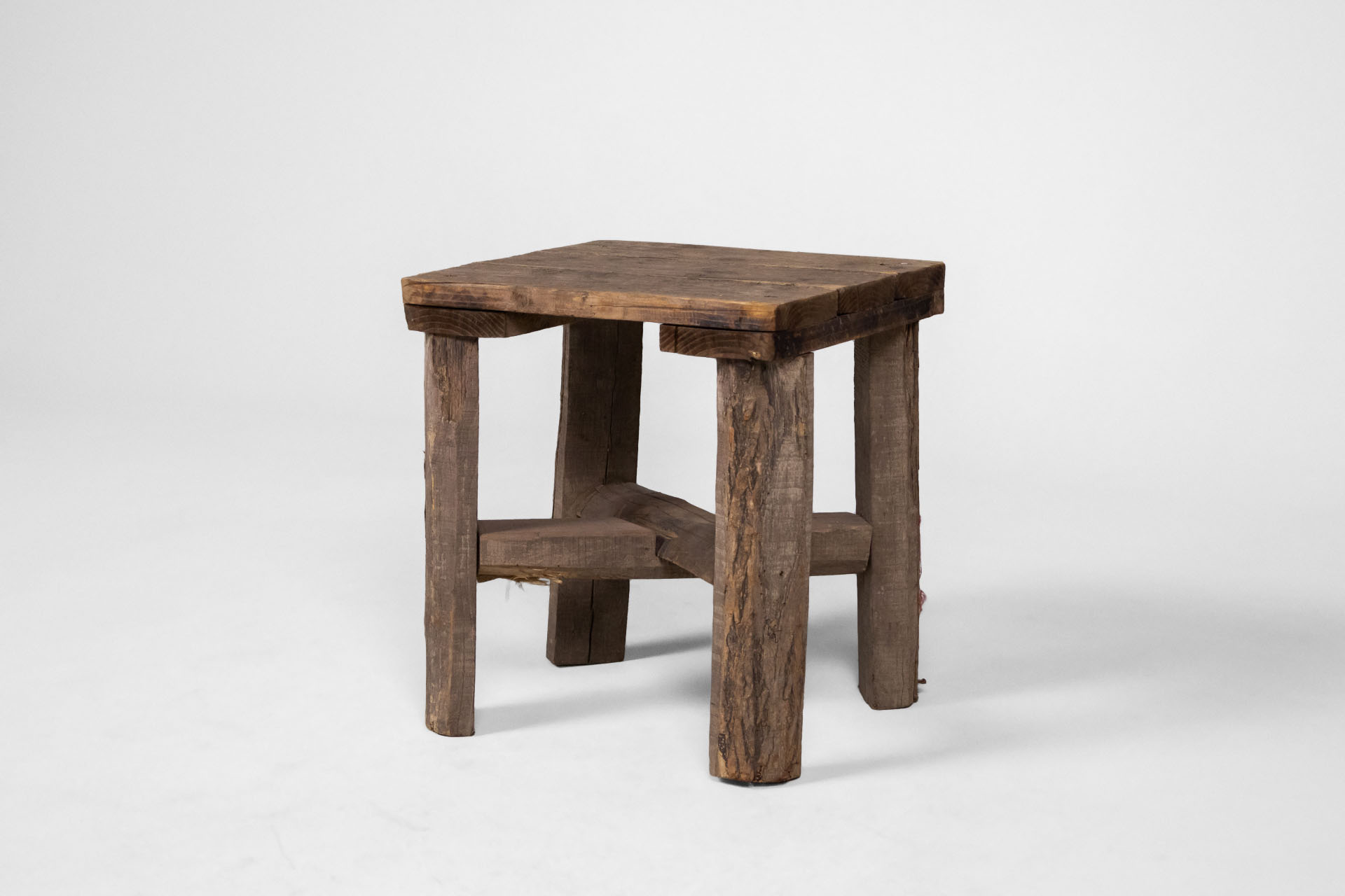 Egyszerű, rusztikus stílusú, négyzet alakú ülőke, masszív fából készült, természetes felülettel, amely a vidéki élet hangulatát idézi