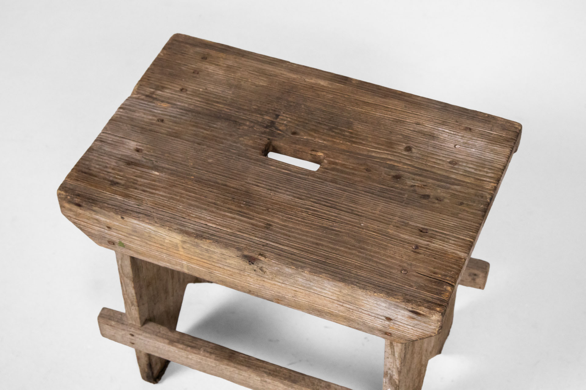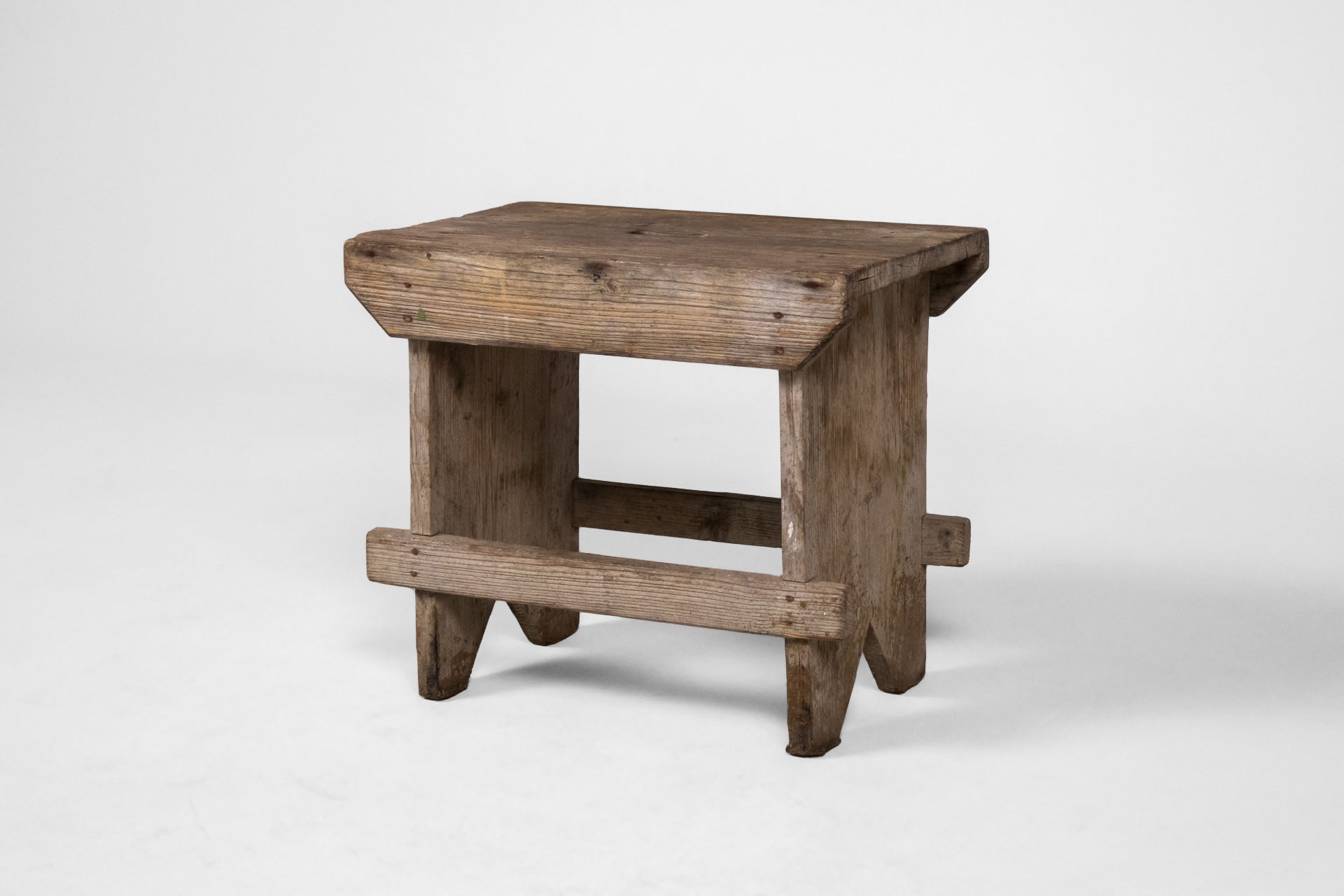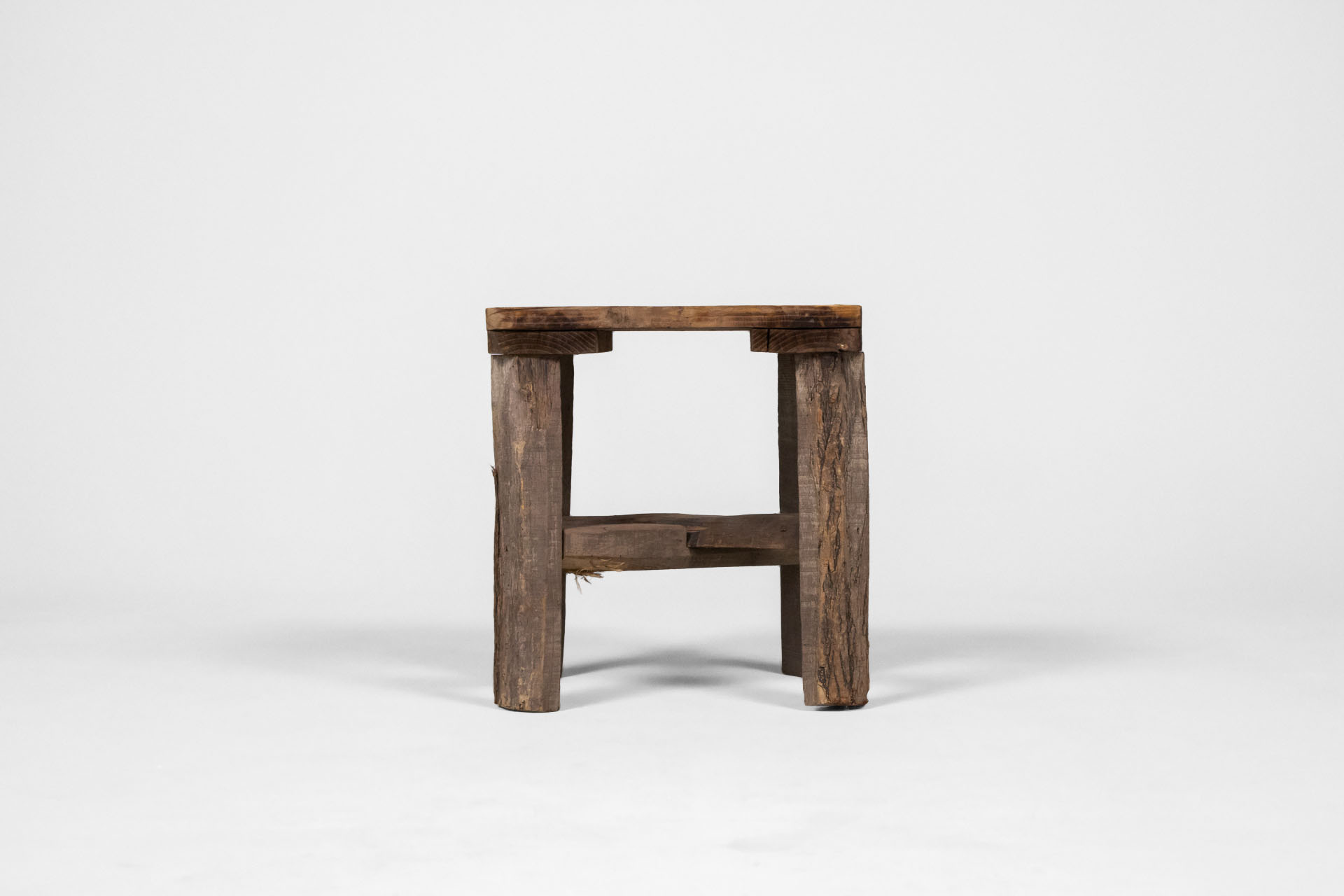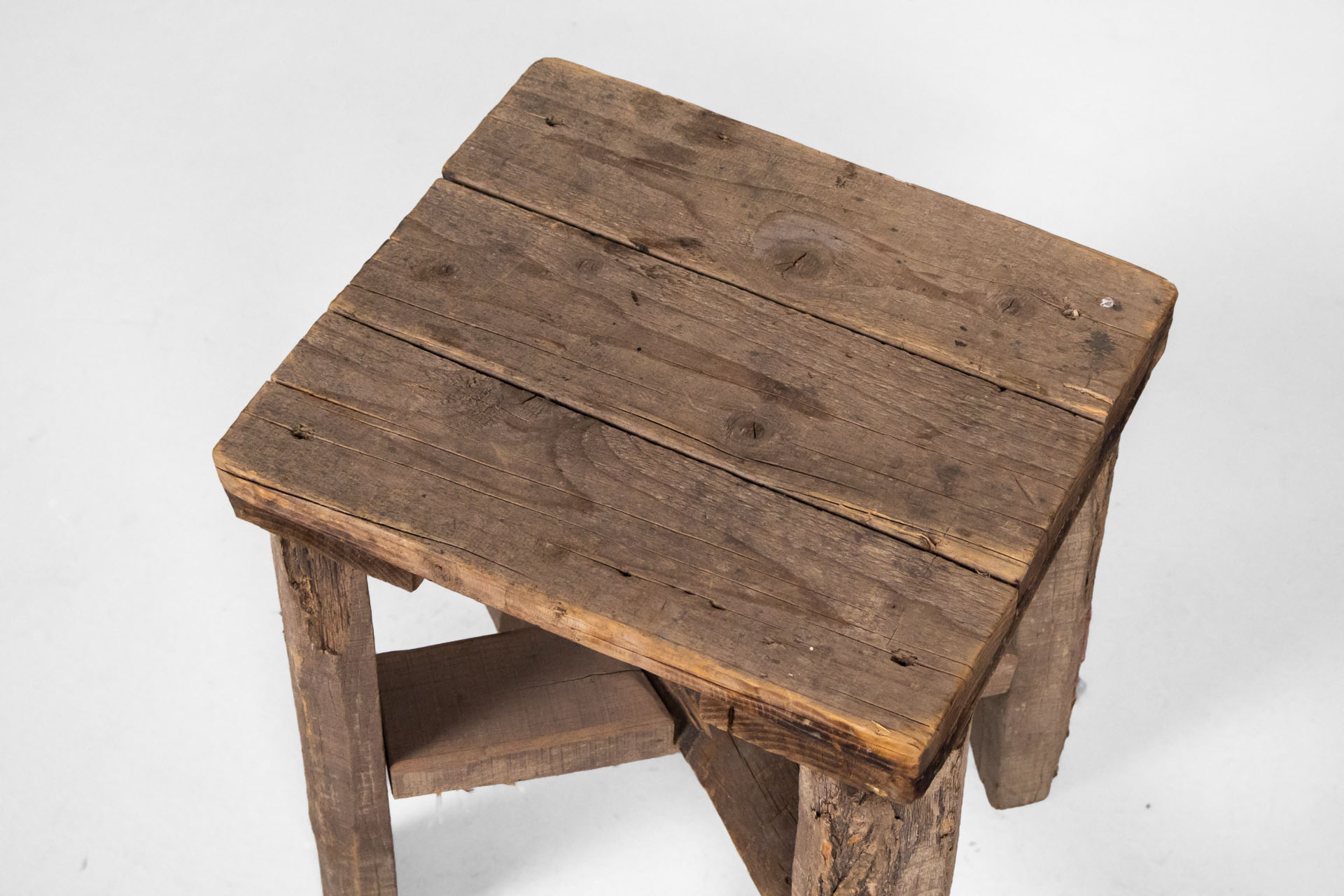 Egyszerű, rusztikus stílusú, négyzet alakú ülőke, masszív fából készült, természetes felülettel, amely a vidéki élet hangulatát idézi