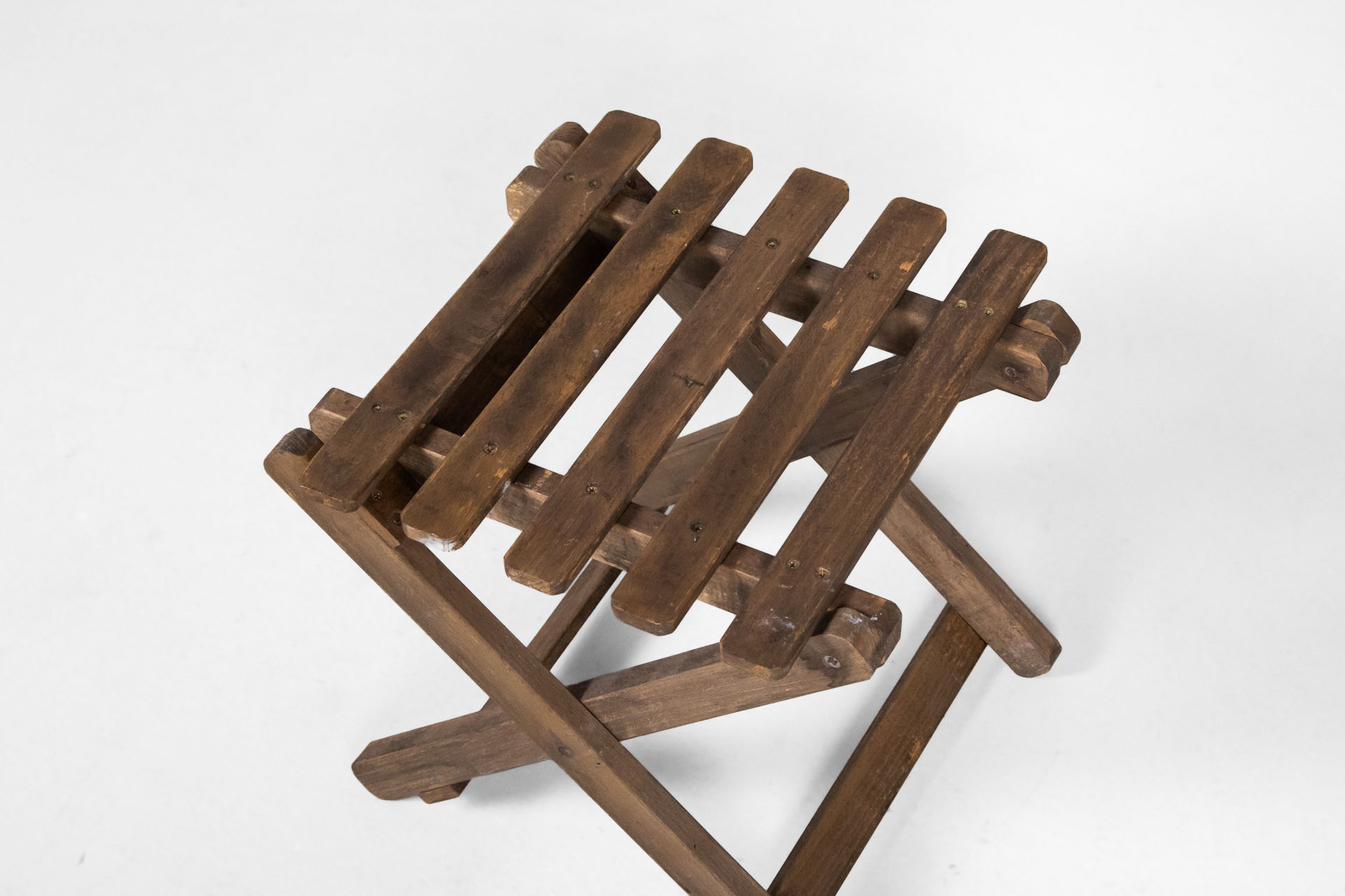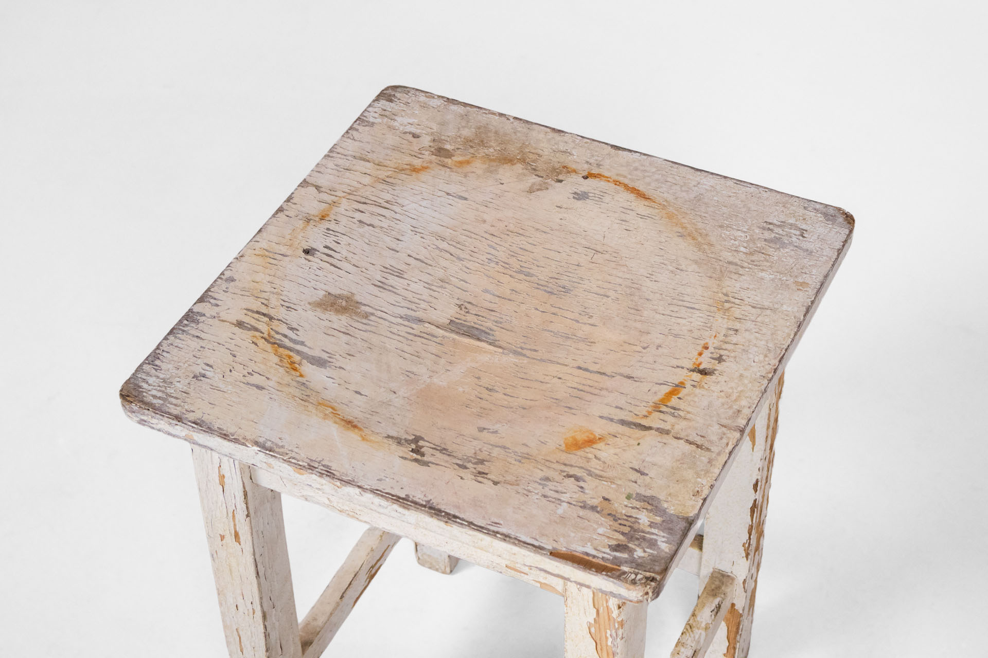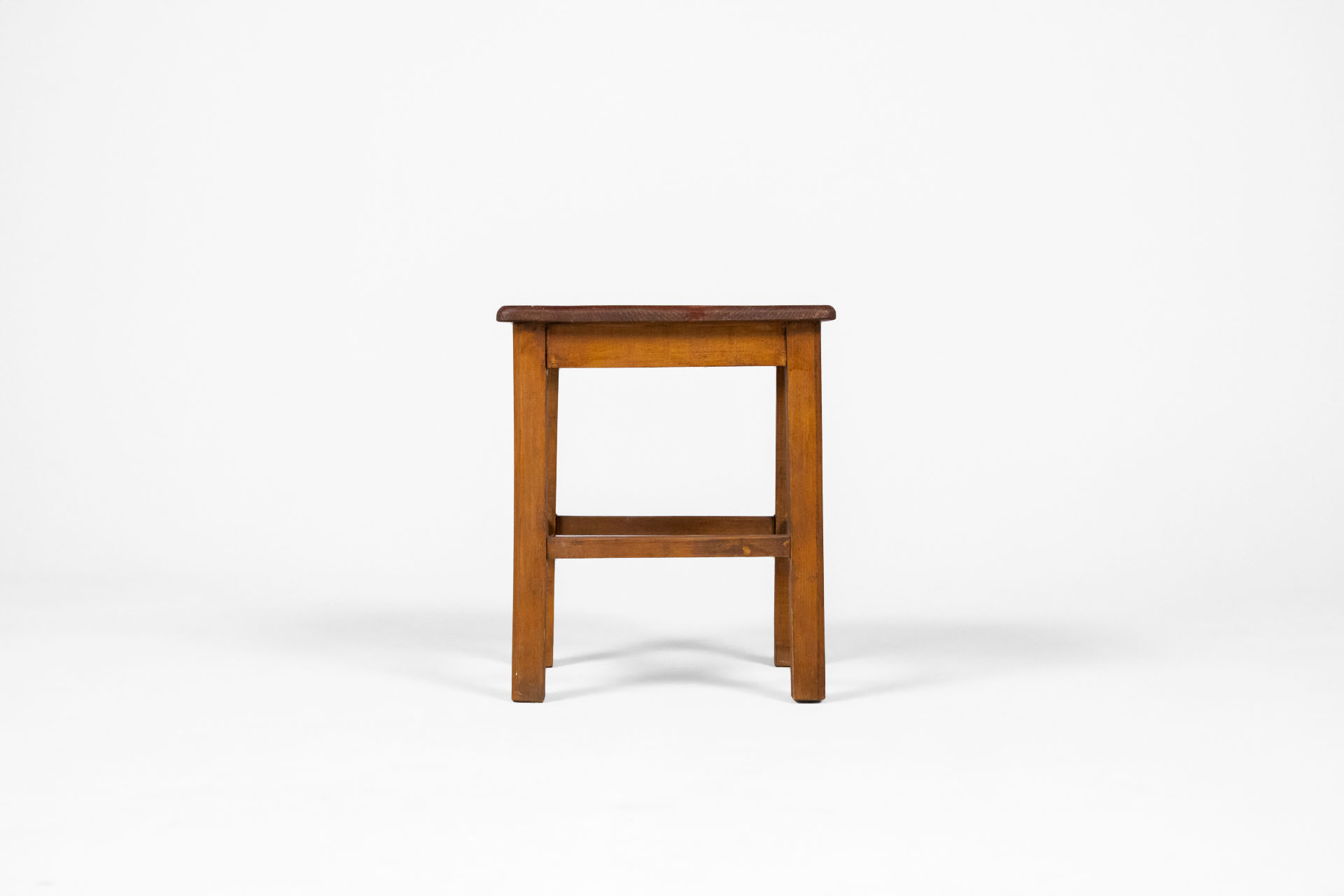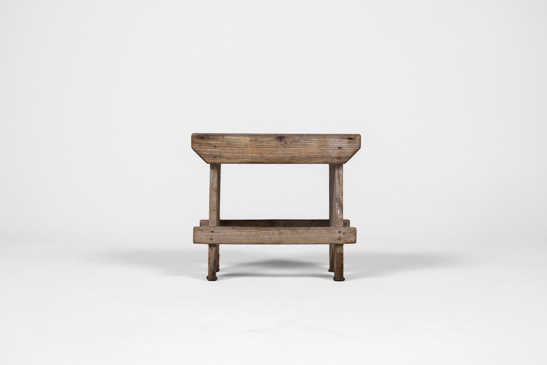 Egyszerű, rusztikus stílusú, négyzet alakú ülőke, masszív fából készült, természetes felülettel, amely a vidéki élet hangulatát idézi