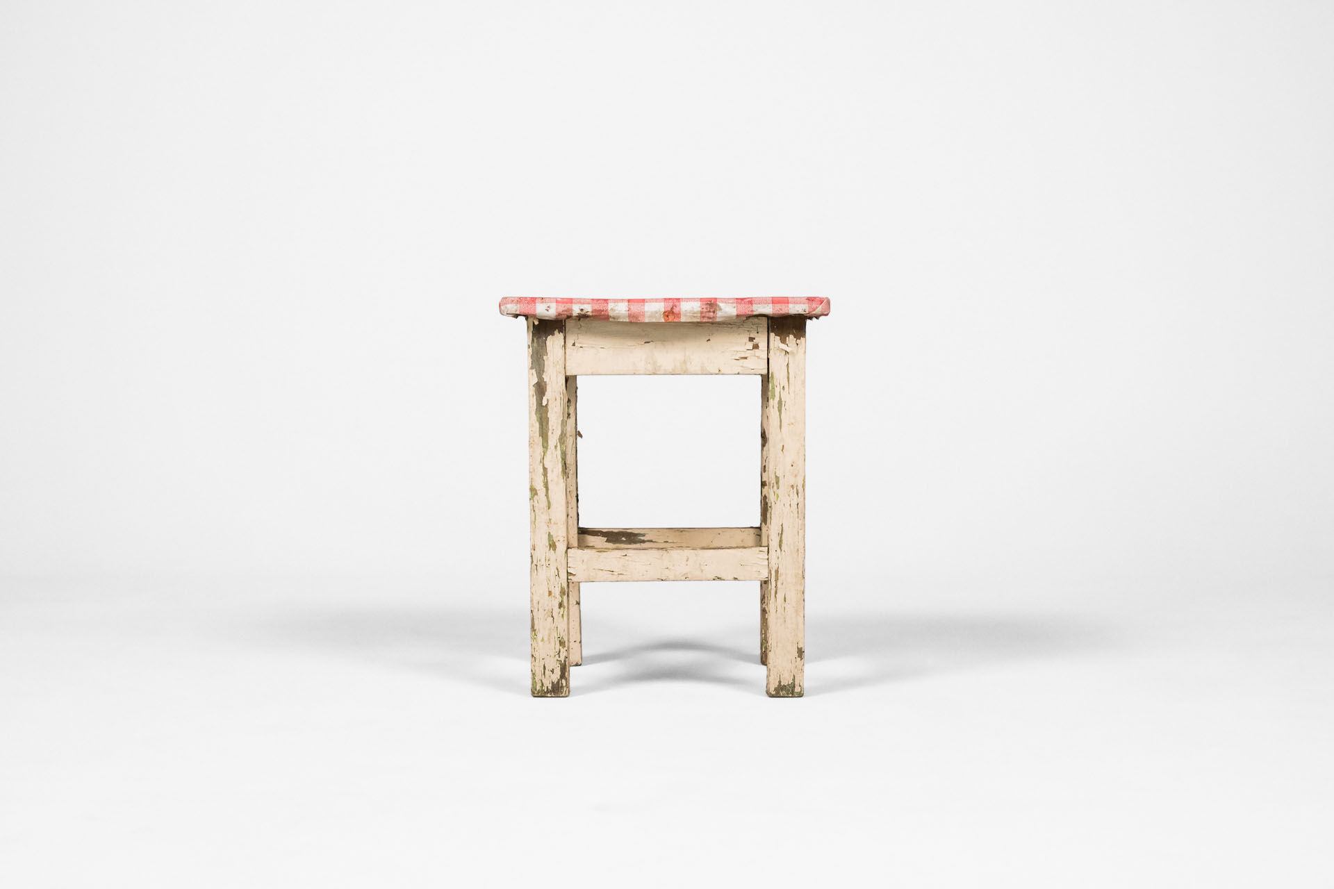 Kis méretű, vintage stílusú ülőke, amely egyszerű, négyzetes formájával és kockás mintázatú textil borításával otthonos hangulatot áraszt. A megkopott fehér festés és a rusztikus megjelenés időtlen bájt kölcsönöz,...