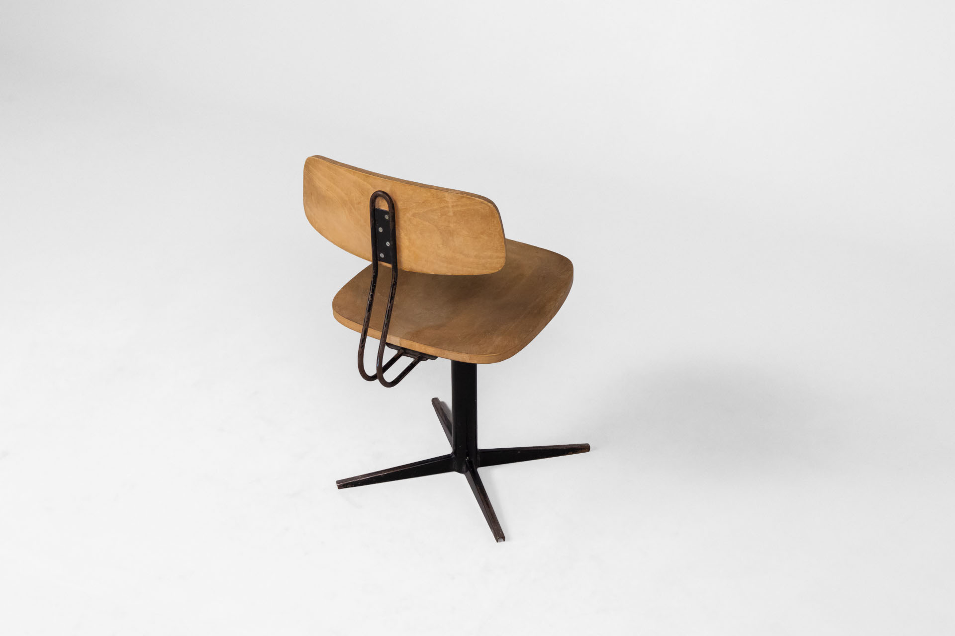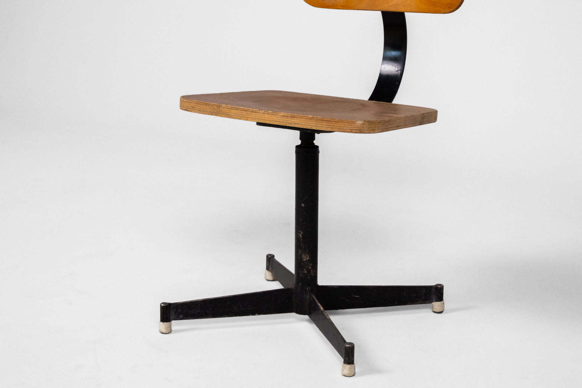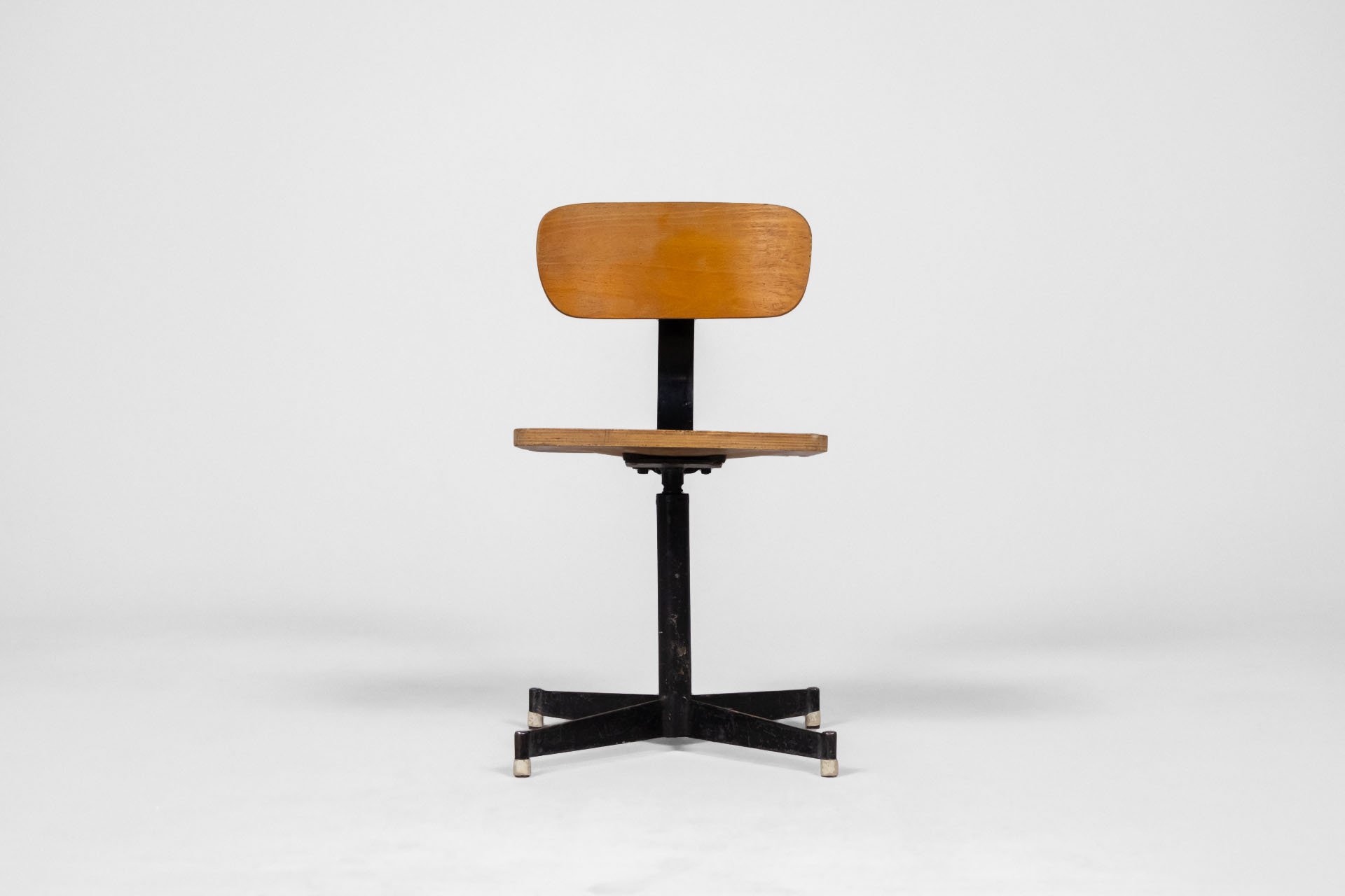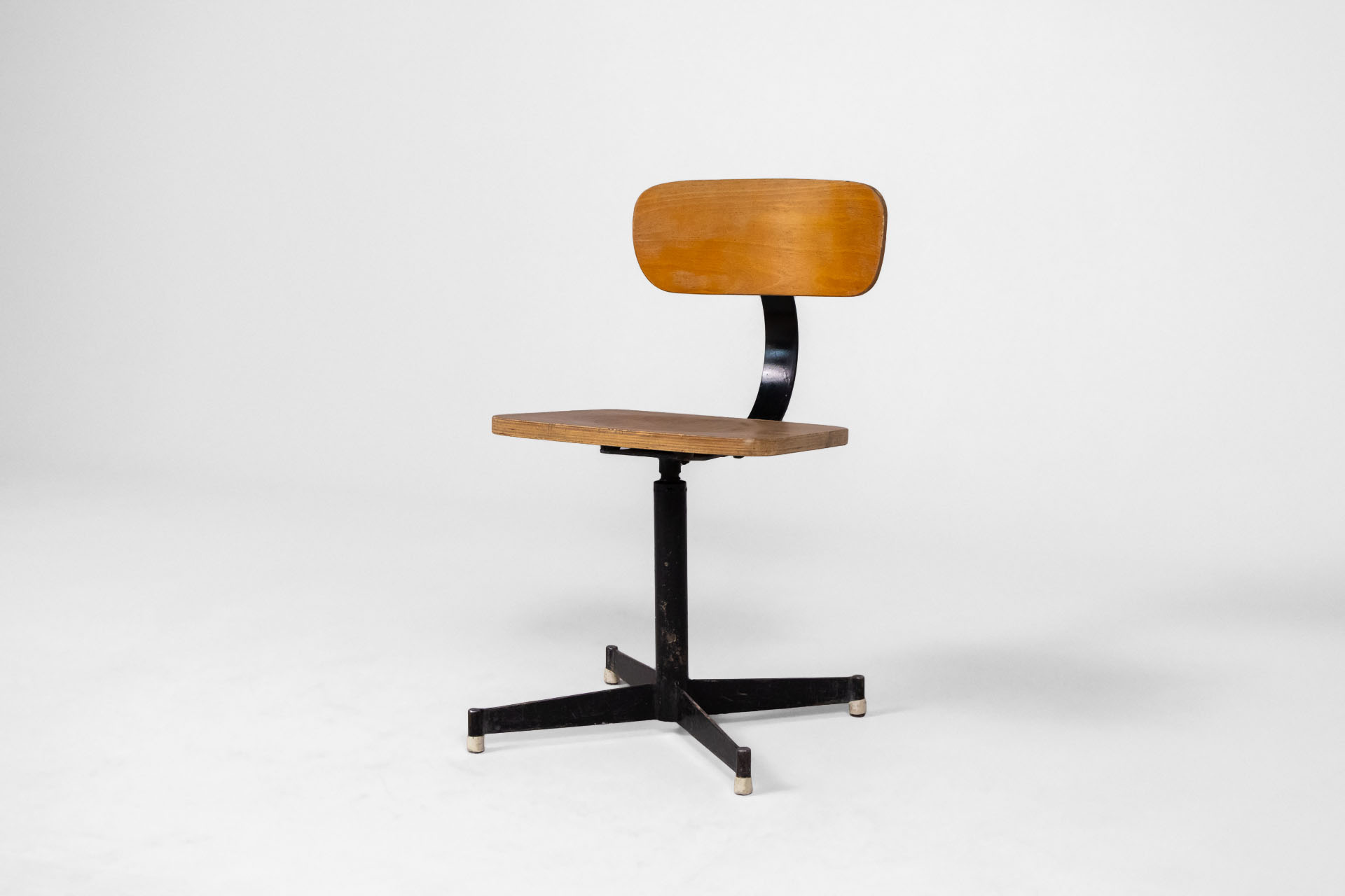 Modern, funkcionális forgószék, amely fém vázzal és ergonomikus, ívelt formájú fa ülőfelülettel rendelkezik. A szék színe meleg, természetes fa árnyalat, amely kellemes kontrasztot alkot a fekete fém lábakkal....